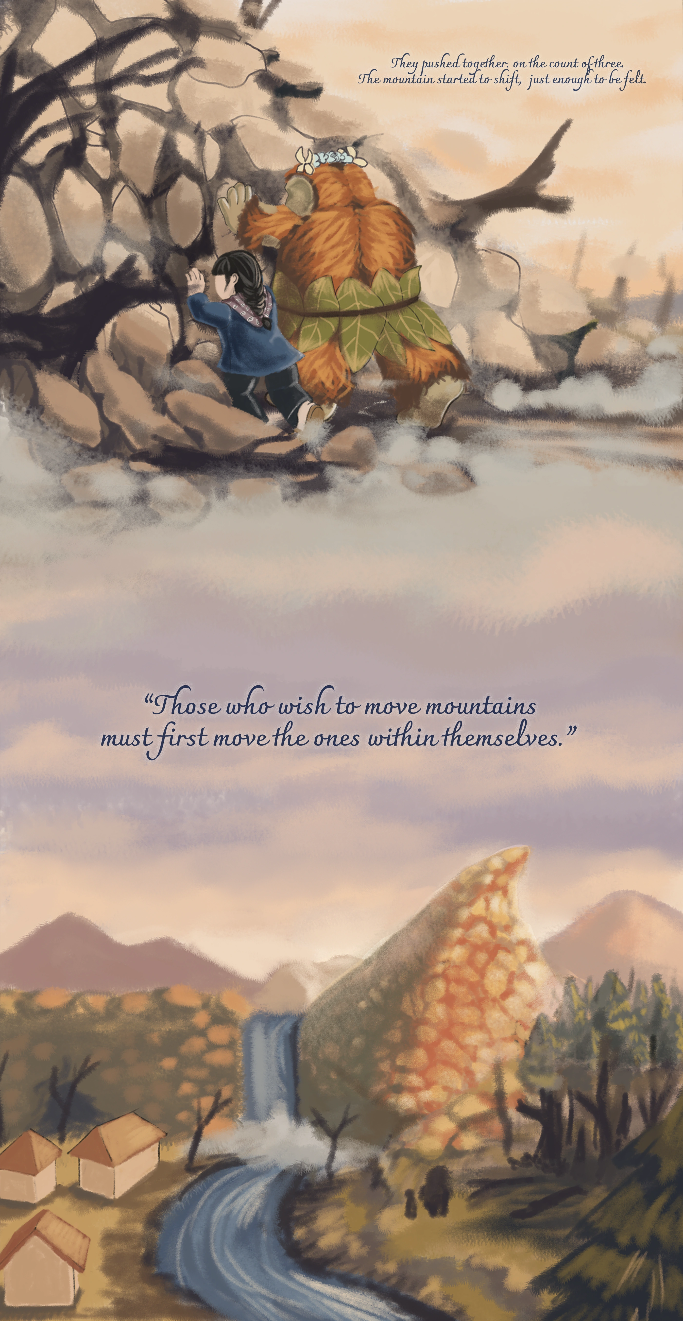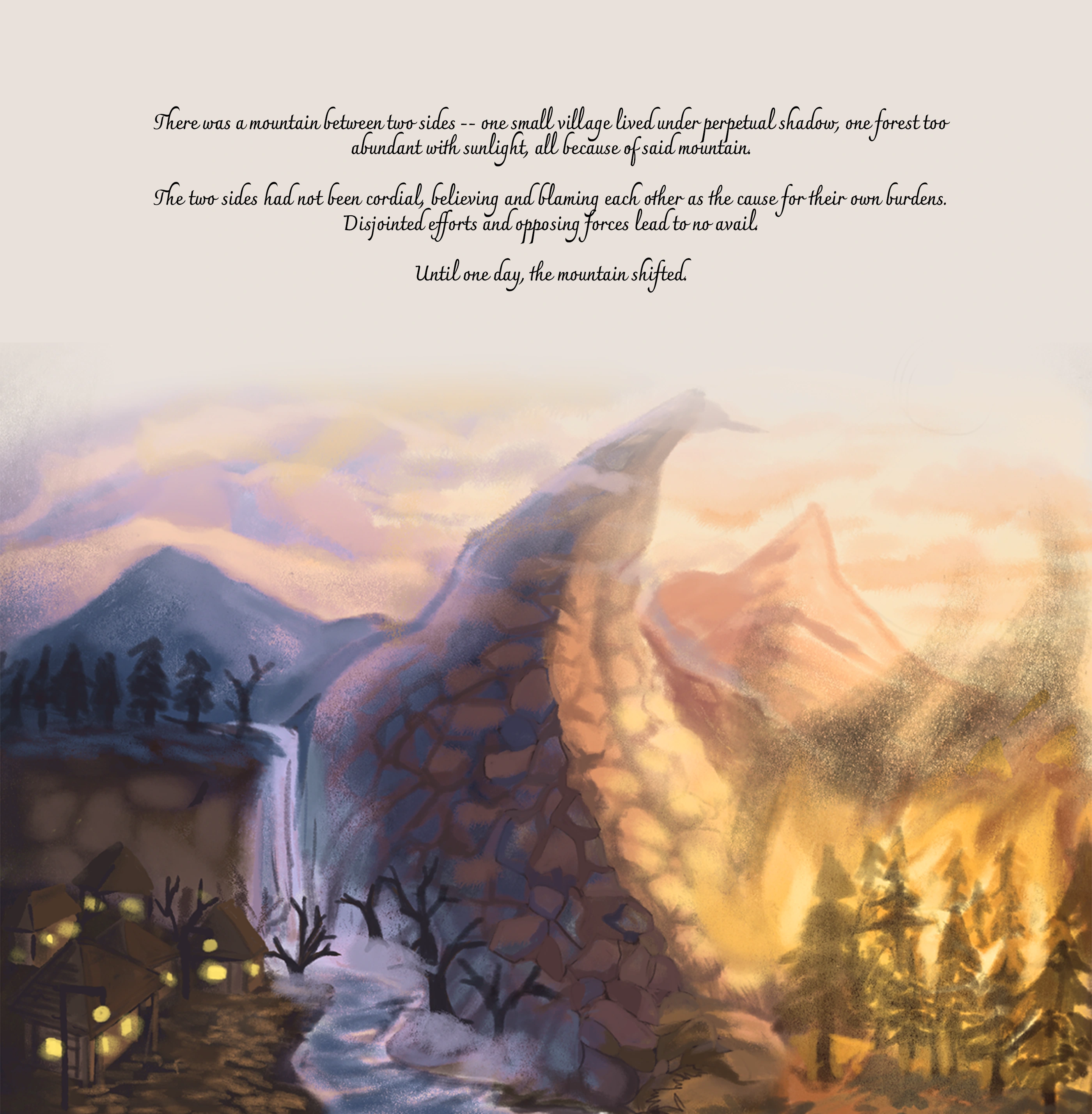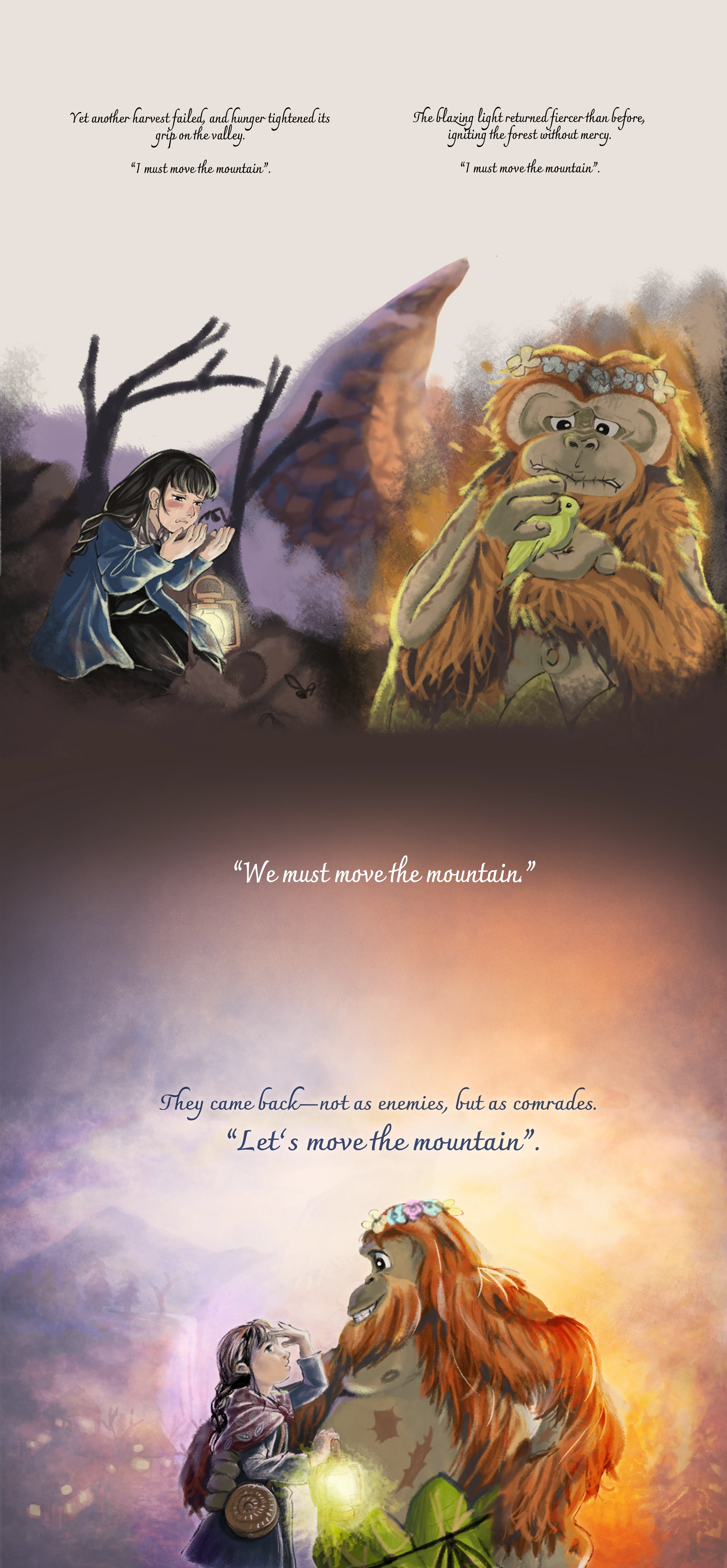 To Move a Mountain is an editorial illustration study developed as a storybook. The project explores the synergy between poetic visual metaphors and long-form storytelling, utilizing the book format as a medium where illustration functions as the primary narrator. Through a meticulous approach to character expression and atmospheric environment design, the storybook visualizes the internal conflict and emotional journey of two characters overcoming prejudice.