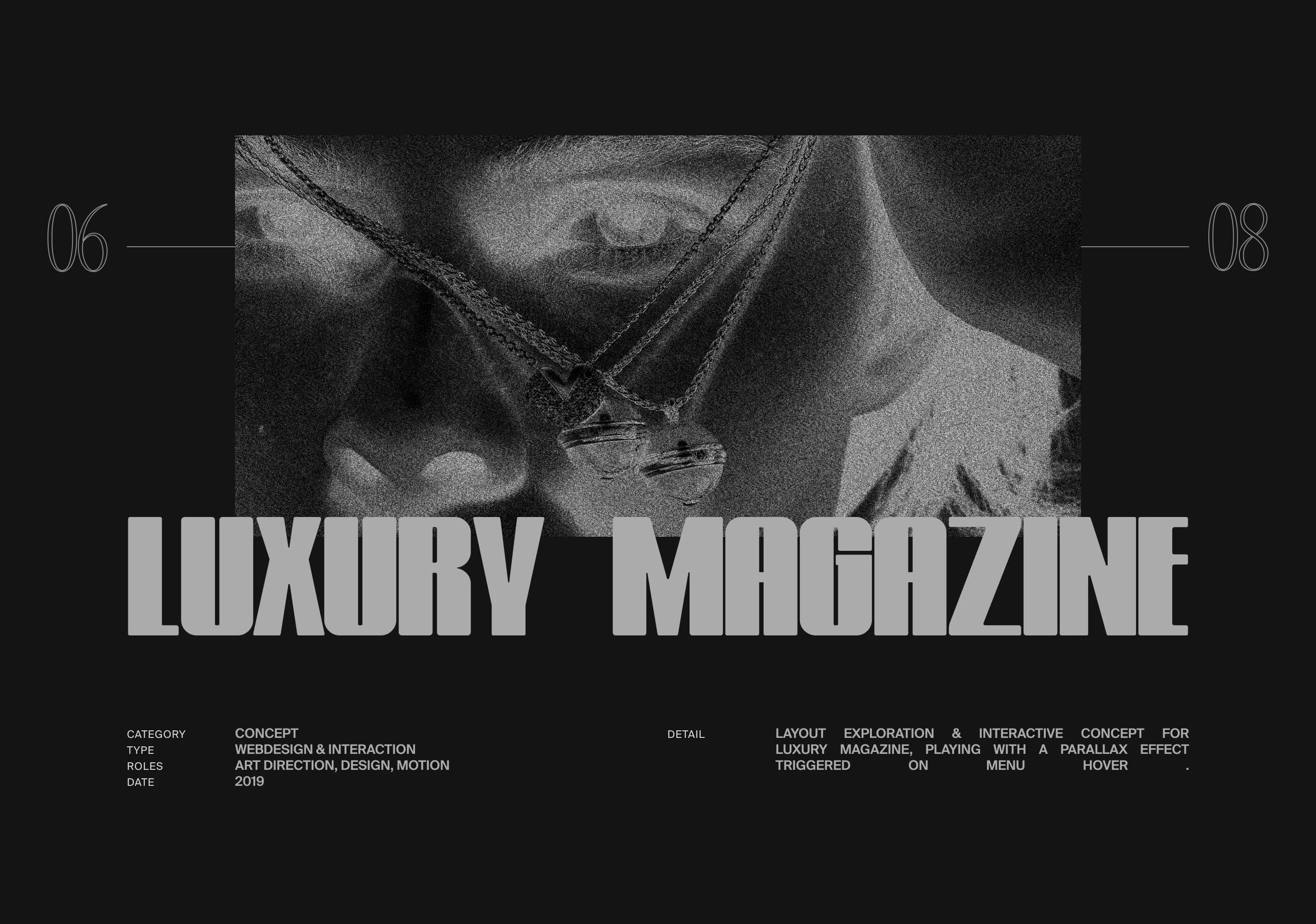 Layout exploration and Interactive concept for Luxury Magazine, playing with a parallax effect on Menu Hover.