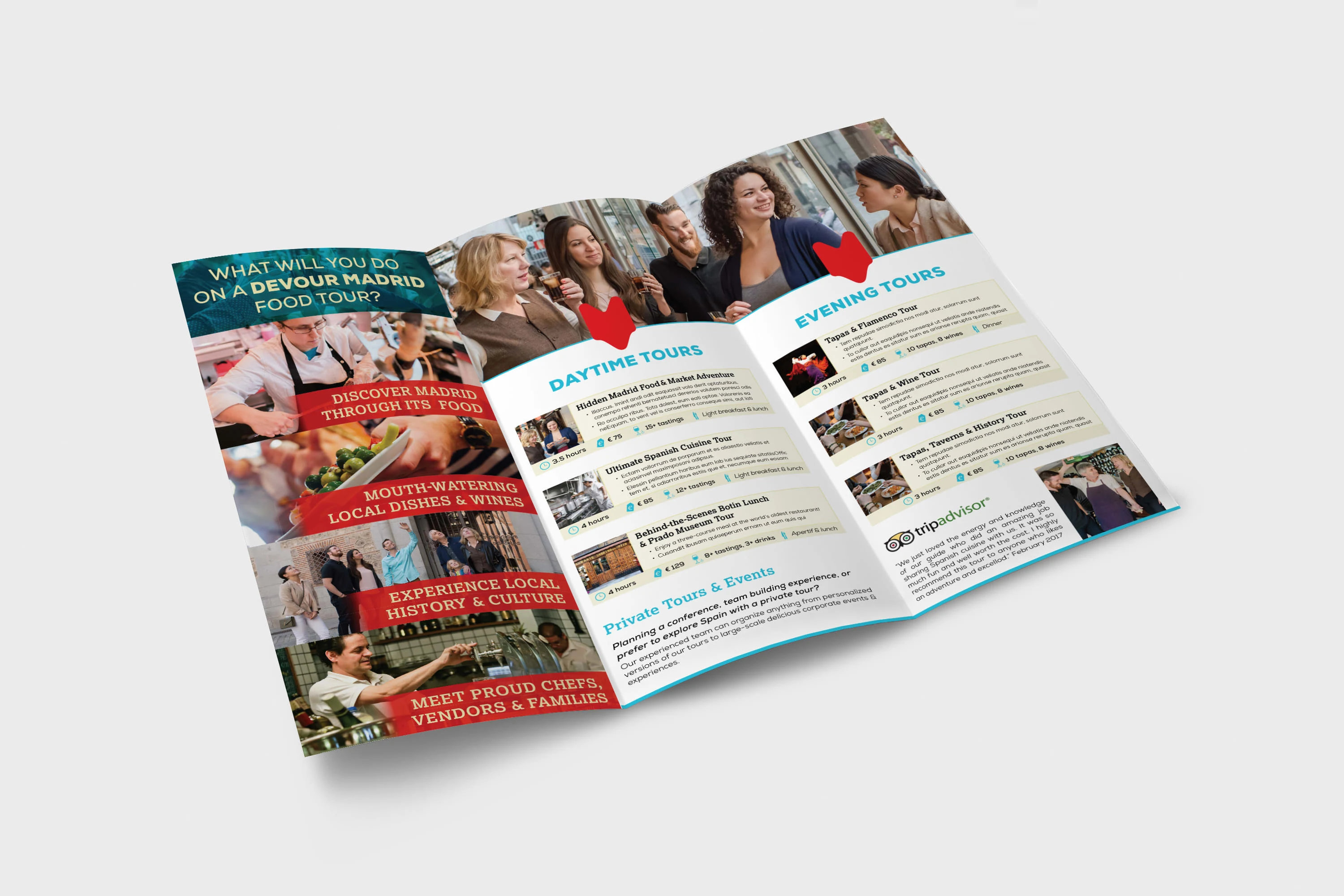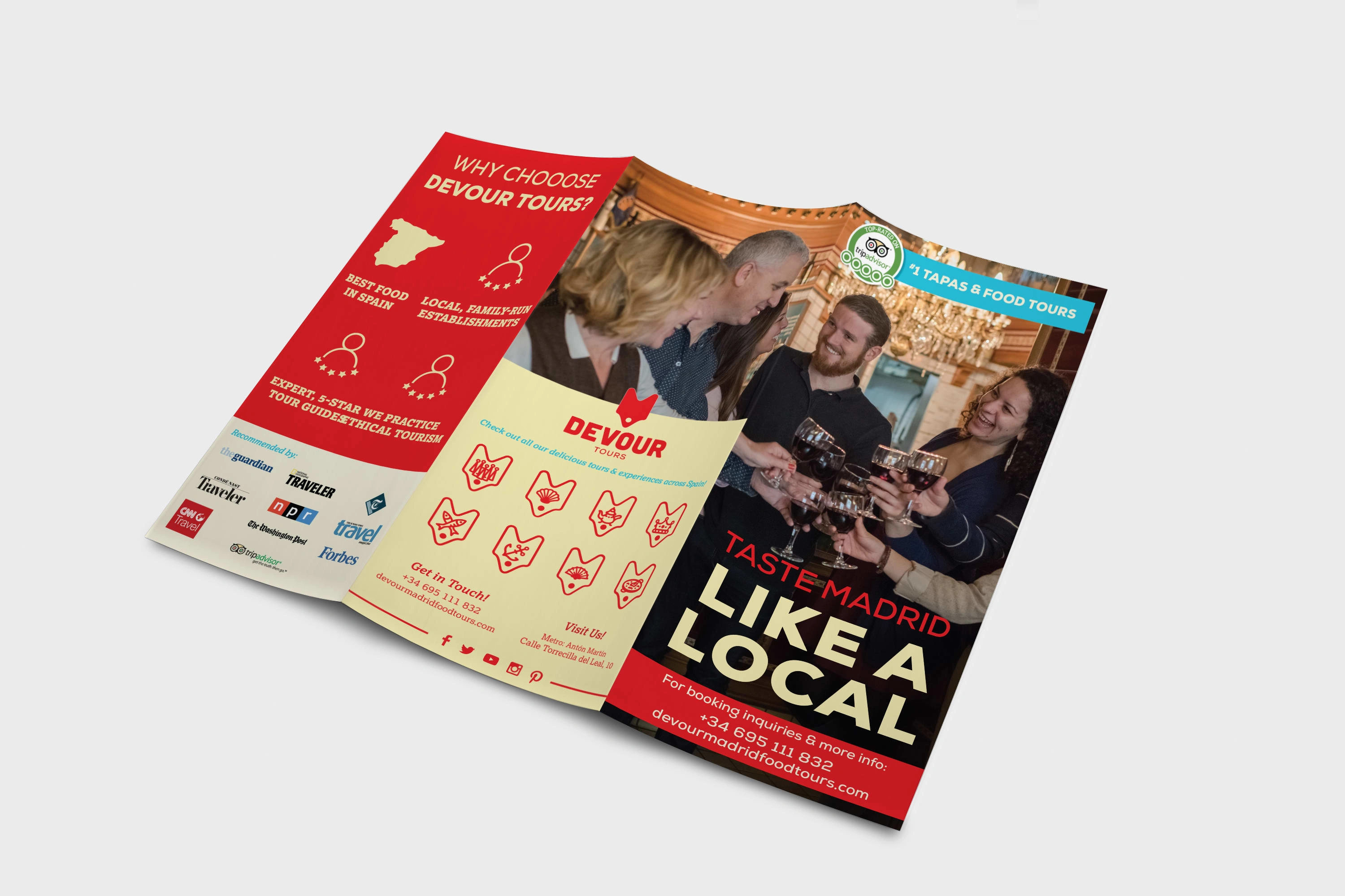 Trifold brochure created to hand out at local Madrid hotels. Designed and developed in order to create awareness about the company, adhere to brand, and educate about the company. The brochure acted as an important source in creating revenue, appealing to tourists visiting from around the world.