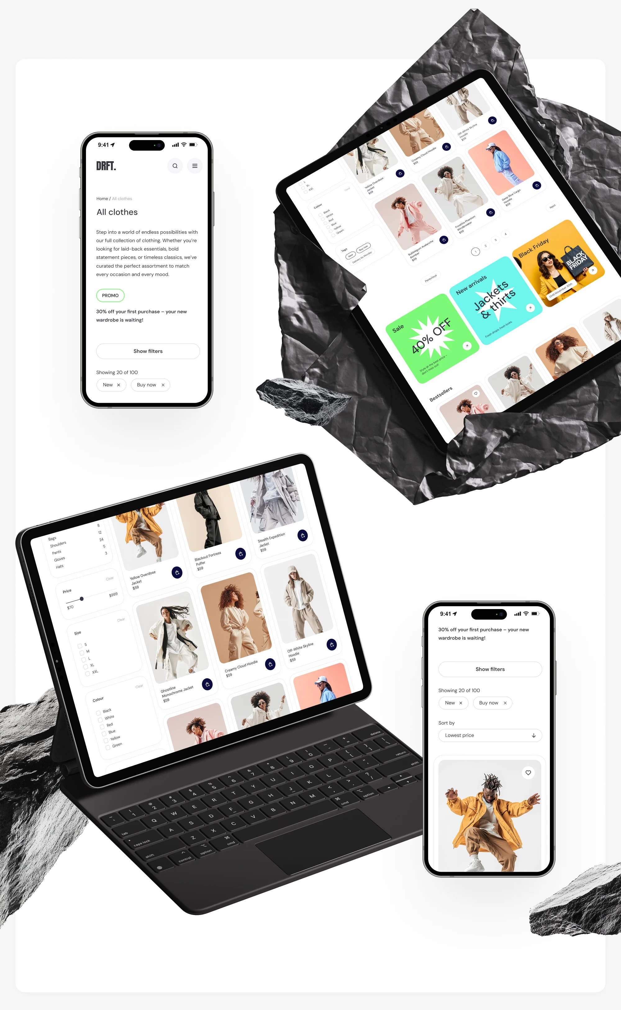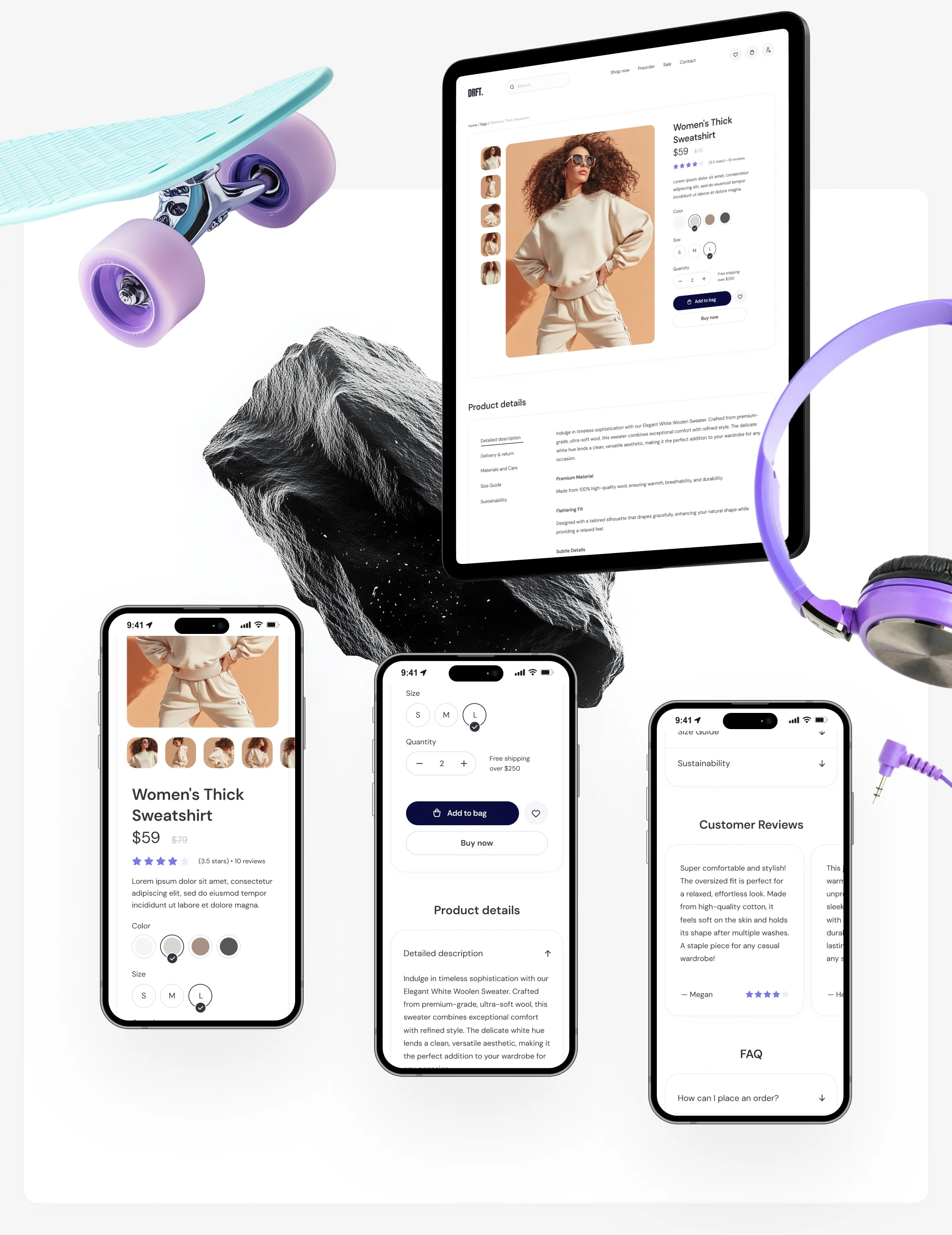 Ecommerce design for an online store offering skate/streetwear clothing. A combination of original design and an energetic wave of colors.