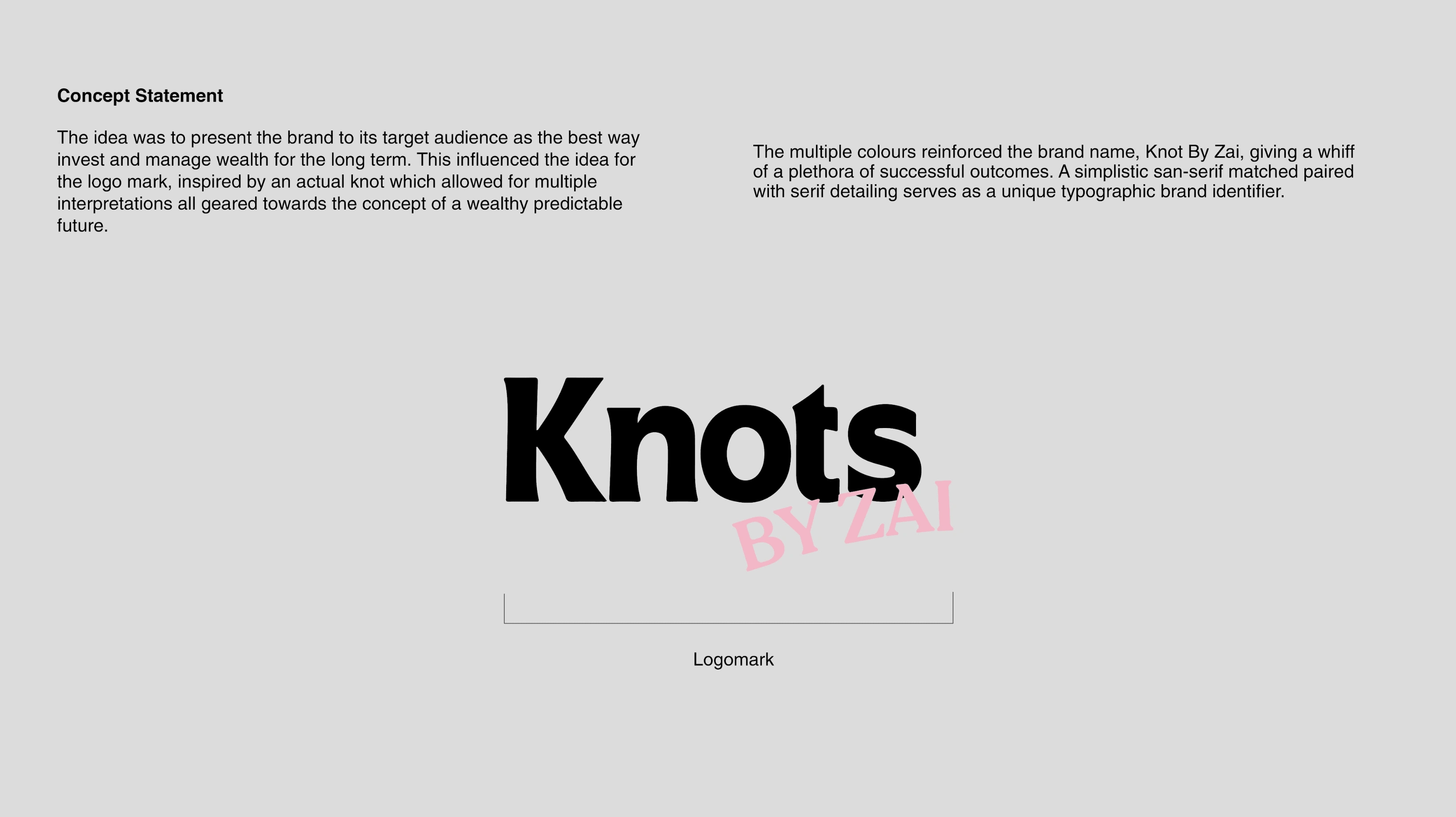 The multiple colours reinforced the brand name, Knot By Zai, giving a whiff of a plethora of successful outcomes. A simplistic san-serif matched paired with serif detailing serves as a unique typographic brand identifier