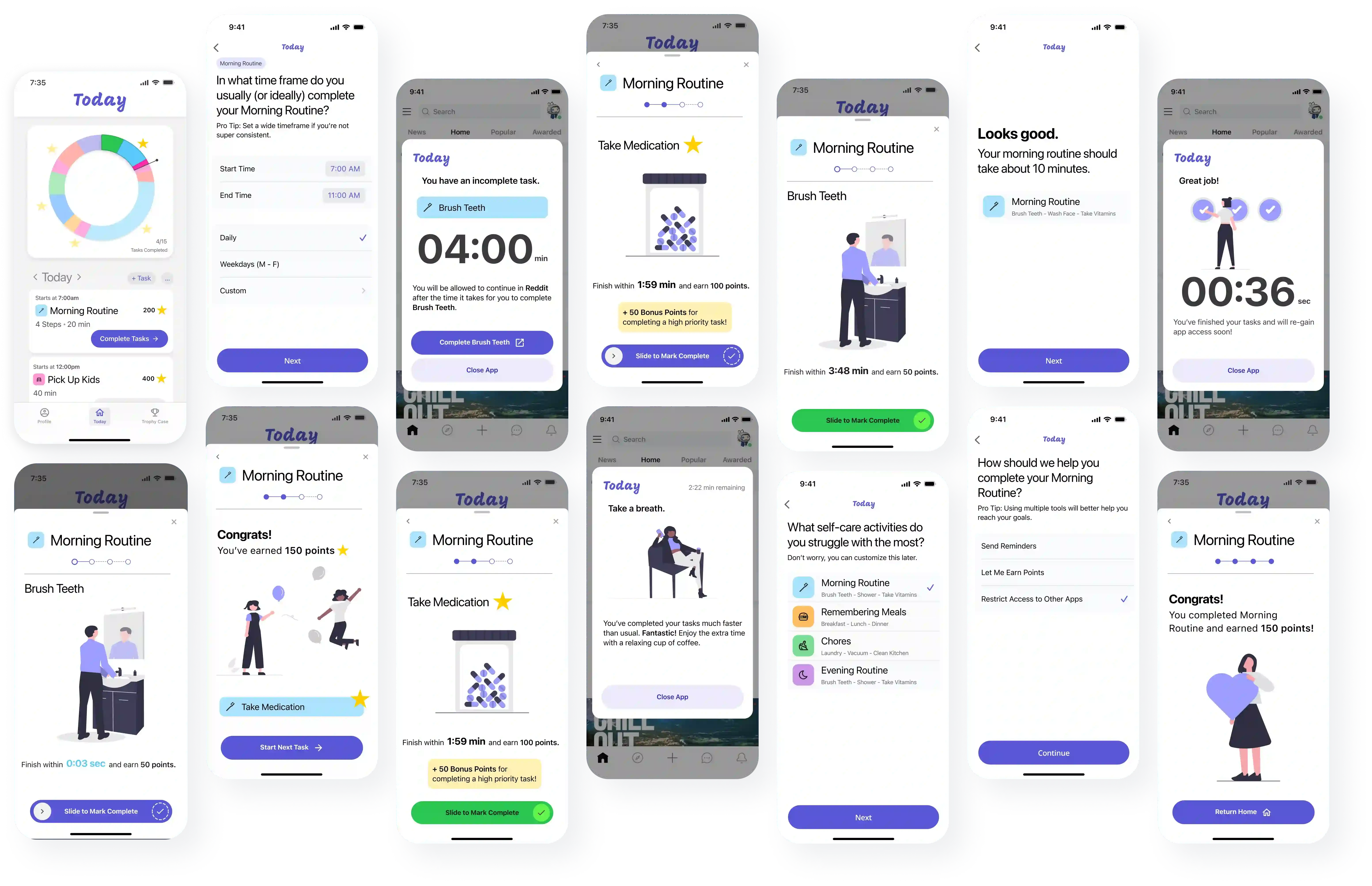 Today is an iOS mobile app designed to support young adults with ADHD complete self care tasks in their day by restricting access to addictive apps and redirecting their attention to incomplete self care tasks.