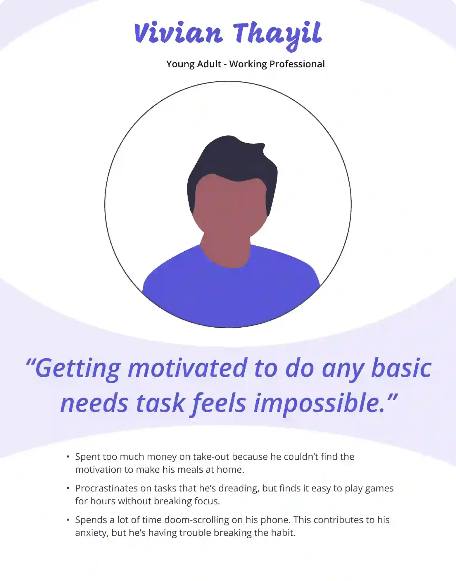 I still wanted to get a deeper understanding of the emotions and thought patterns our user base experienced around completing these self care tasks, so I conducted 5 Zoom interviews with young adults between ages 18 and 26 to ask about these habits.