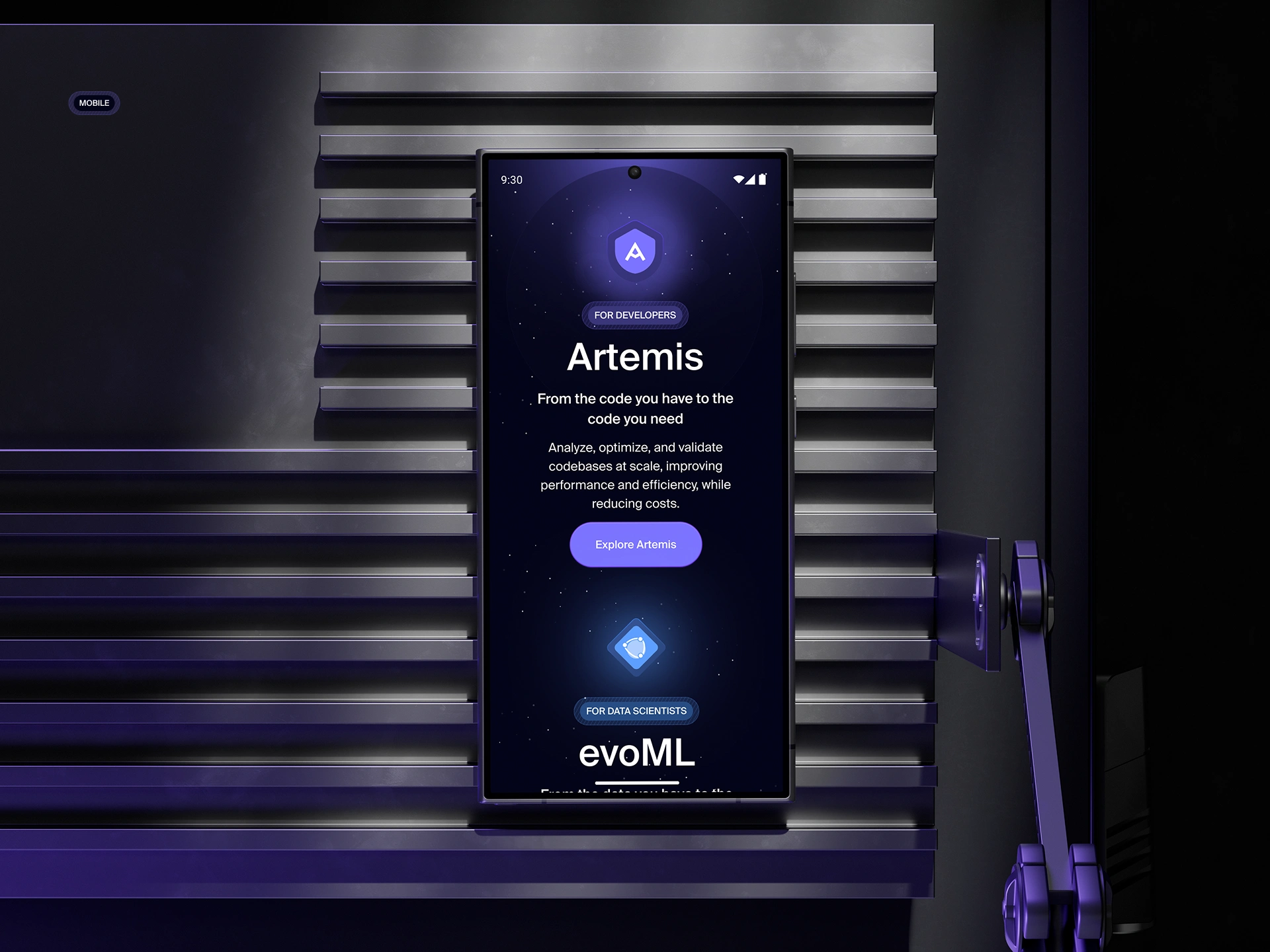 Artemis product page hero starts with a bold message and a video that explains the gist of it. Further down, the page takes you through an interactive journey, showcasing the features and advantages of this product that allows you to optimize your code for perfomance and efficiency, basically taking your from the code you have, to the code you need.