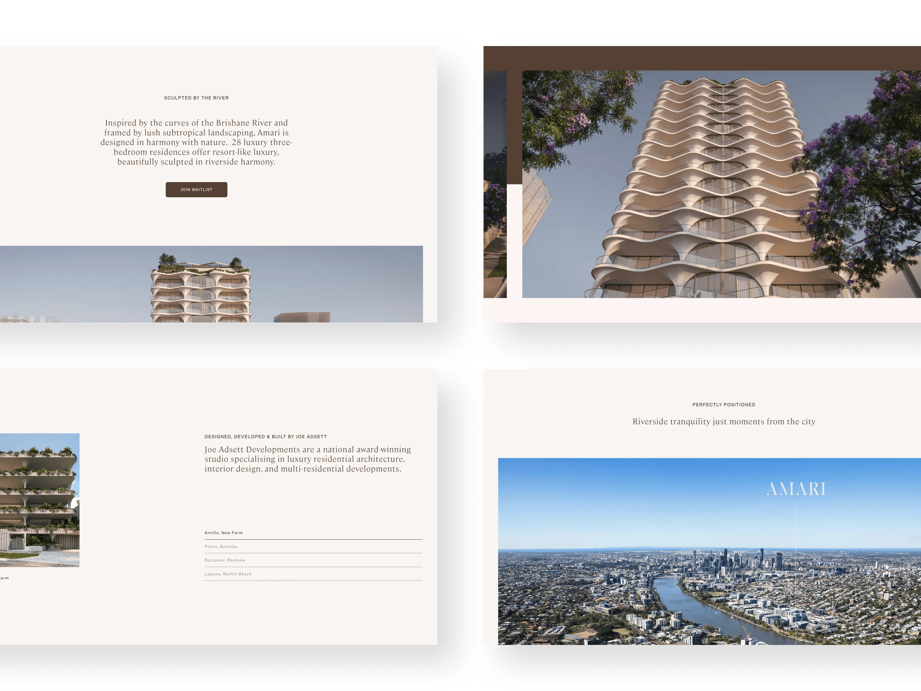 Ben Peters from Flux. I brought the vision to life in Framer, building a smooth, responsive experience that translates Amari’s organic architecture and resort-style calm into a timeless digital showcase of riverside living.