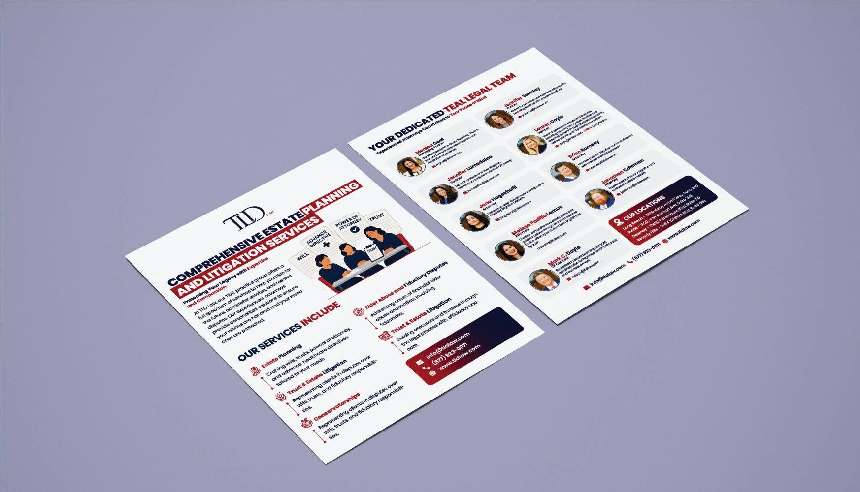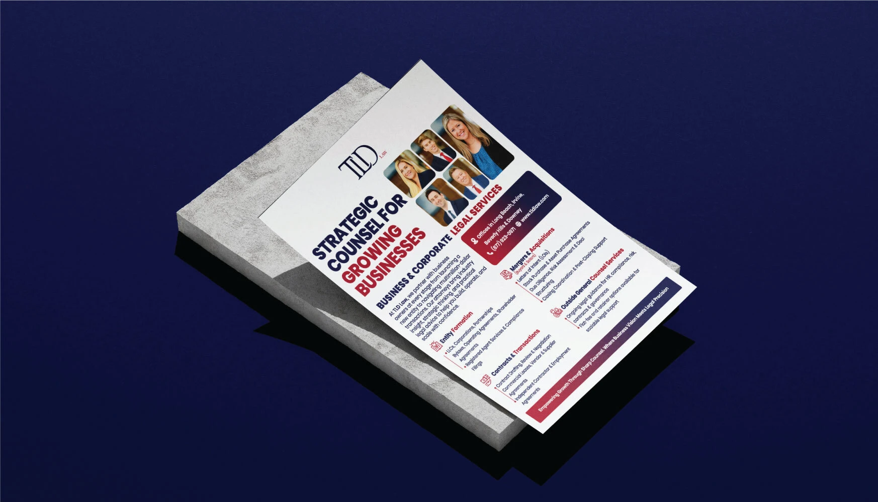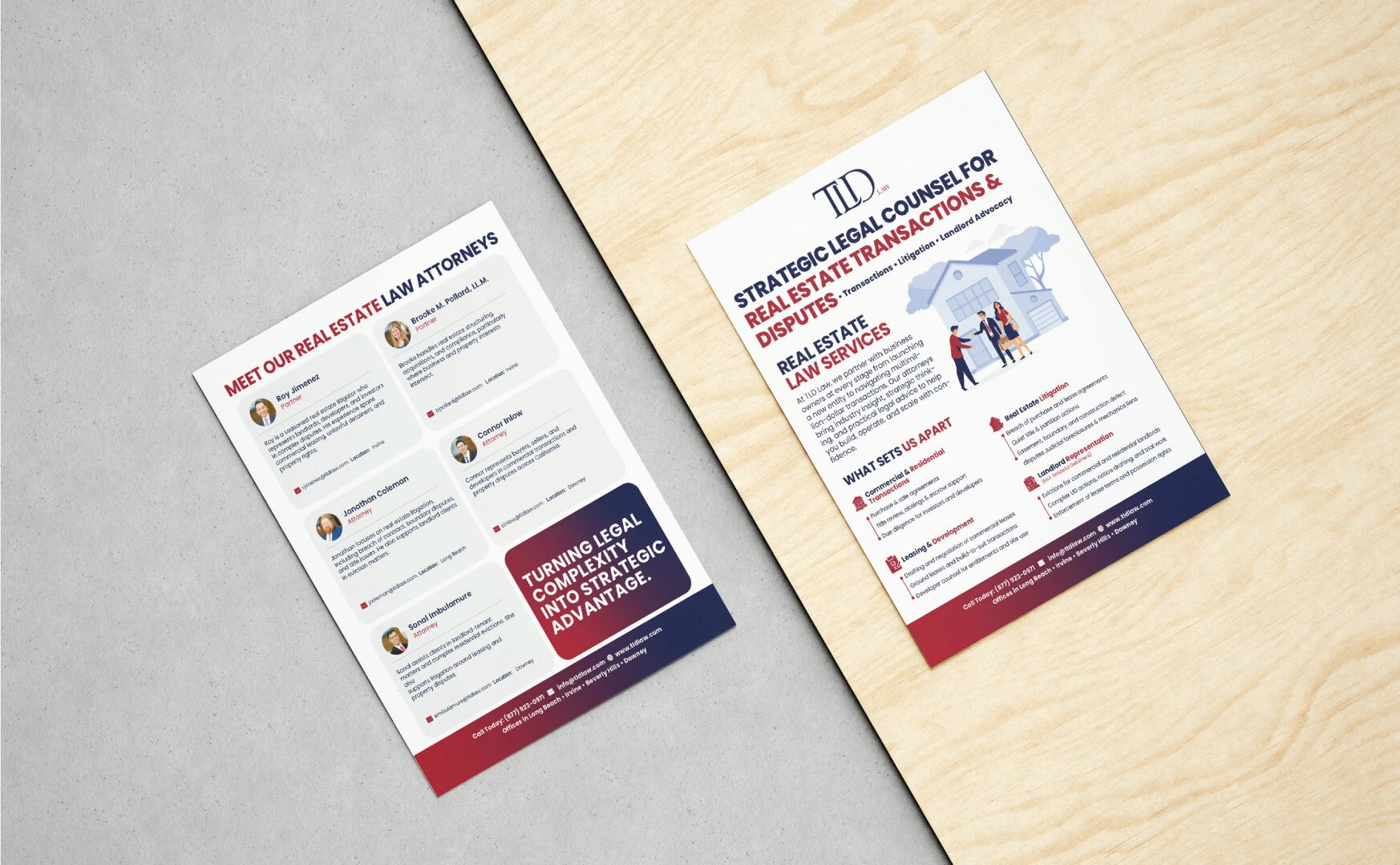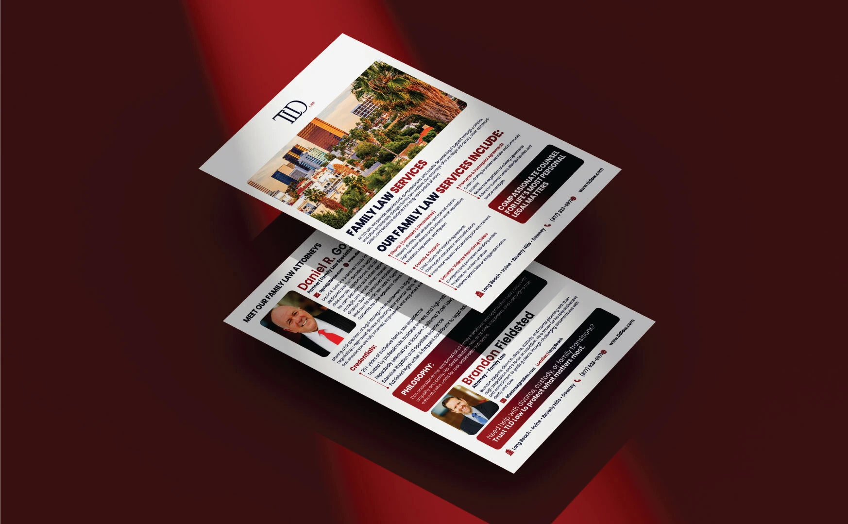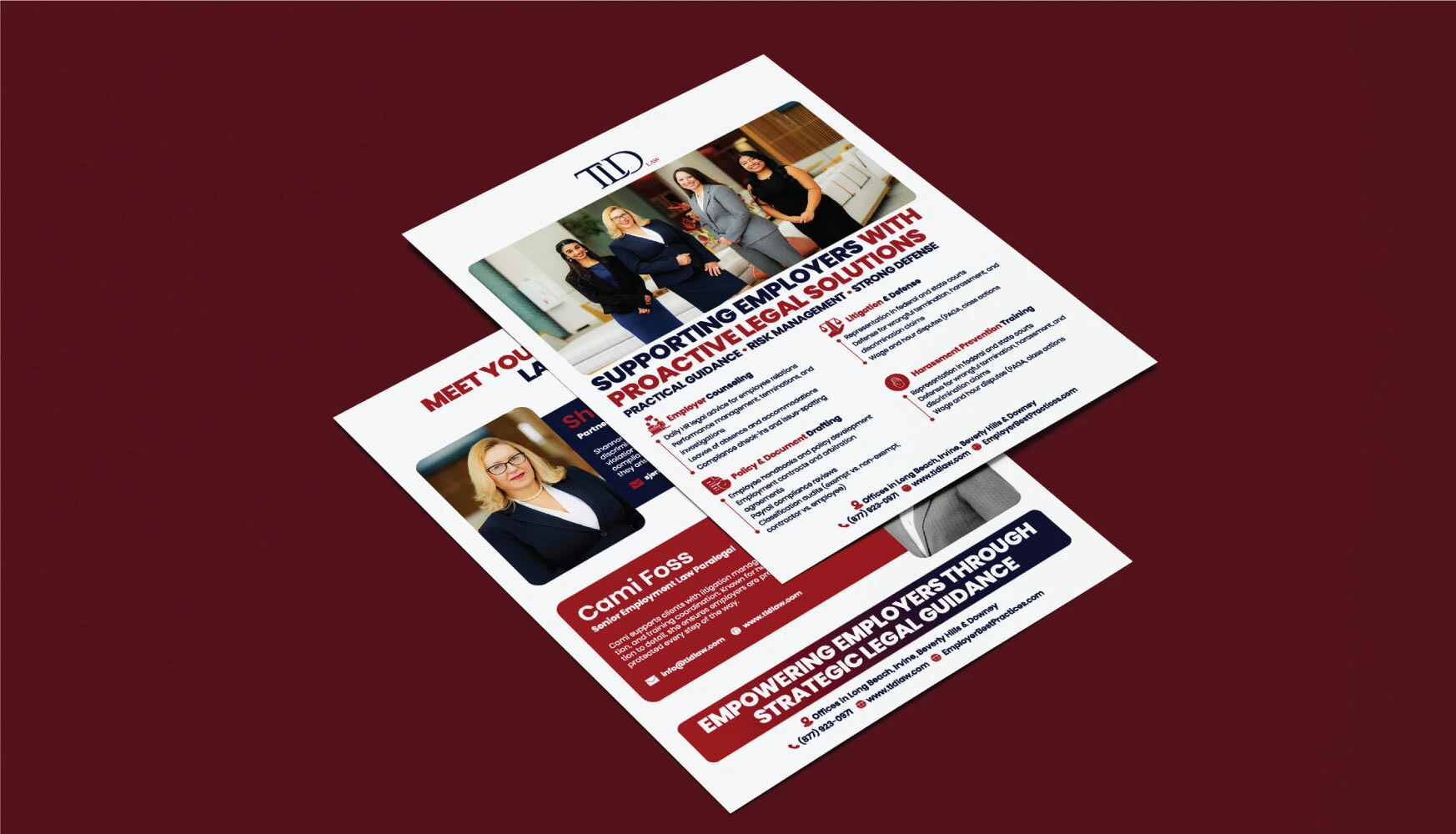 Designed a cohesive set of six professional flyers for TLD Law, a prominent Southern California legal firm. Each flyer was tailored to highlight TLD’s core practice areas, office locations, and long-standing commitment to trust and legal excellence. The designs ensured brand consistency and high readability by utilizing a bold red, white, and blue color scheme, clean typography, and structured layouts. Final deliverables were optimized for print and client-facing marketing use, helping elevate the firm's visual identity.