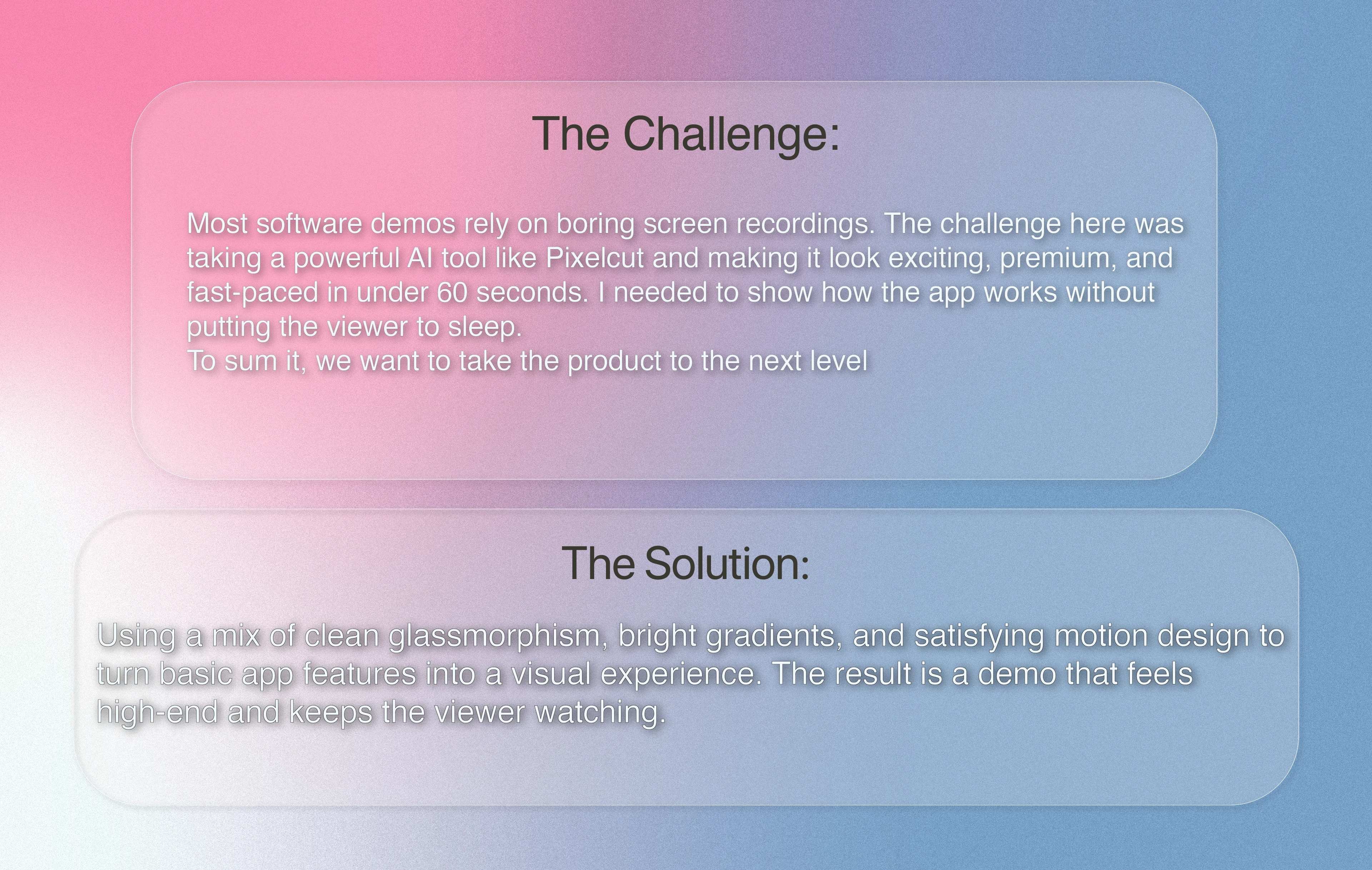 Standard SaaS ads are boring. I rebuilt Pixelcut's UI with snappy motion & frosted glass to hold attention. Need high-end motion video? Contact Mono Visuals.