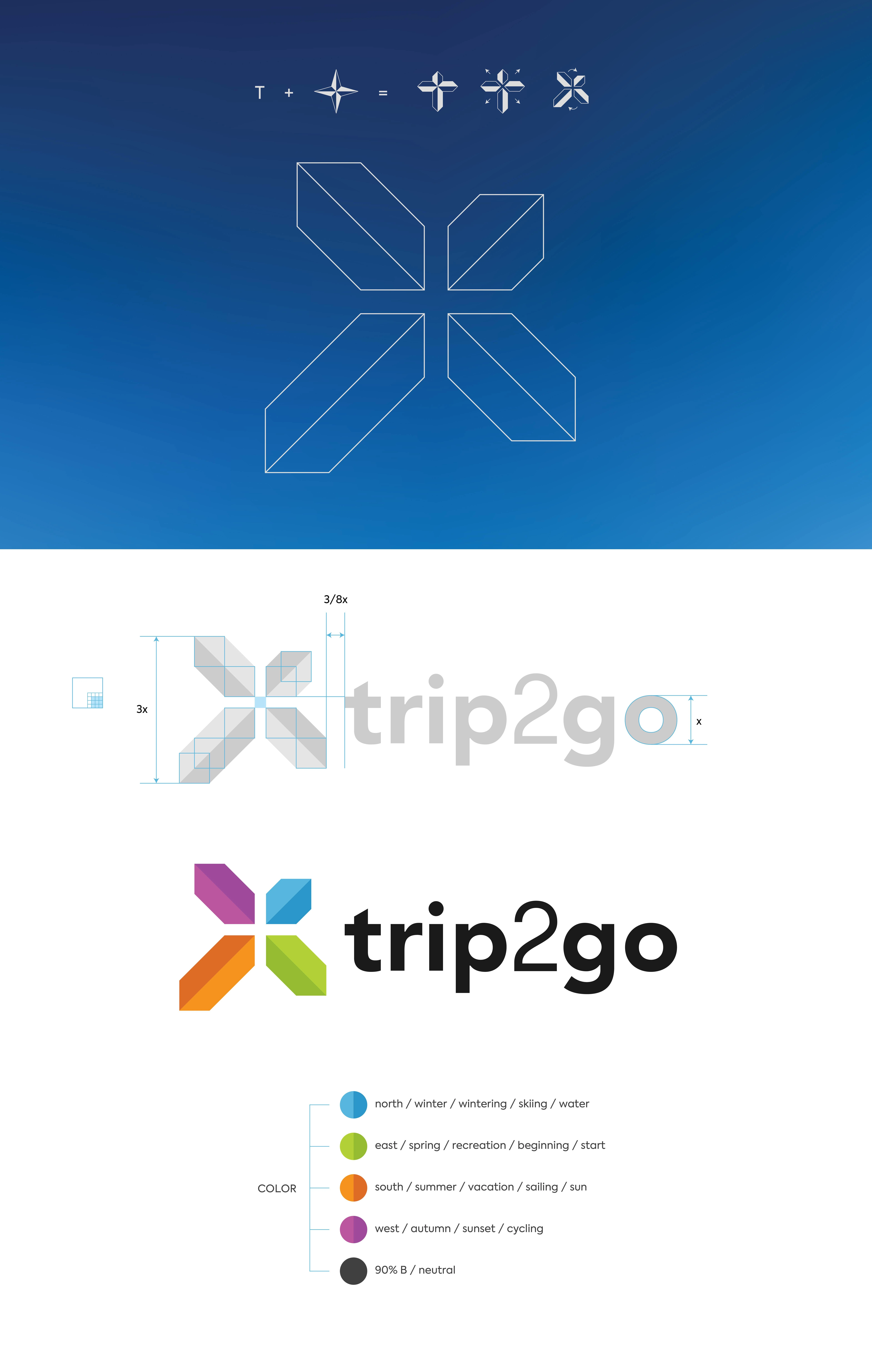 Trip2go is one of the brands owned by Sve za sport d.o.o., a travel agency from Zagreb. The agency provides active tourism services that include, among other things, skiing, boating, and cycling. The agency believes that the best way to discover Croatia is through getting to know the people, the landscape and the gastronomy. They actively offer it all. The visual identity of the Trip2go brand comes from the name of the agency and refers to the word "trip" (the letter "T") or "travel", and a visual representation of the compass that is associated with the choice of destination and arrangement (in the name of the agency - "2 go"). The rotated sign of the logo and its construction are associated with different distances of places to which one travels (closer/further/similar).