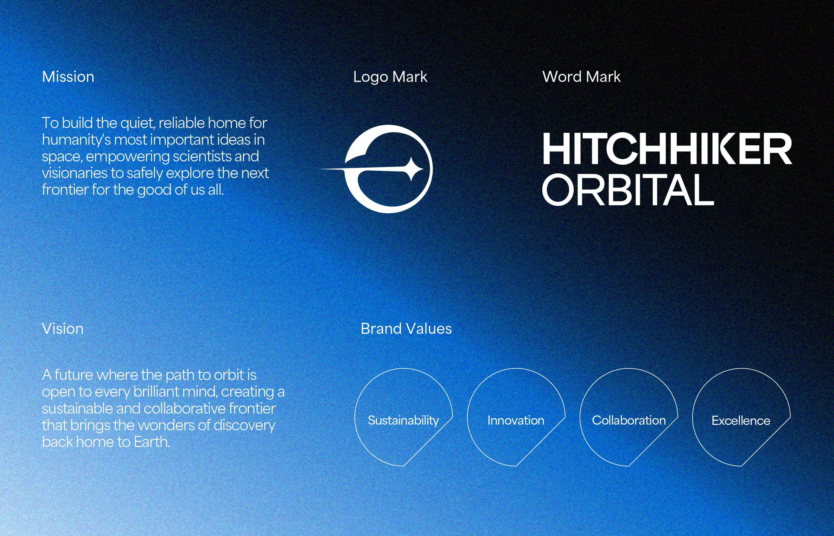 We created a brand identity that reflects their values of adaptability, precision, and long-term vision. The design emphasizes modularity and quiet strength, positioning Hitchhiker Orbital as a trusted partner in shaping meaningful activity beyond Earth.