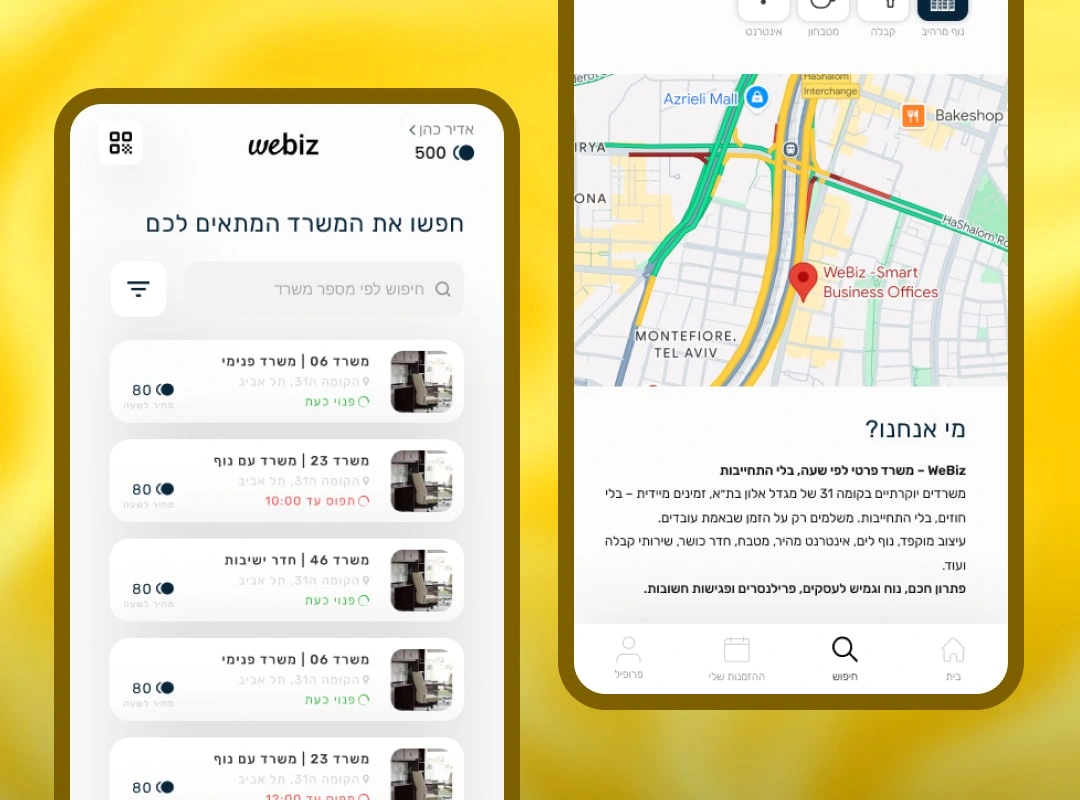Webiz is a smart office space platform that enables professionals and companies to book premium offices and meeting rooms by the hour without long-term contracts. Located in a central business district, Webiz combines physical workspace infrastructure with a fully digital booking and access system. The platform allows users to discover available offices, book instantly using QR codes placed on-site, manage shared company wallets, and control office devices such as doors, electricity, and air conditioning — all from a single mobile application.
