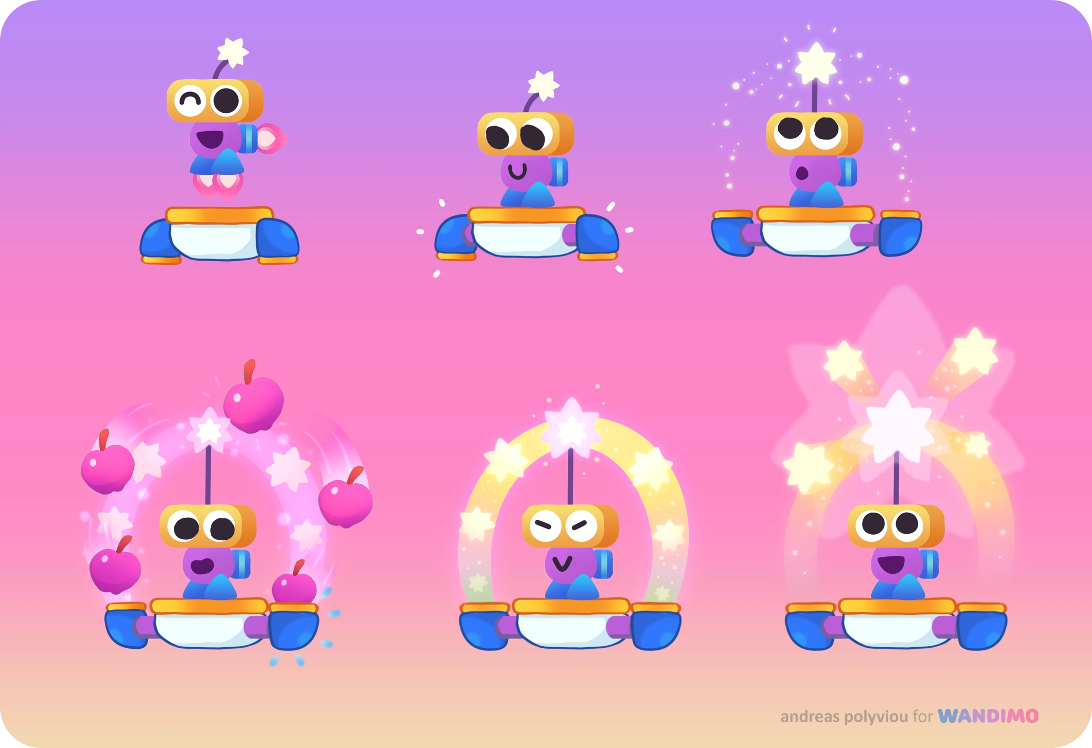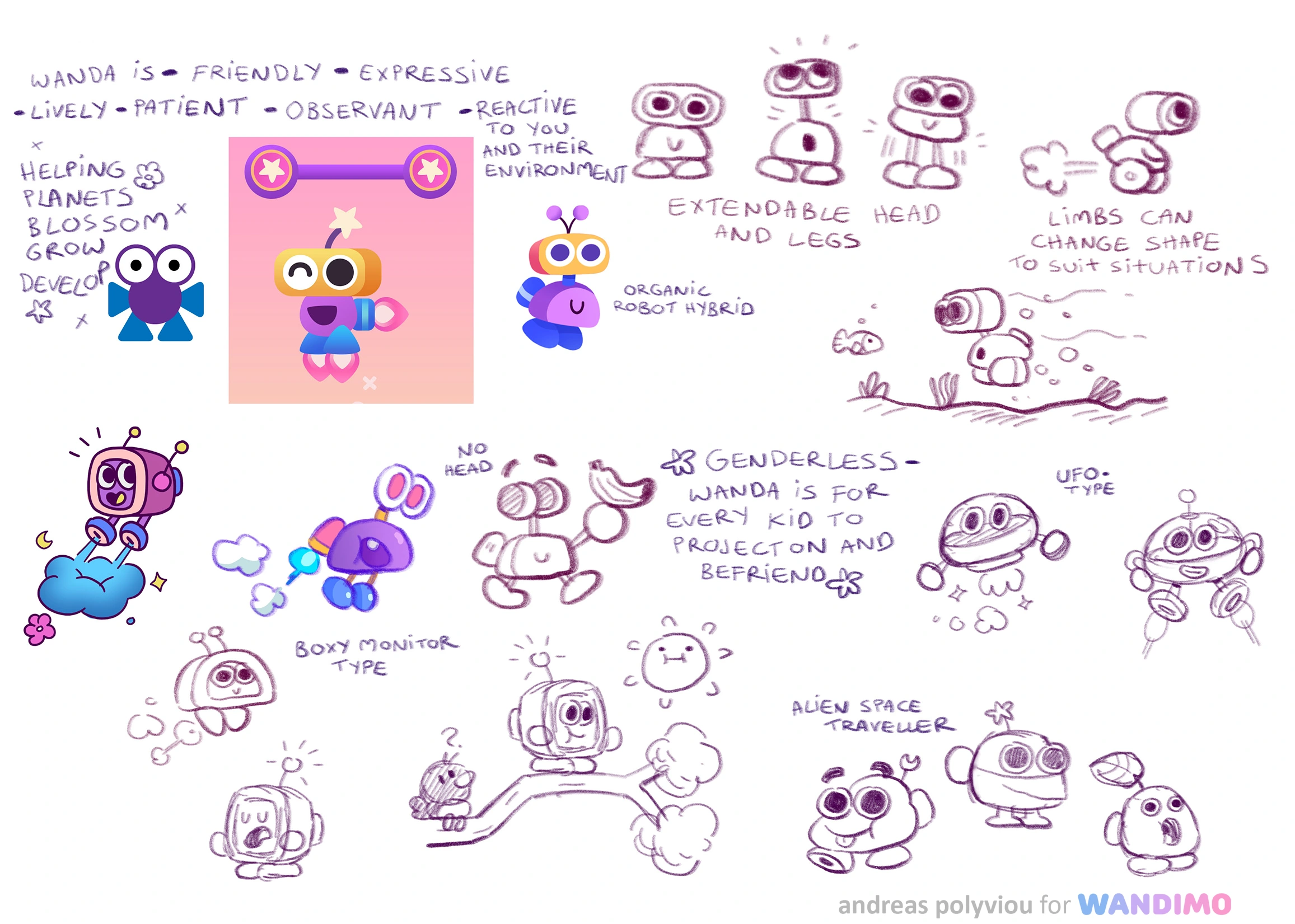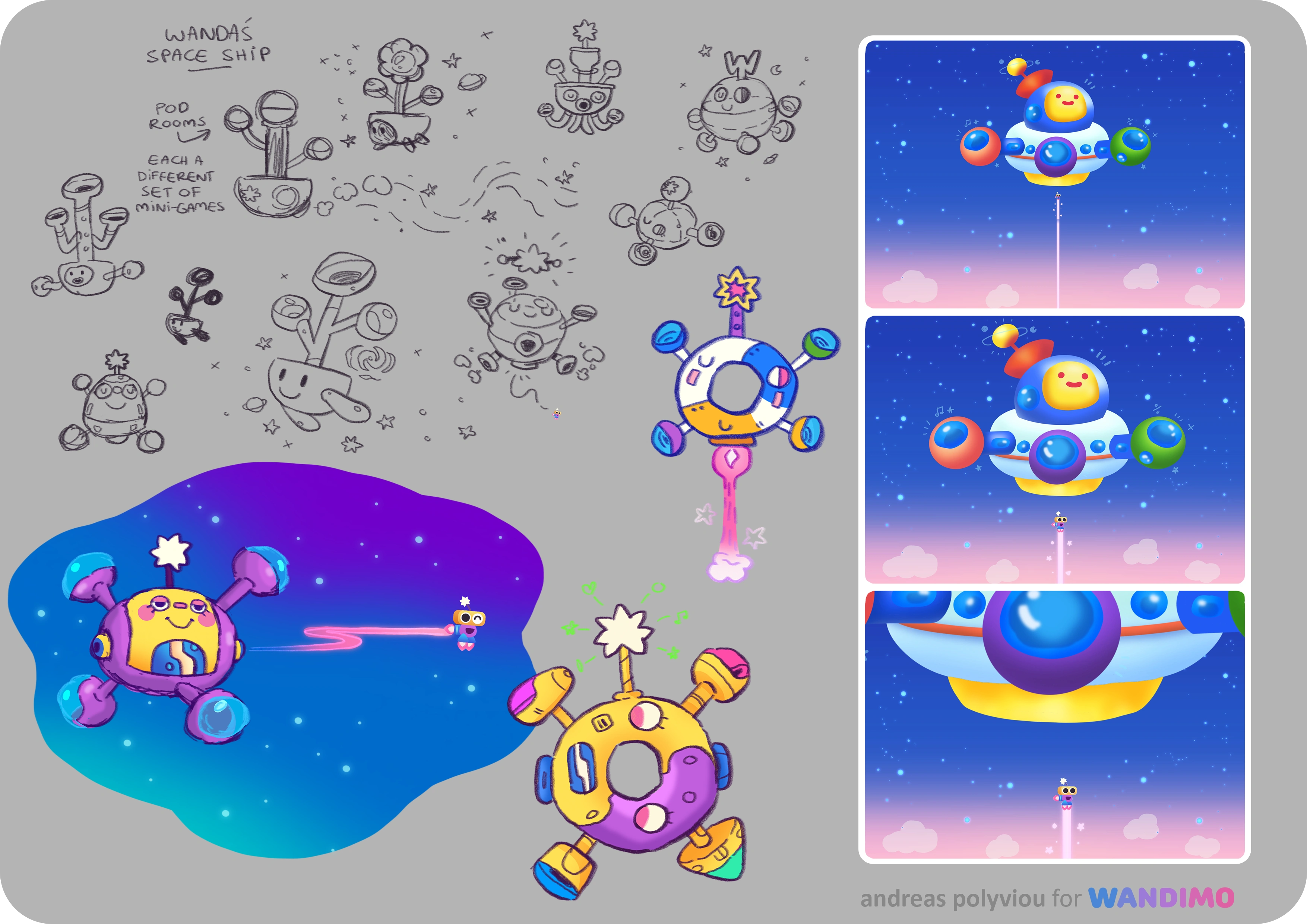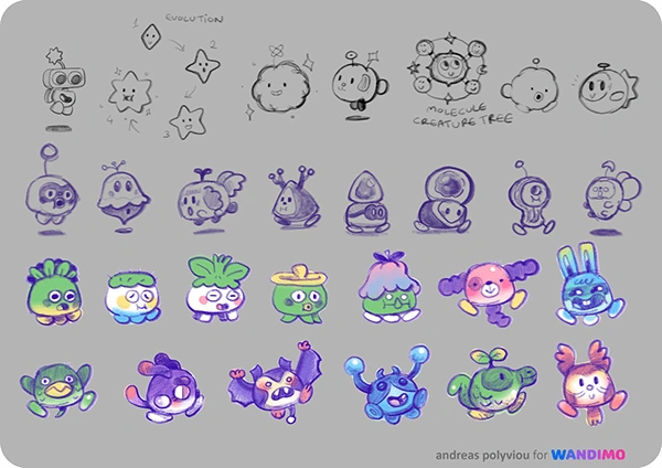 Wanda is a little helpful alien being, and the main character of the game, through whom the player interacts with the world! Here you can see their development from the top left, to final in-game assets and animations below.