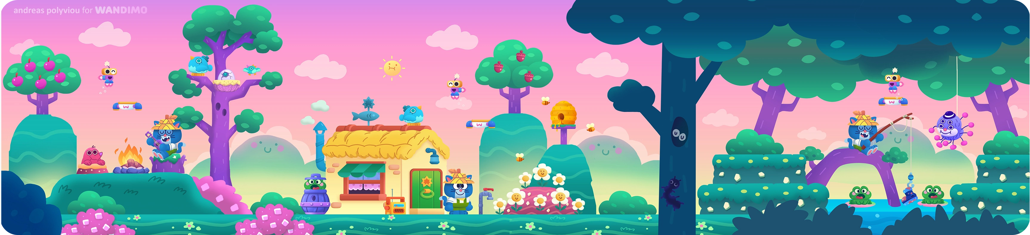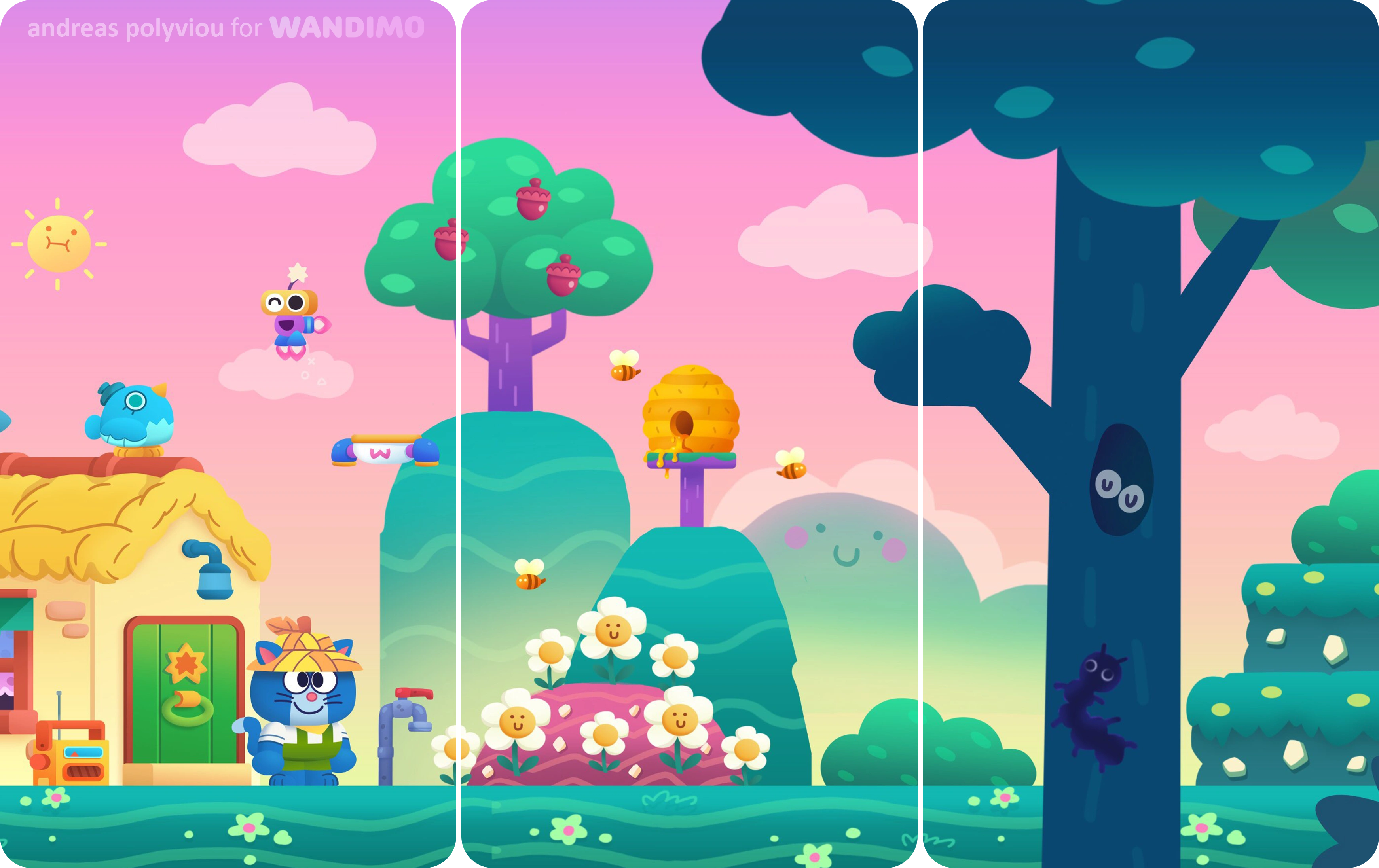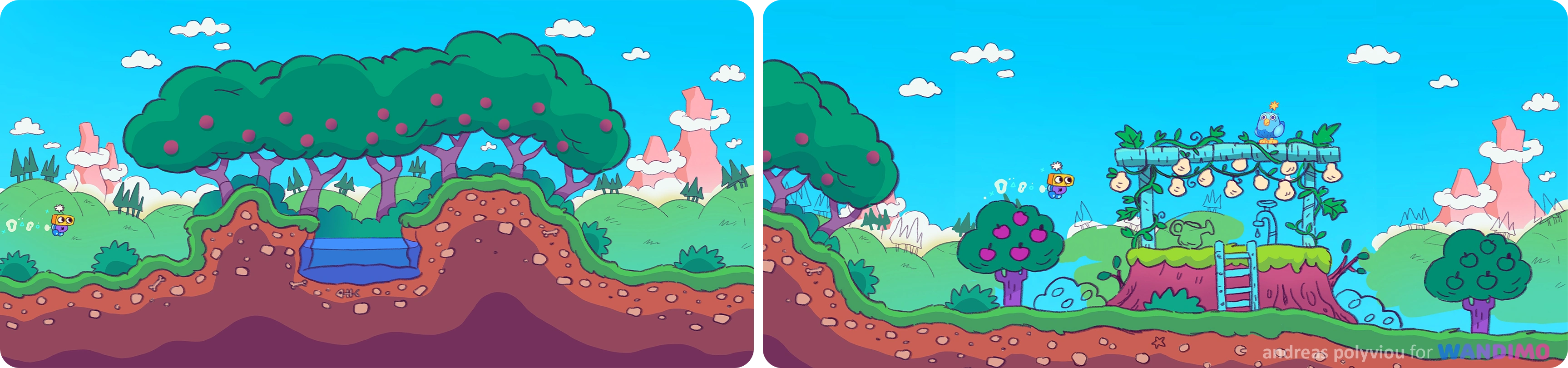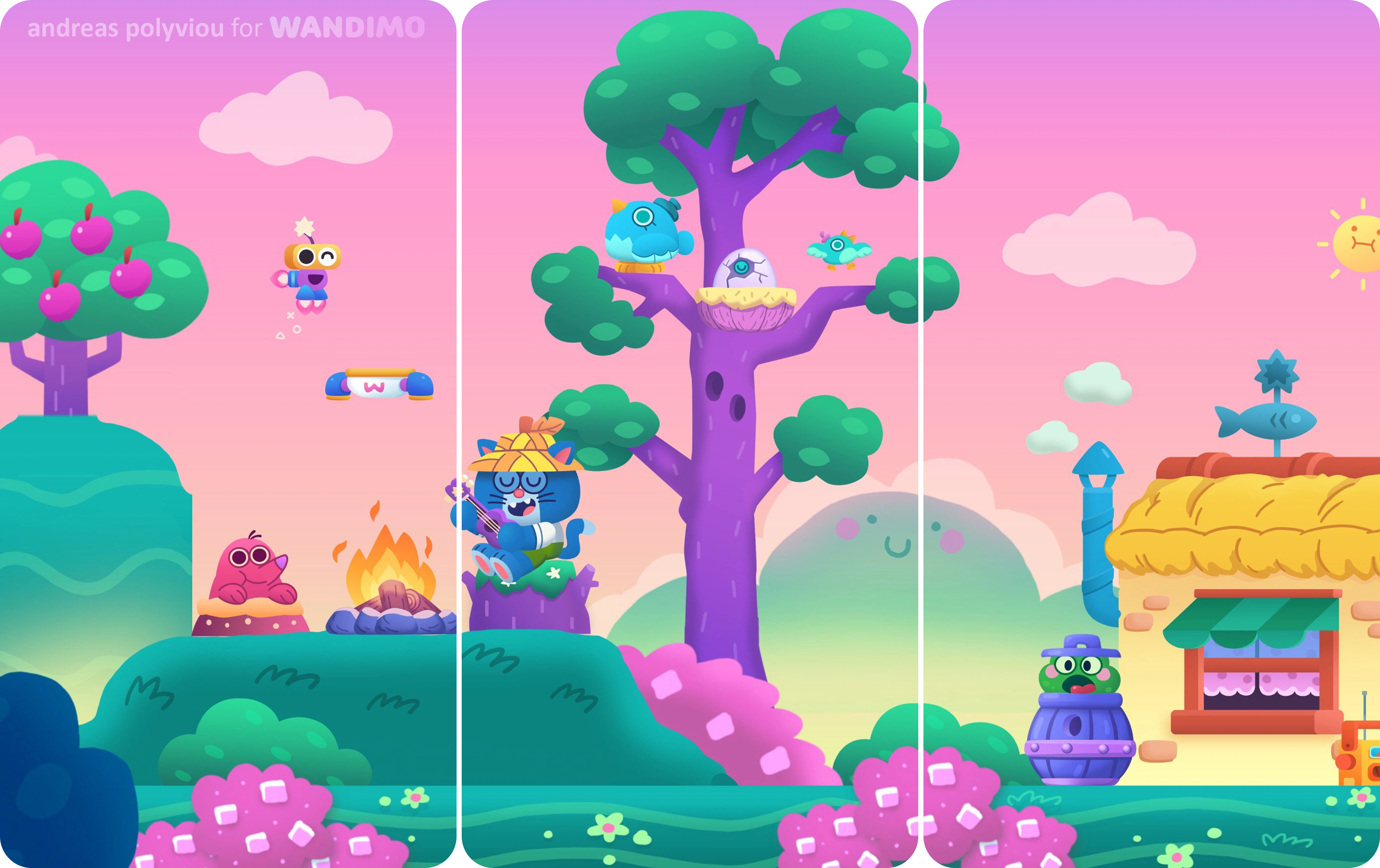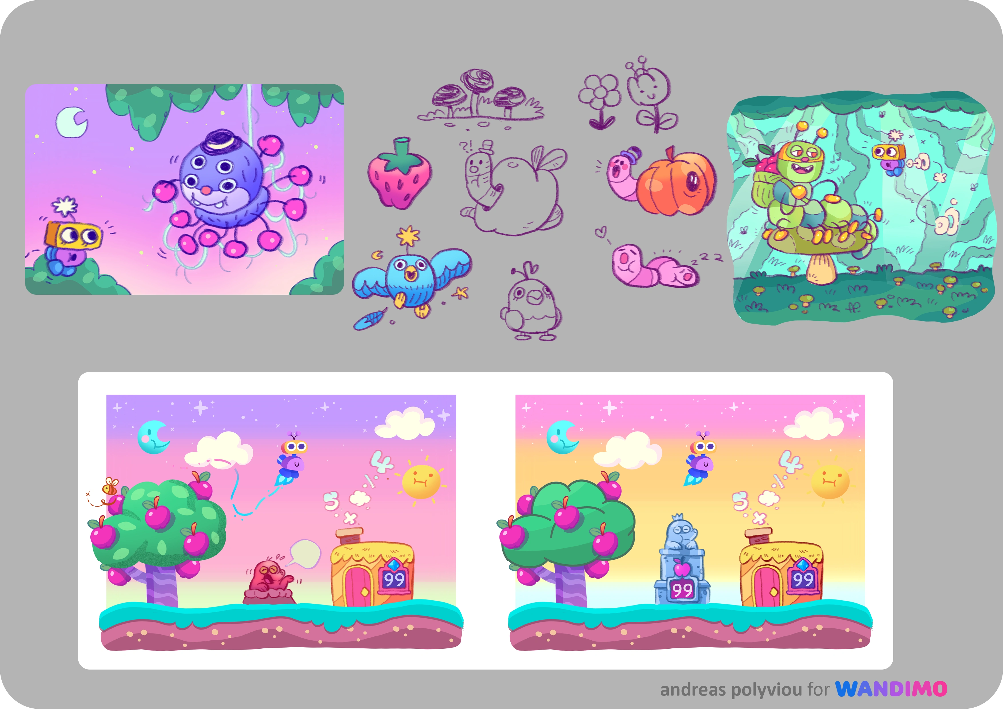 Below you can see some development art and final assets, for backgrounds and characters, animations and gameplay explorations.I had a lot of fun creating a vibrant and friendly world for players to learn and have fun with!