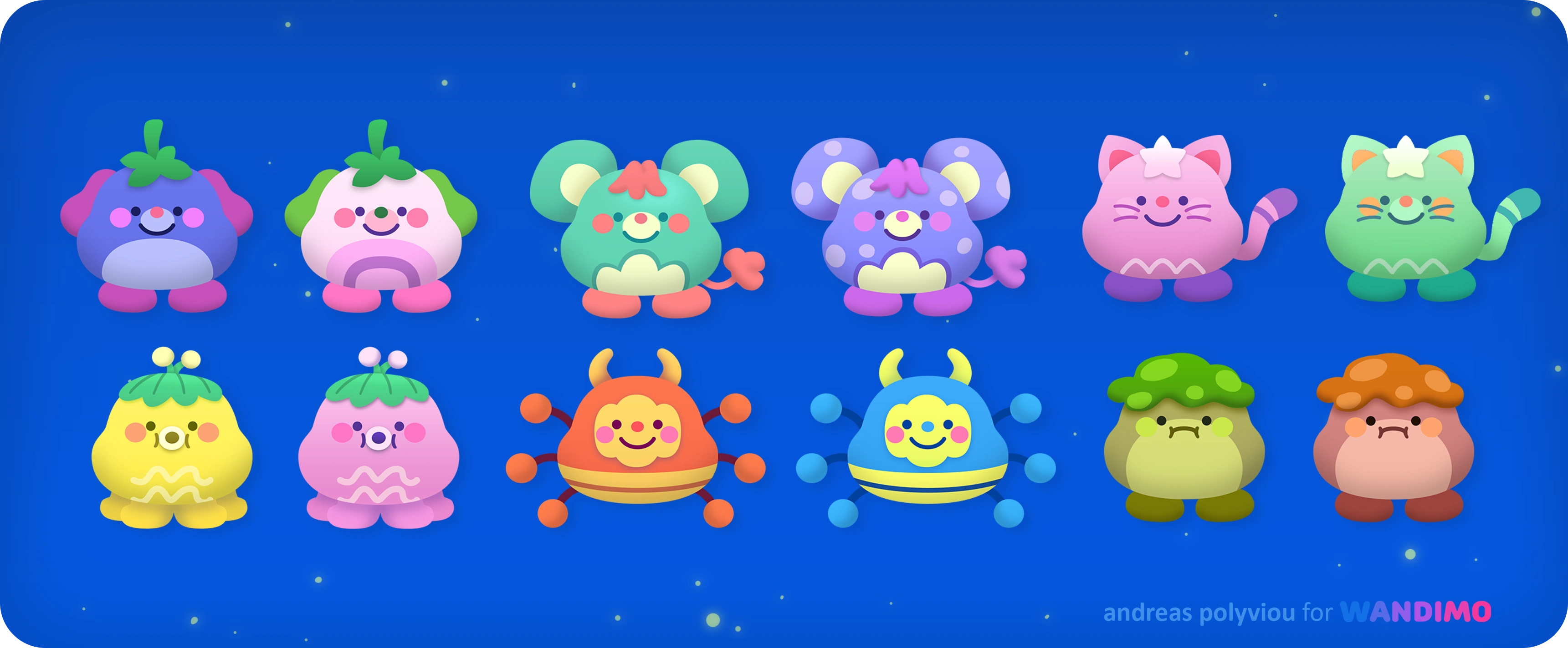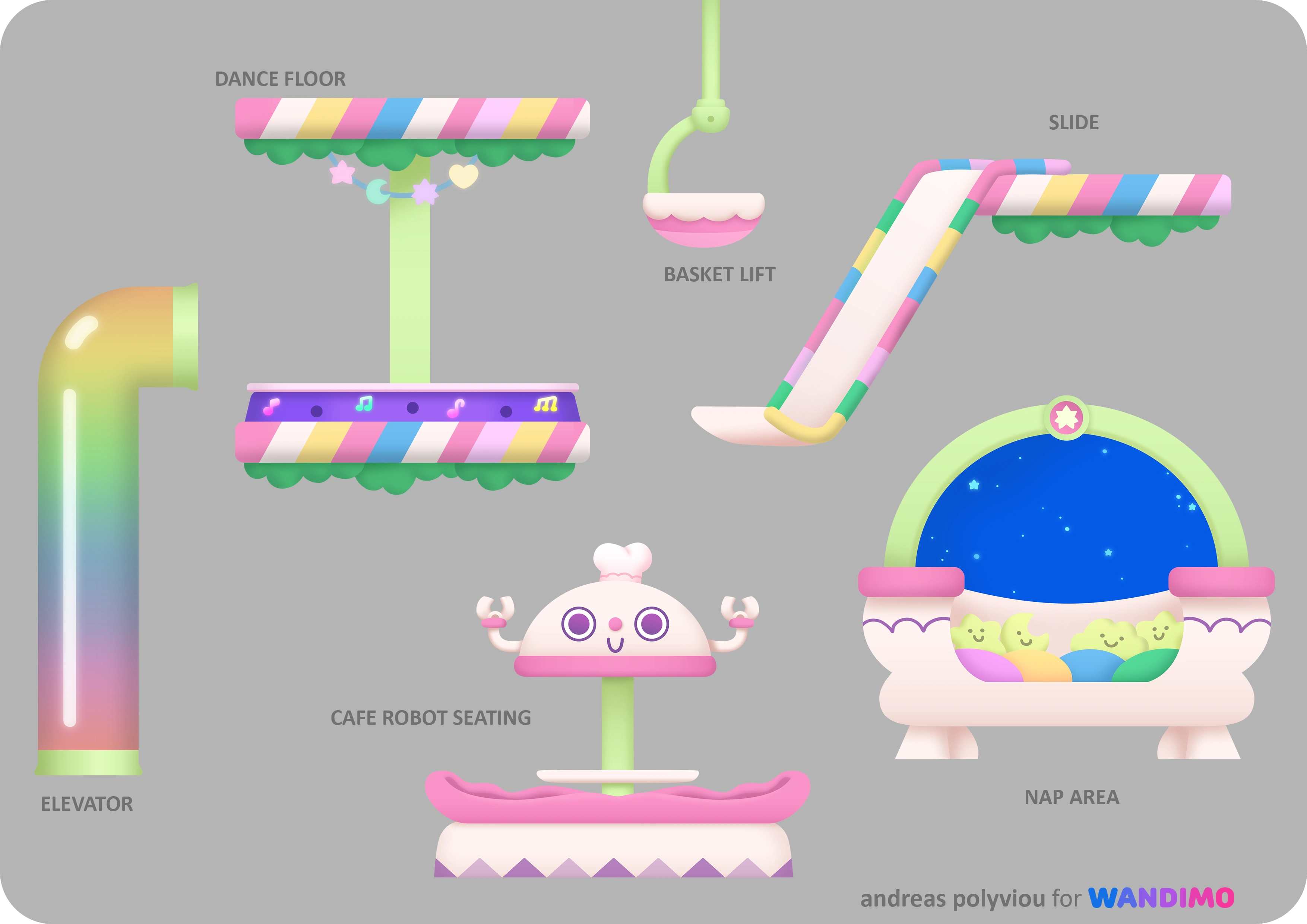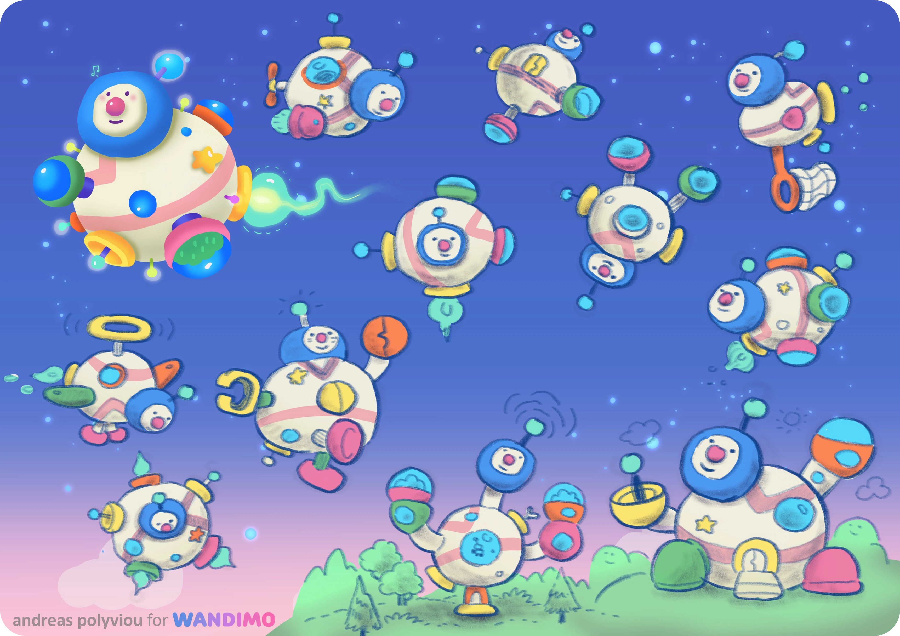 Above is furniture for the Wandapops living quarters on the ship, and below are some of the Wandapops animated using Spine 2D and skin swapping.