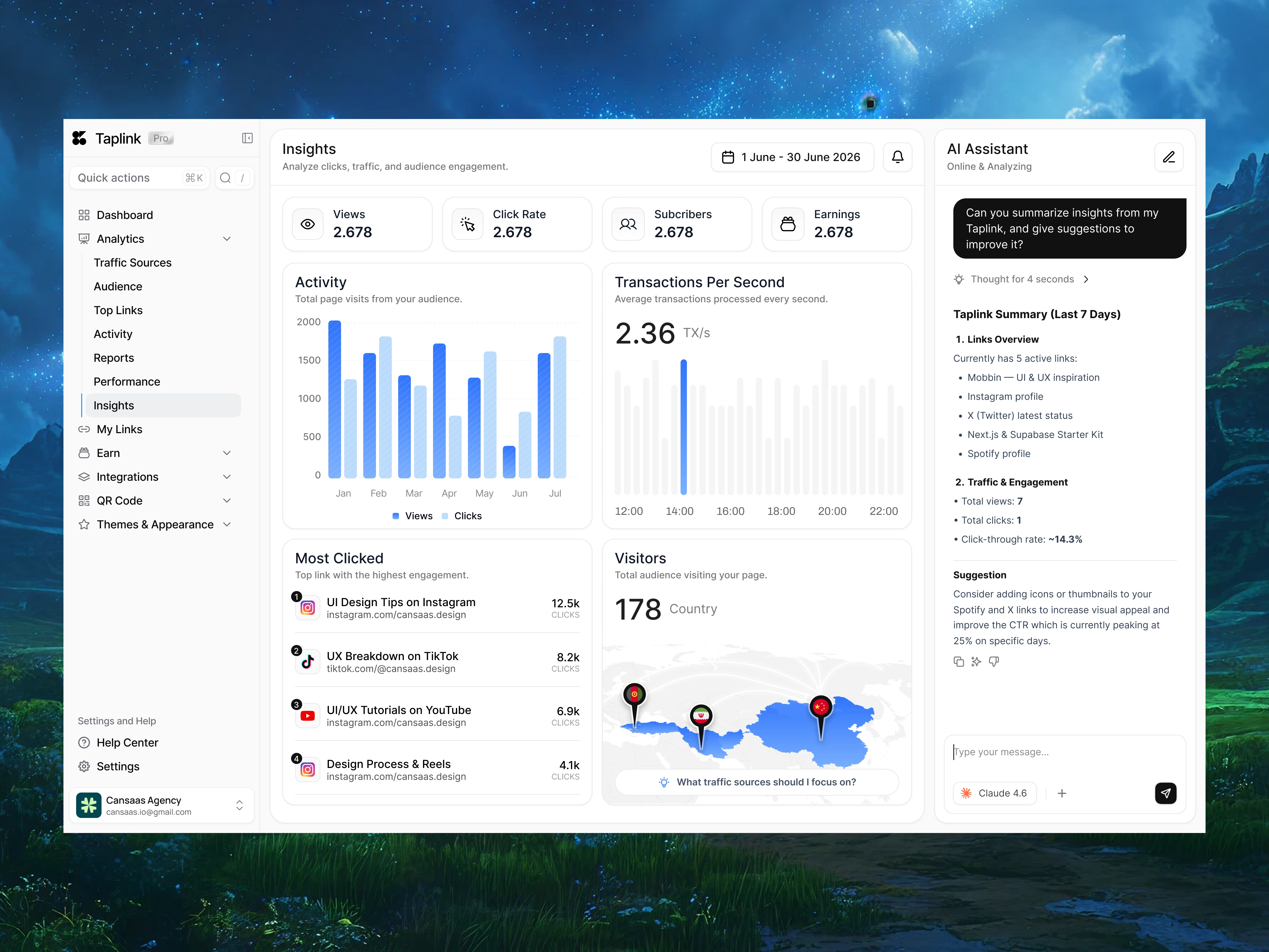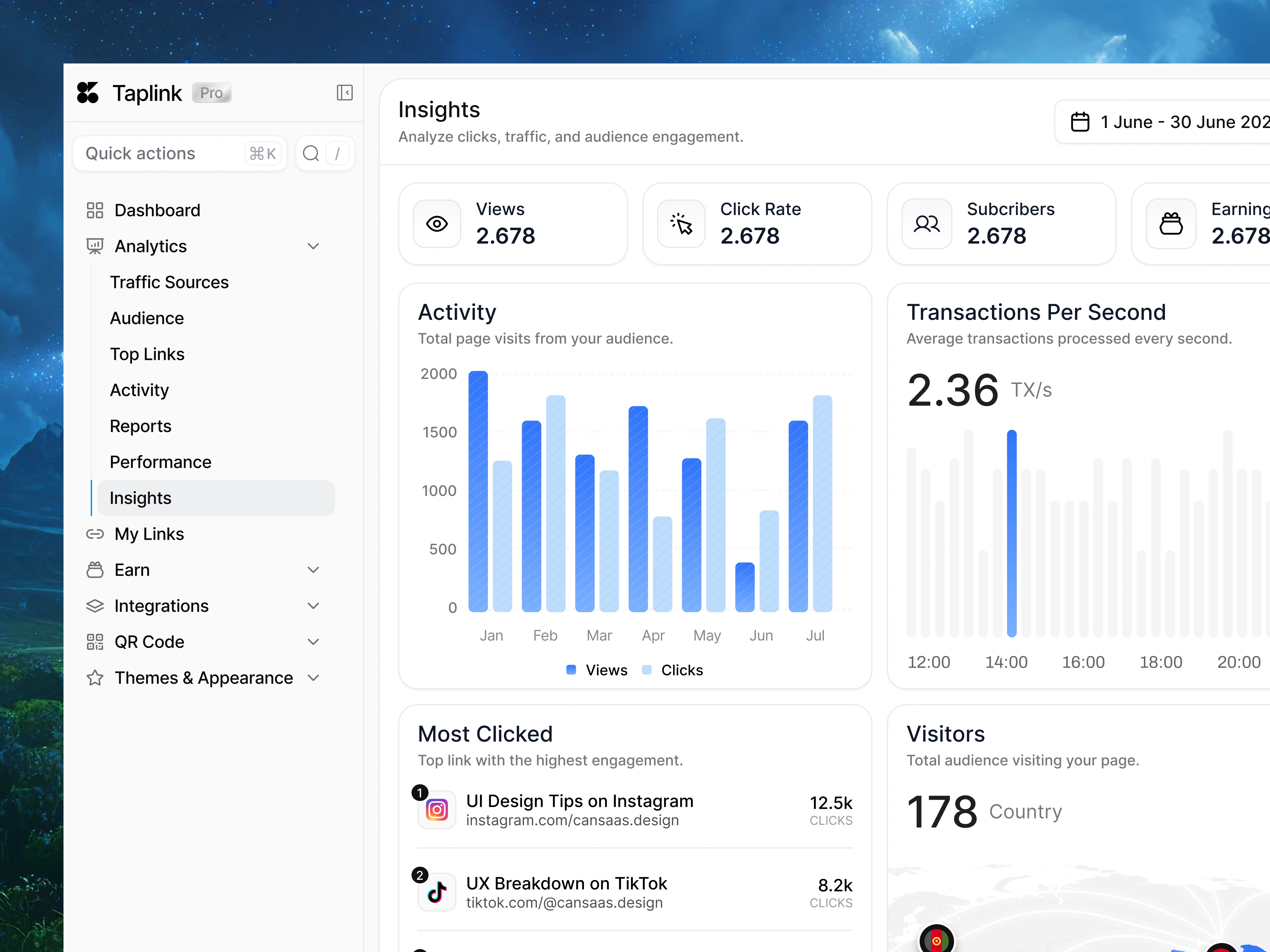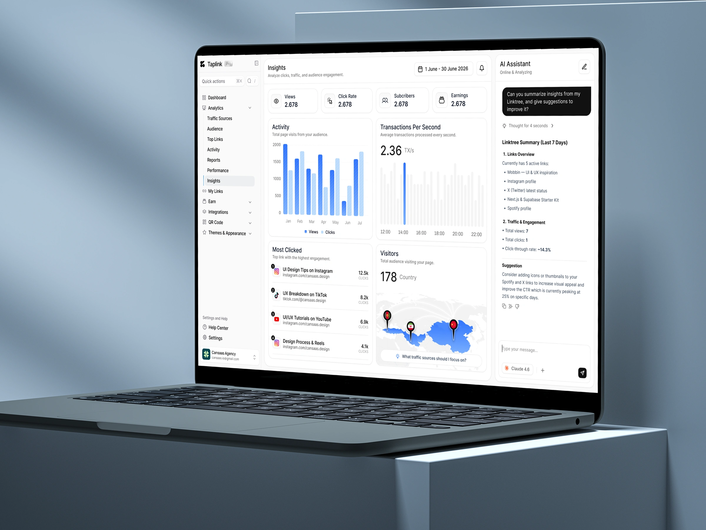 This dashboard was crafted with a minimal and modular design system, prioritizing readability and logical information flow. Key metrics such as views, click rate, subscribers, and earnings are placed at the top for instant visibility. Visual components like bar charts and activity graphs are simplified to reduce cognitive load while maintaining clarity. The layout uses consistent spacing, soft shadows, and neutral tones to create a calm, focused environment for data exploration.