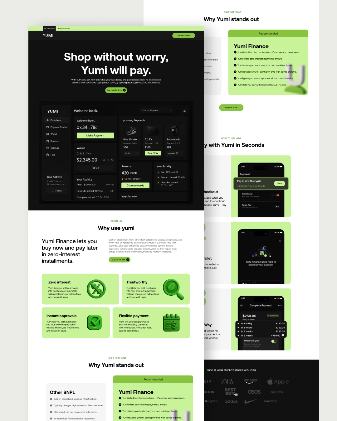Designed a landing page for Yumi, a Web3 BNPL platform, focusing on clarity, trust, and conversion.