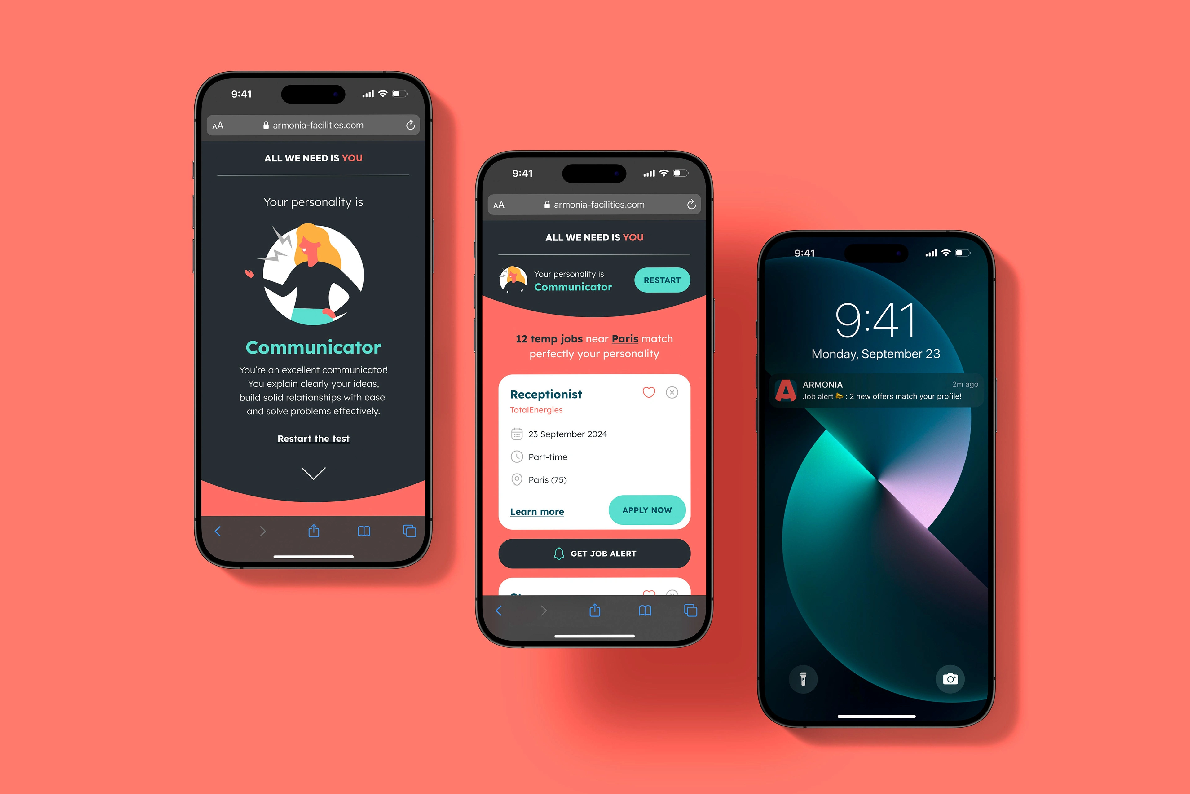 As part of an agency pitch for Armonia, I've worked on the digital assets by designing the app. The app 'Jobmatcher' is a playful tool which targets young graduates who seek for a part time job. Starting with a short quiz, the app defines the personality of the user and shows as result a list of temp jobs matching with the user's personality. As soon as new job offers are posted, a notification pops in.