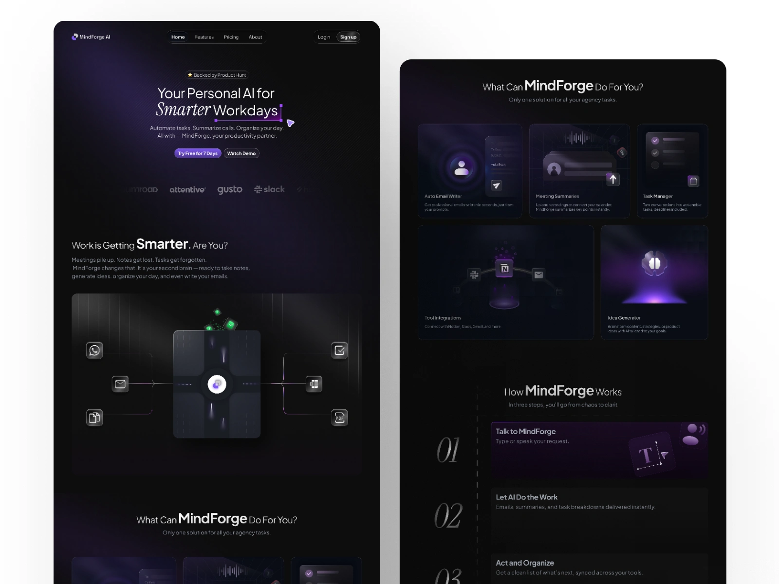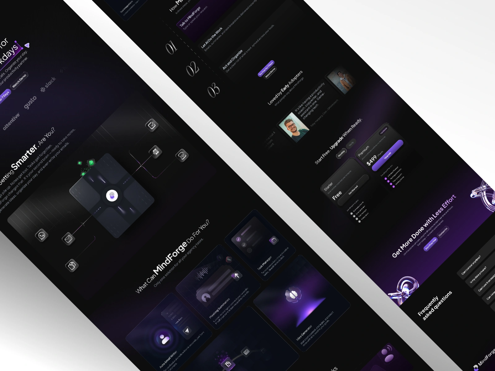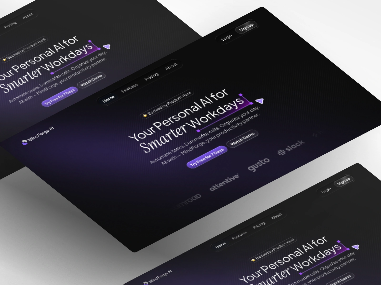 Mindforge AI complete landing page UI design, framer design, UI design, WEbsite UI design, hero section design, framer development. UI design