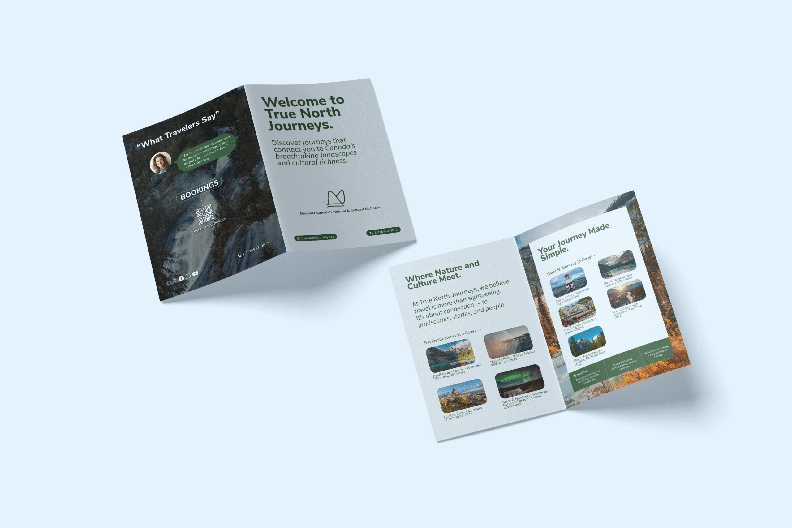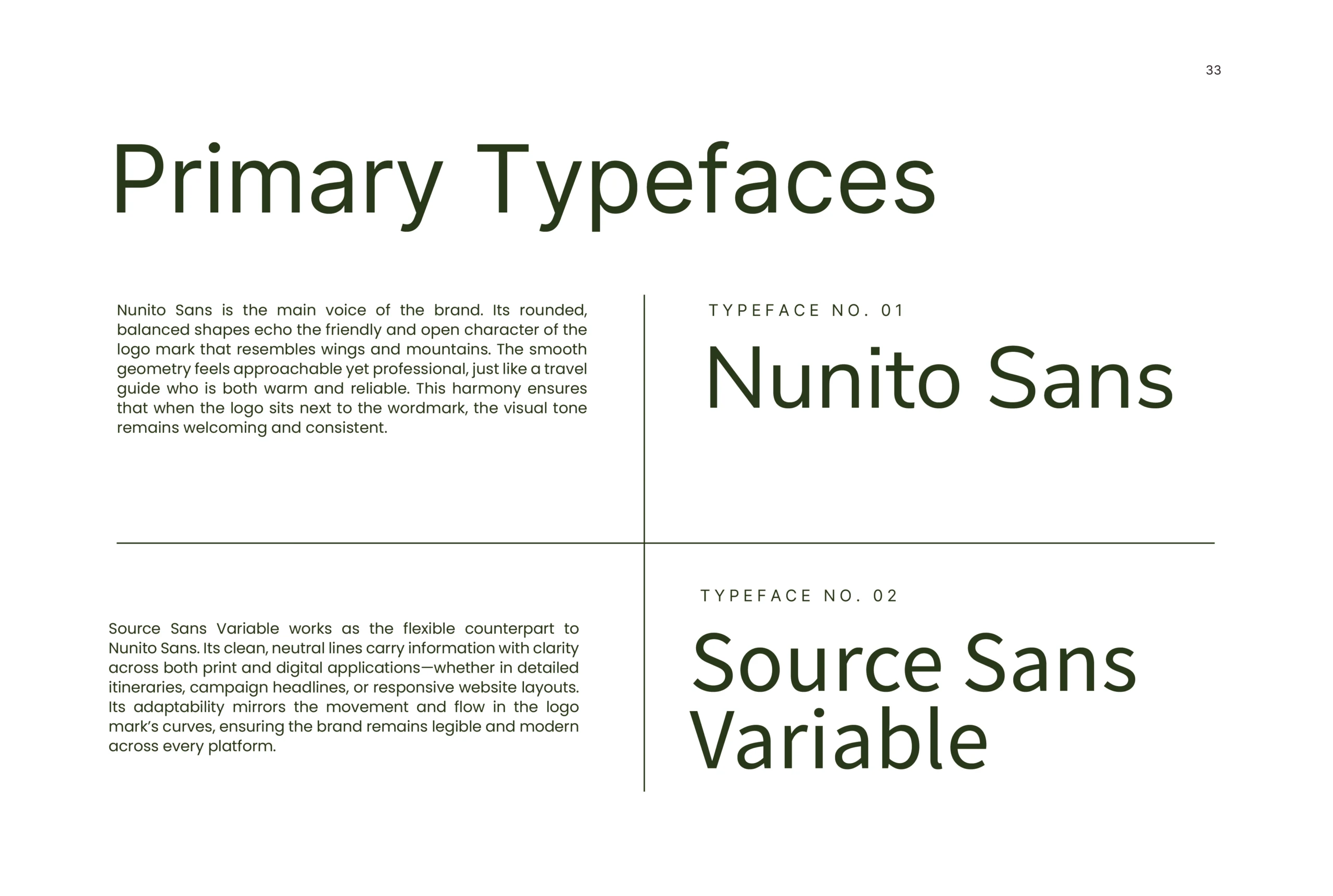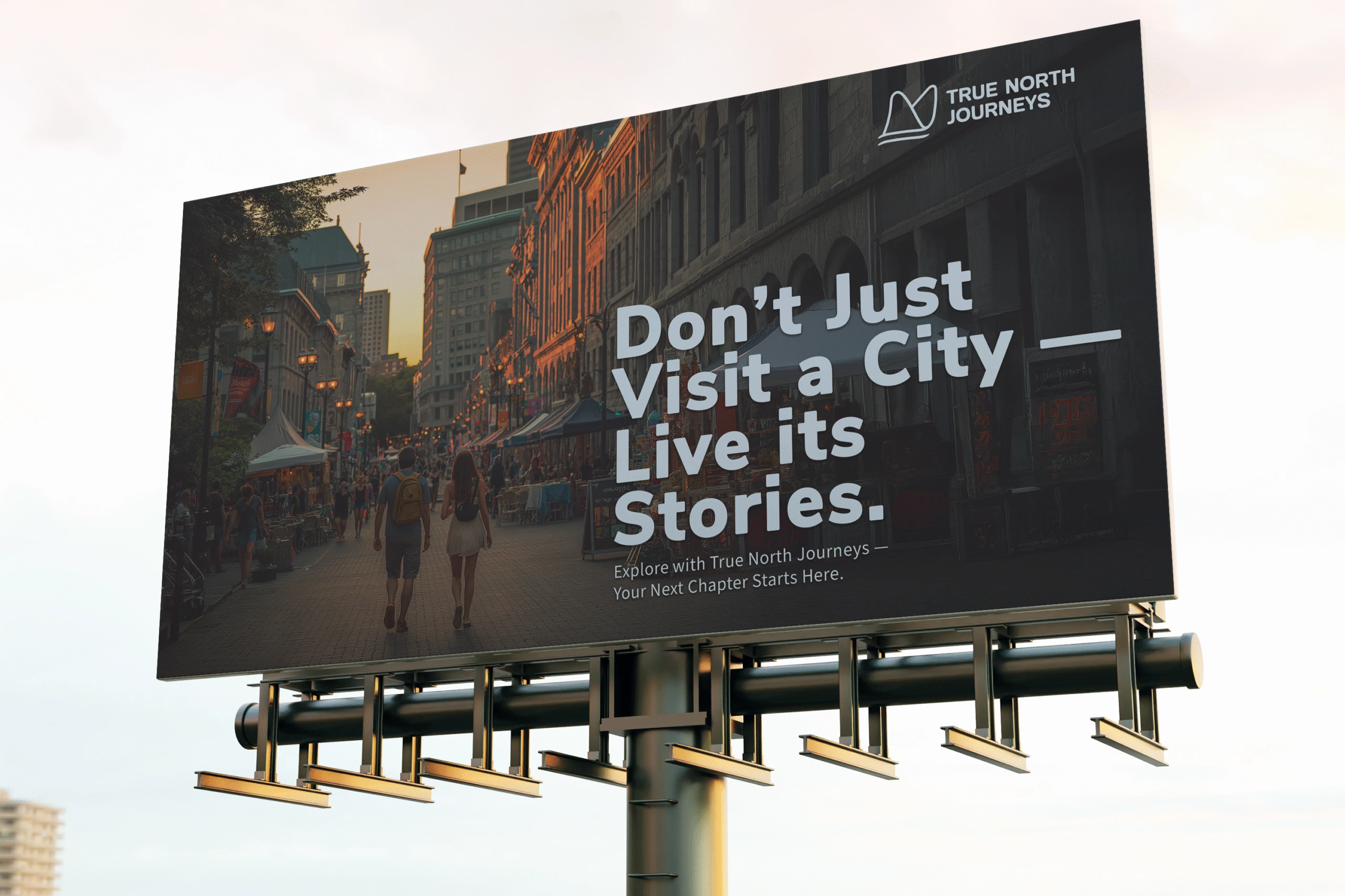 As a brand designer I led the entire brand creation for True North Journeys—from designing the identity system to copywriting, campaign concepts, and photography direction. Nunito Sans serves as the primary typeface, echoing the approachable curves of the logo mark inspired by wings and mountains, while Source Sans Variable provides clarity and adaptability across print and digital. The Dearly lettermark adds expressive character, tying emotion and storytelling into the system. Together, this trio balances clarity, consistency, and distinction—delivering a full brand identity that feels professional, human, and memorable.