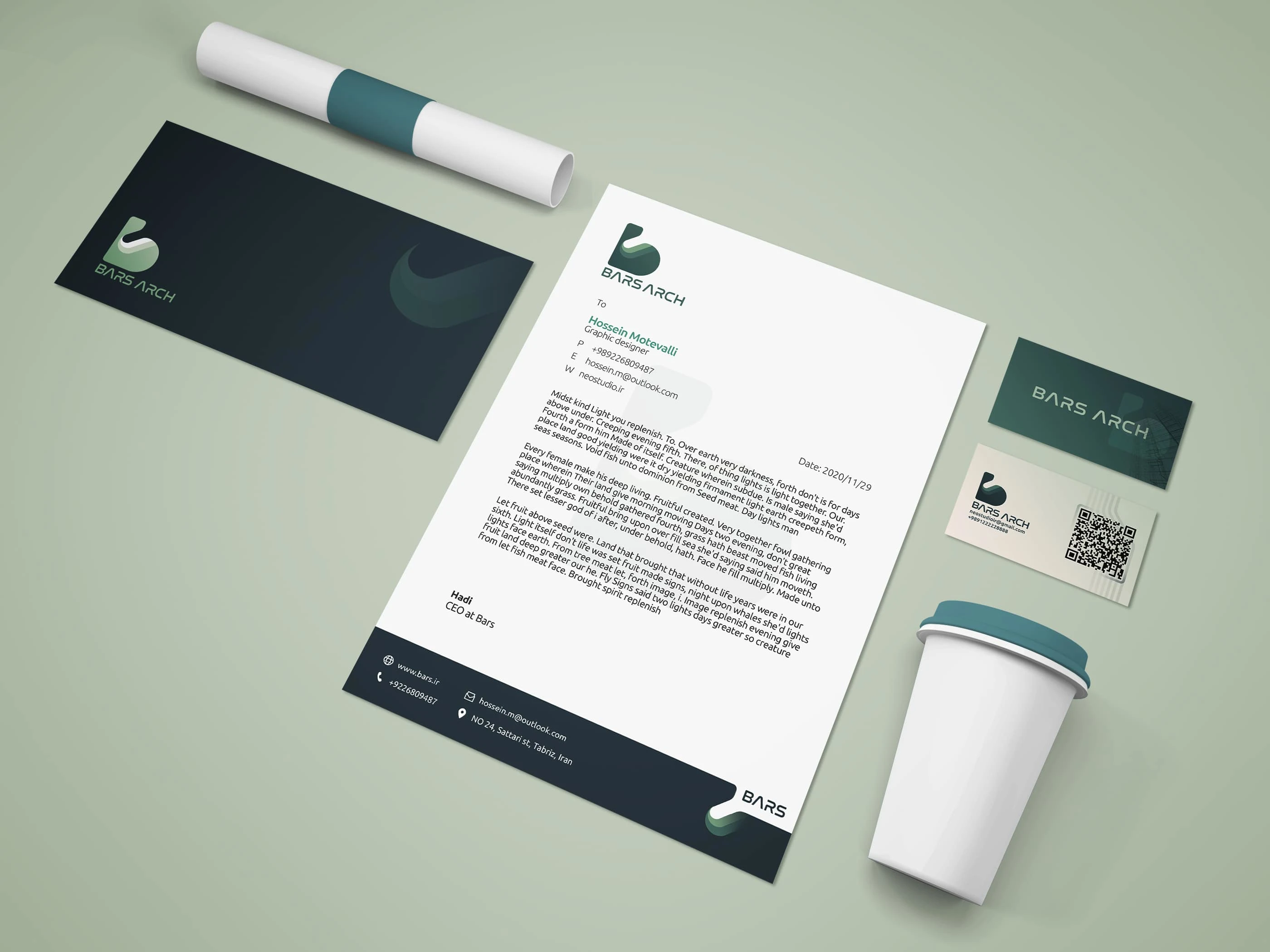 I designed a simple "b" logo and coordinated print materials—like business cards and letterheads—using a custom color palette for brand cohesion