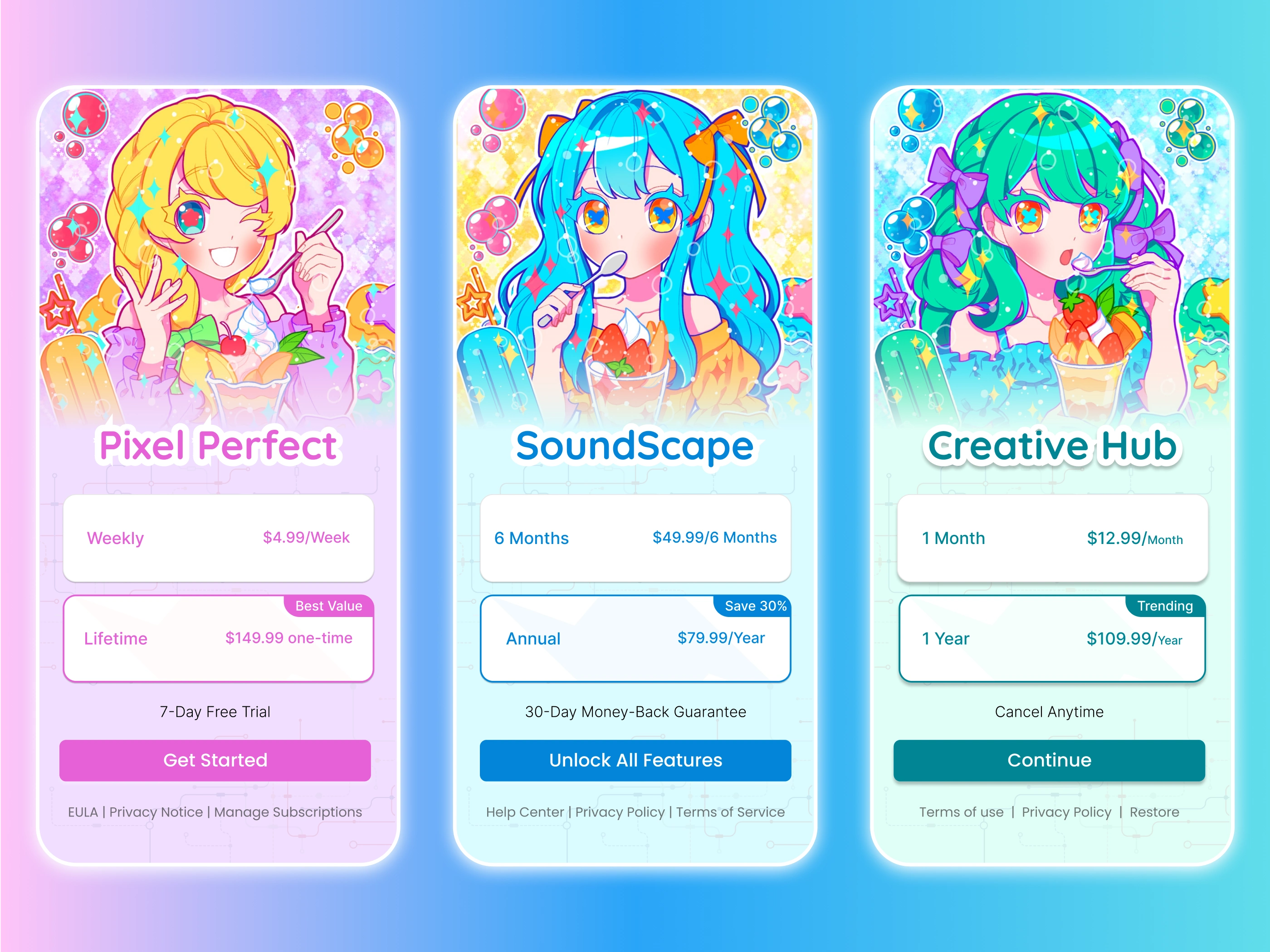 Designed a vibrant subscription screen UI for anime streaming apps with pricing plans, premium elements, and engaging layout.