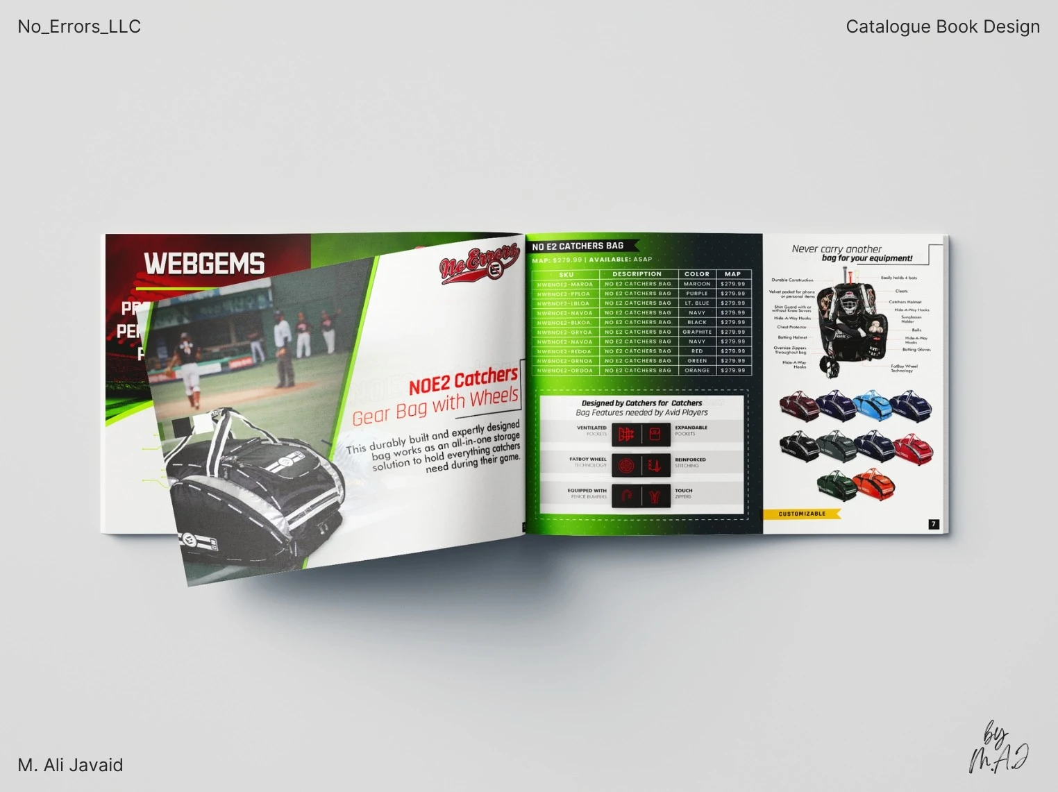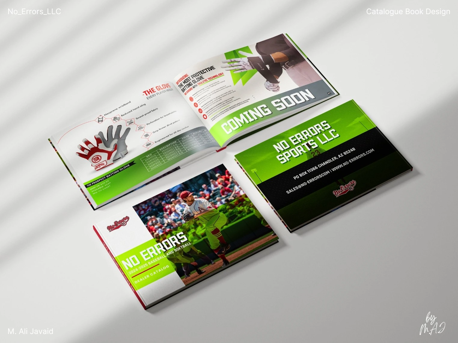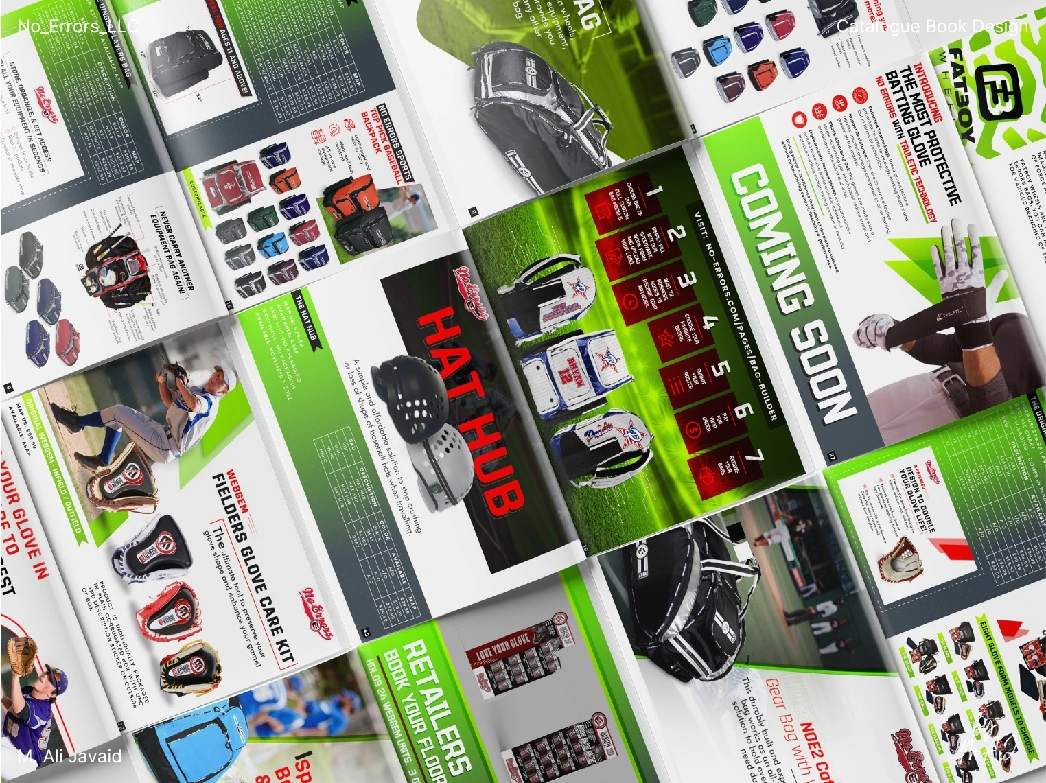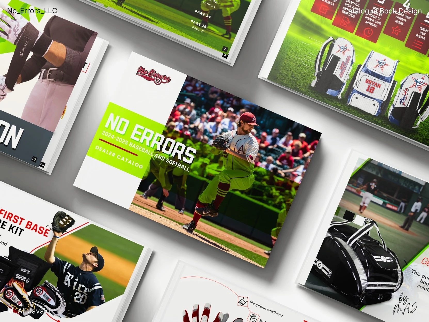 To move away from the brand’s usual red and blue, I introduced a secondary color palette centered on yellowish-green (#9ACD32). This choice wasn’t random: it was rooted in the sport itself. The tone mirrors the color of softballs and the field, while large areas of white space reference the clean, minimal aesthetics of baseball uniforms. Together, the gradient blends gave the catalog a look that felt fresh, focused, and directly tied to the world No Errors serves.