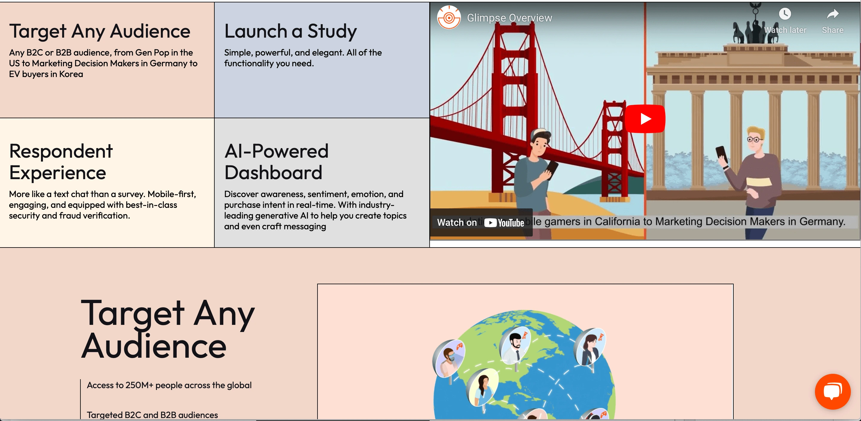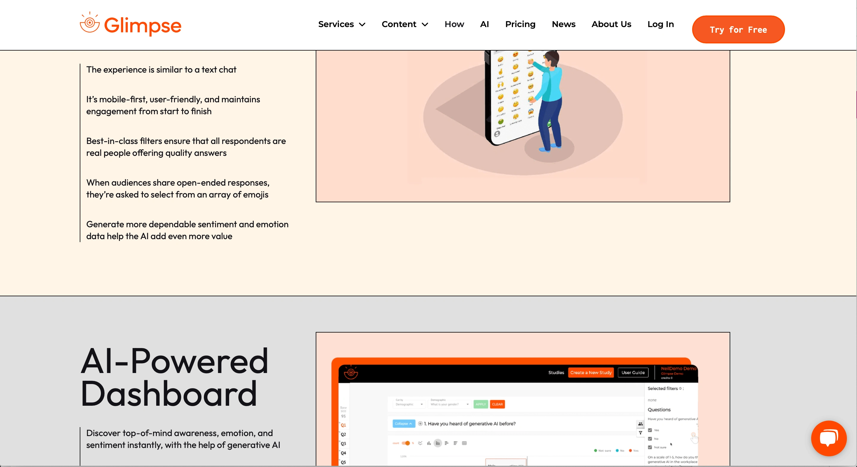 We focused on making Glimpse's AI messaging front and center by building call-outs on the home page and a dedicated AI page.