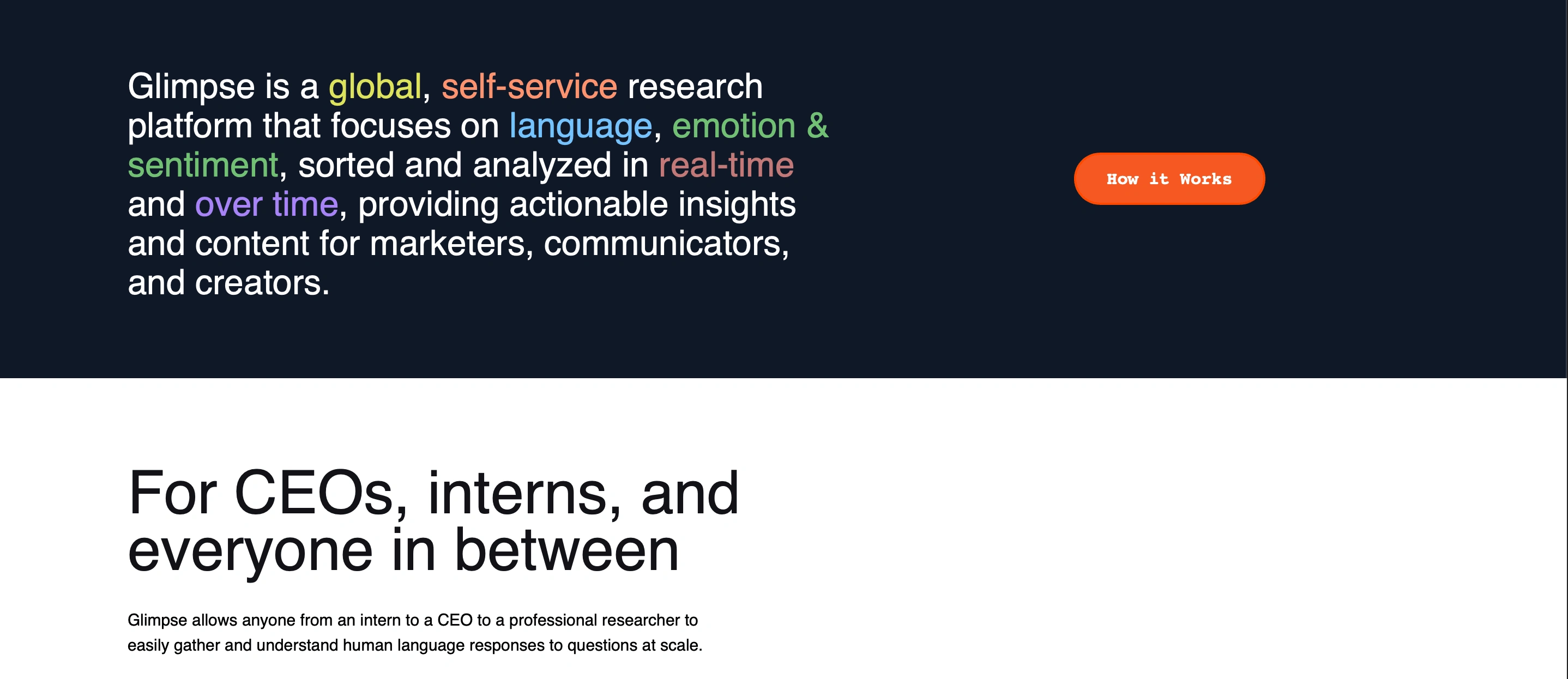 Extensions to a marketing site for a new kind of market research company. I helped Glimpse flesh out their branding and expand their Webflow site.