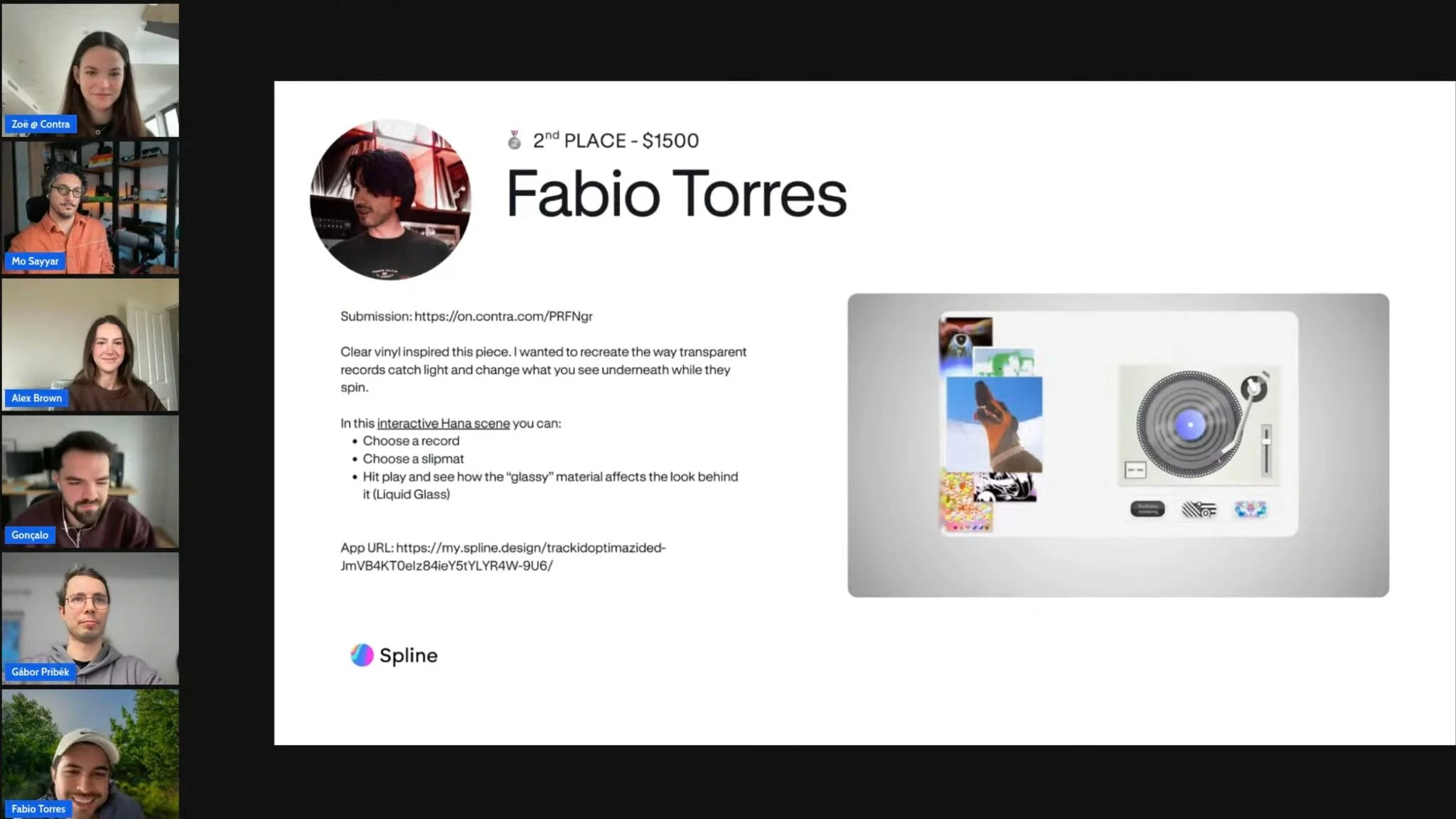 2nd place out of all submissions in the Spline Γ Contra Hana Challenge, awarded $1,500. The piece was recognized alongside work from designers with an incredible level of craft β a reminder of how high the bar is in this community.