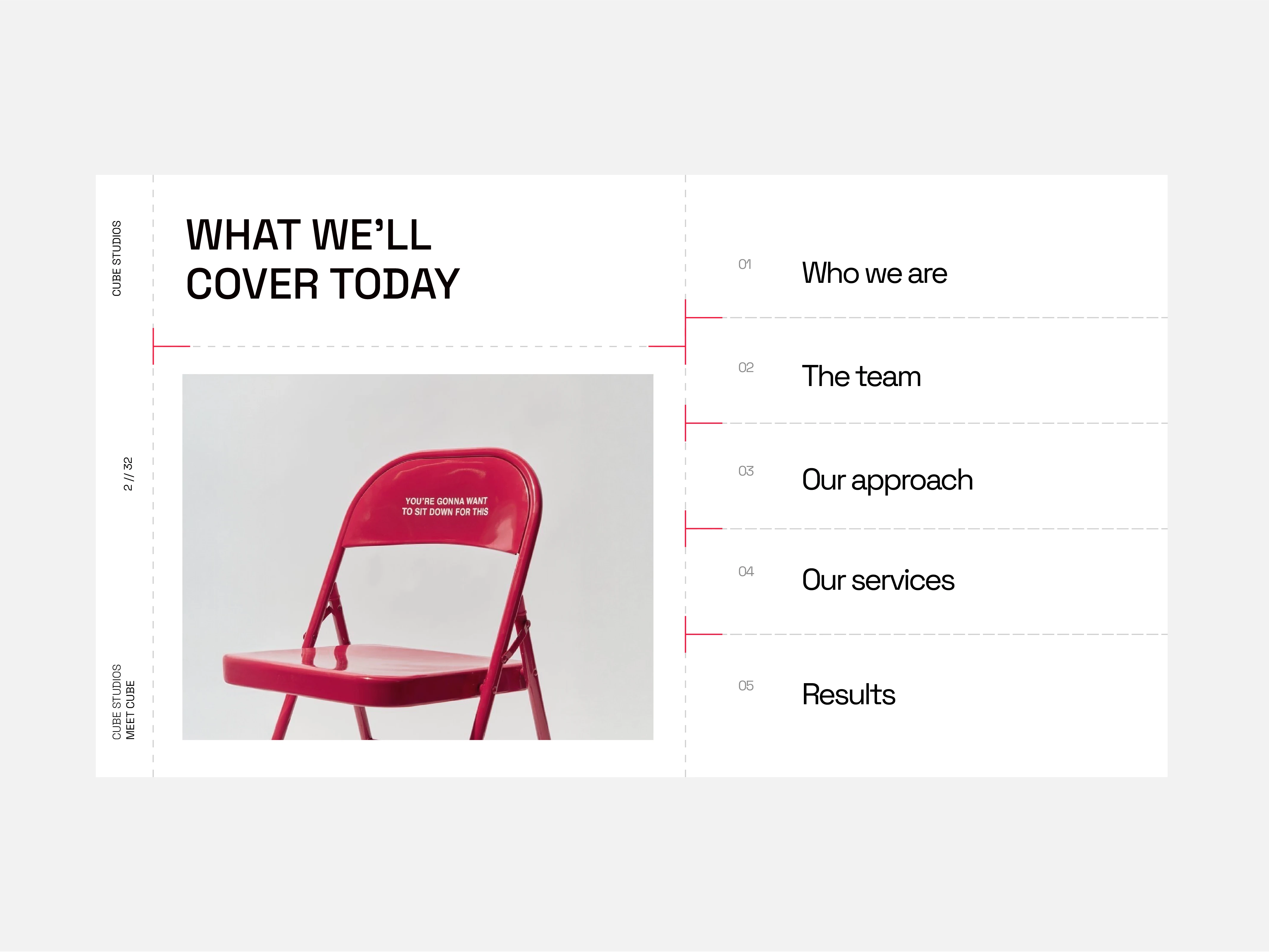 Created a friendly and confident pitch deck for CUBE STUDIOS®.