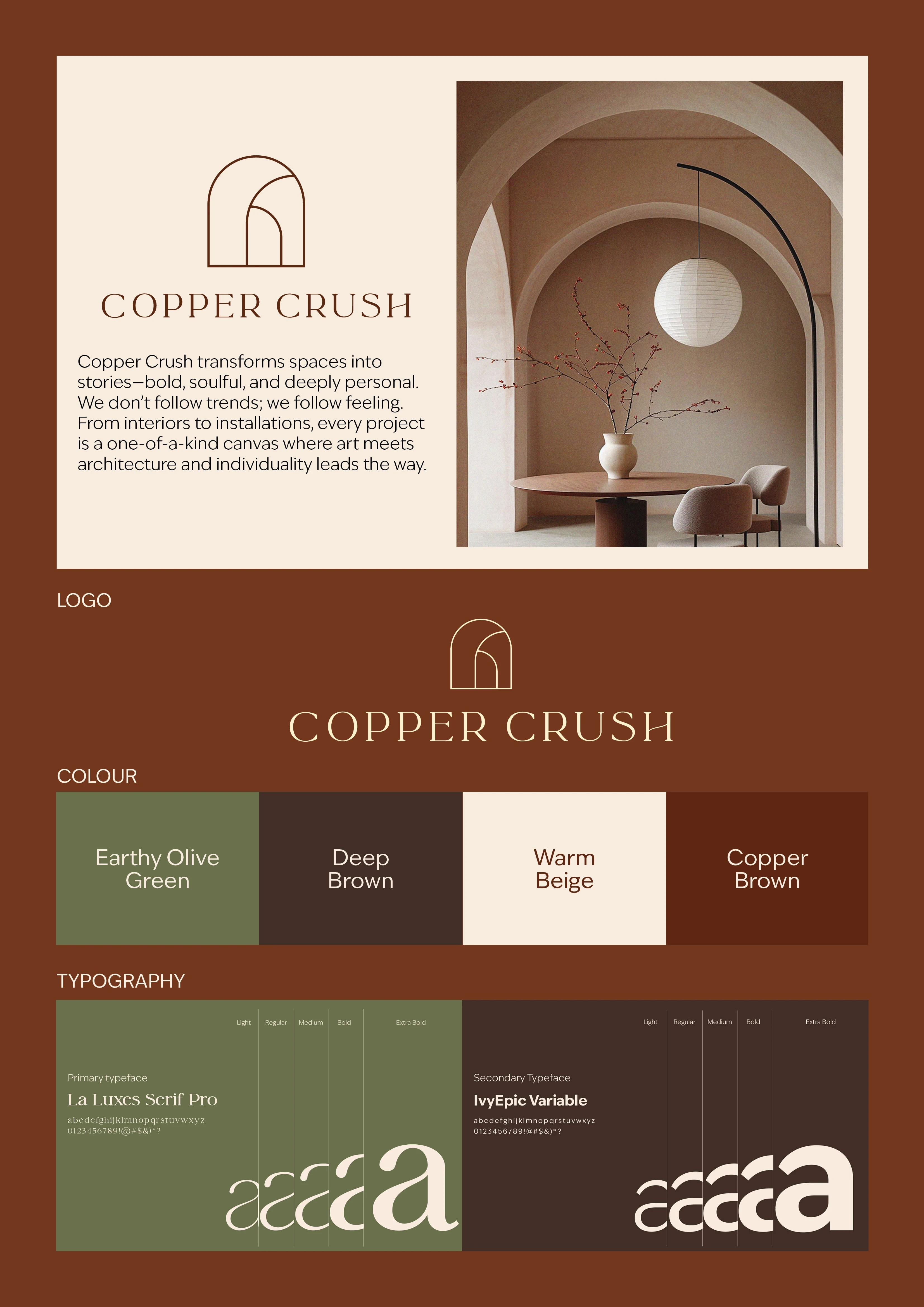 The brand now communicates its unique vision clearly and consistently. Digital touchpoints showcase the depth and personality of each project, reinforcing Copper Crush as a studio where spaces are crafted with care, creativity, and emotion.