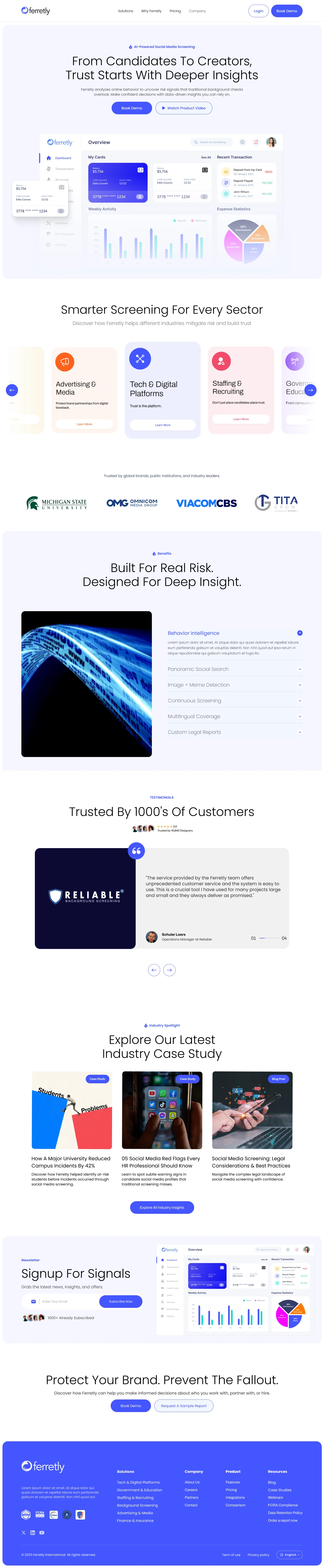Project Overview: Ferretly provides AI-powered social media screening tools for businesses to assess and manage online risk. The rebuild aimed to enhance brand credibility and user experience through a modern, professional design and a robust Webflow development approach.