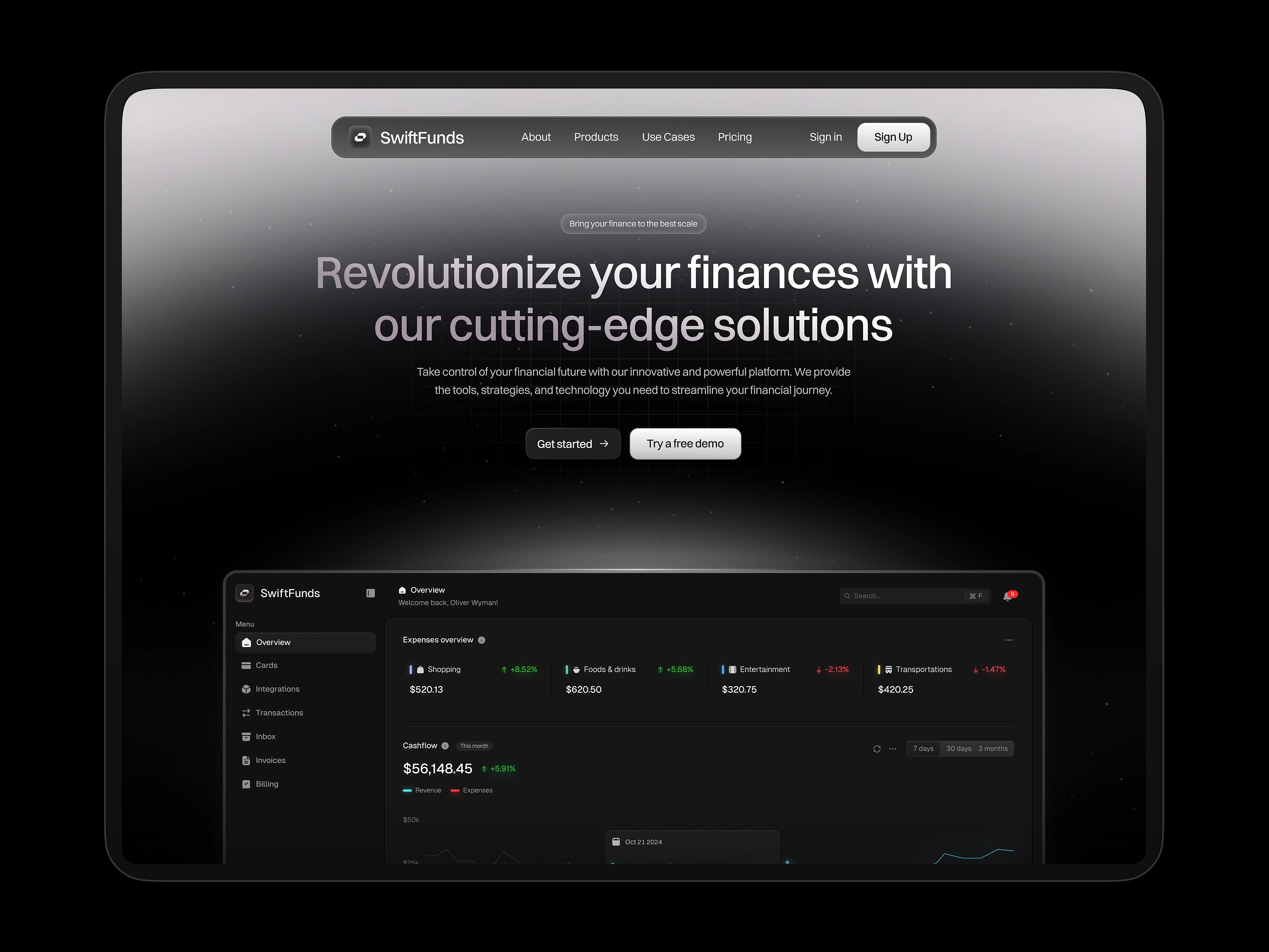 SwiftFunds is a cutting-edge fintech dashboard designed to simplify financial management for individuals and businesses. With a sleek interface and powerful analytics, it enables users to track, manage, and optimize their finances with ease.