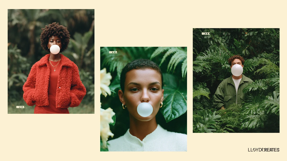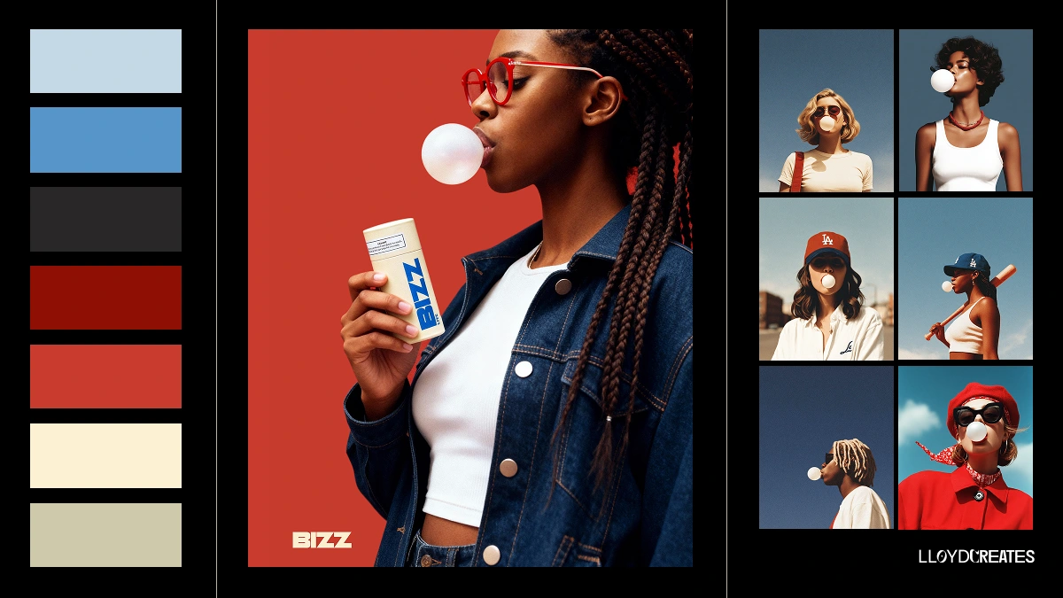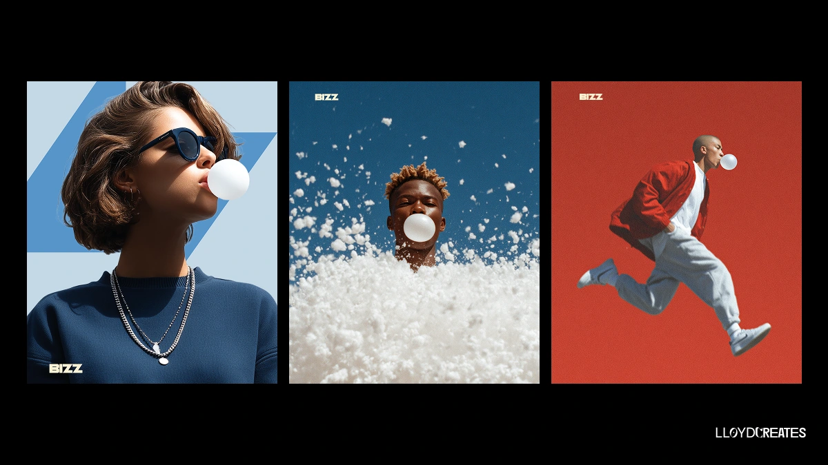 The final visual direction merges fashion‑level art direction with real‑world textures. Hero shots feature charismatic individuals blowing bubbles against saturated backgrounds.