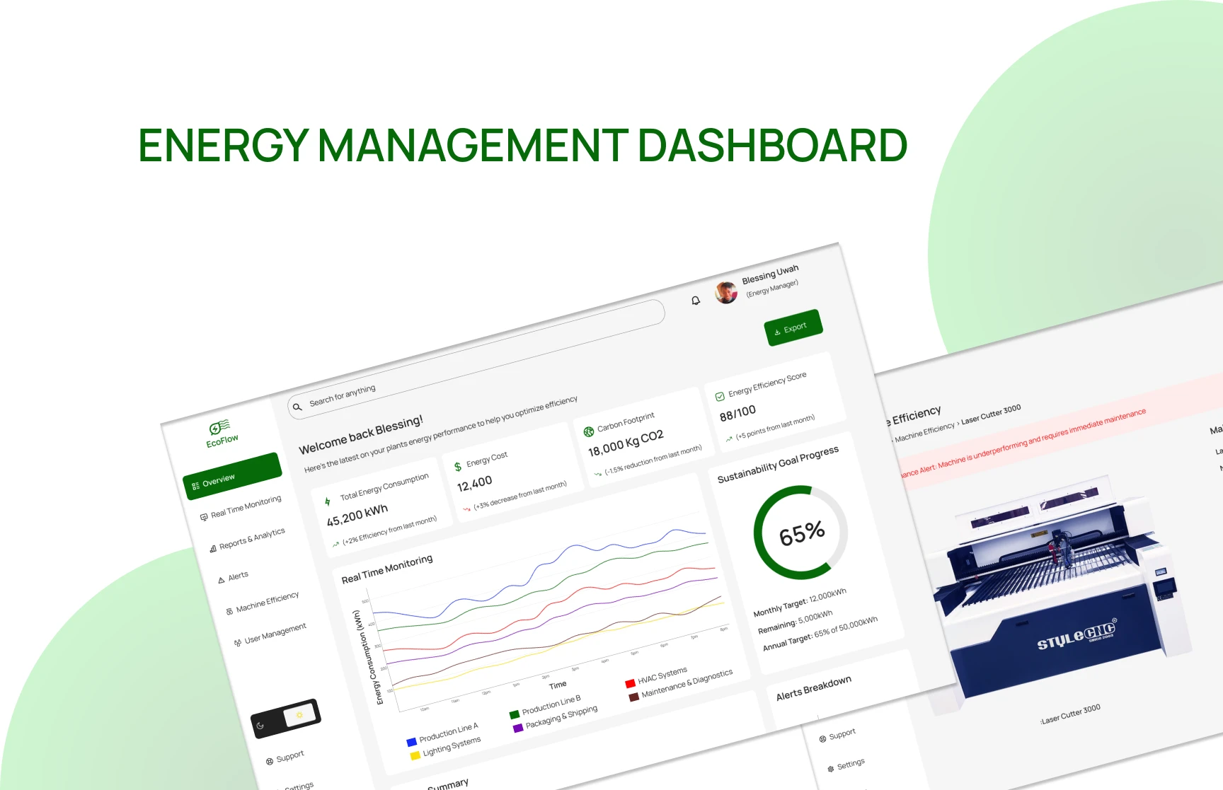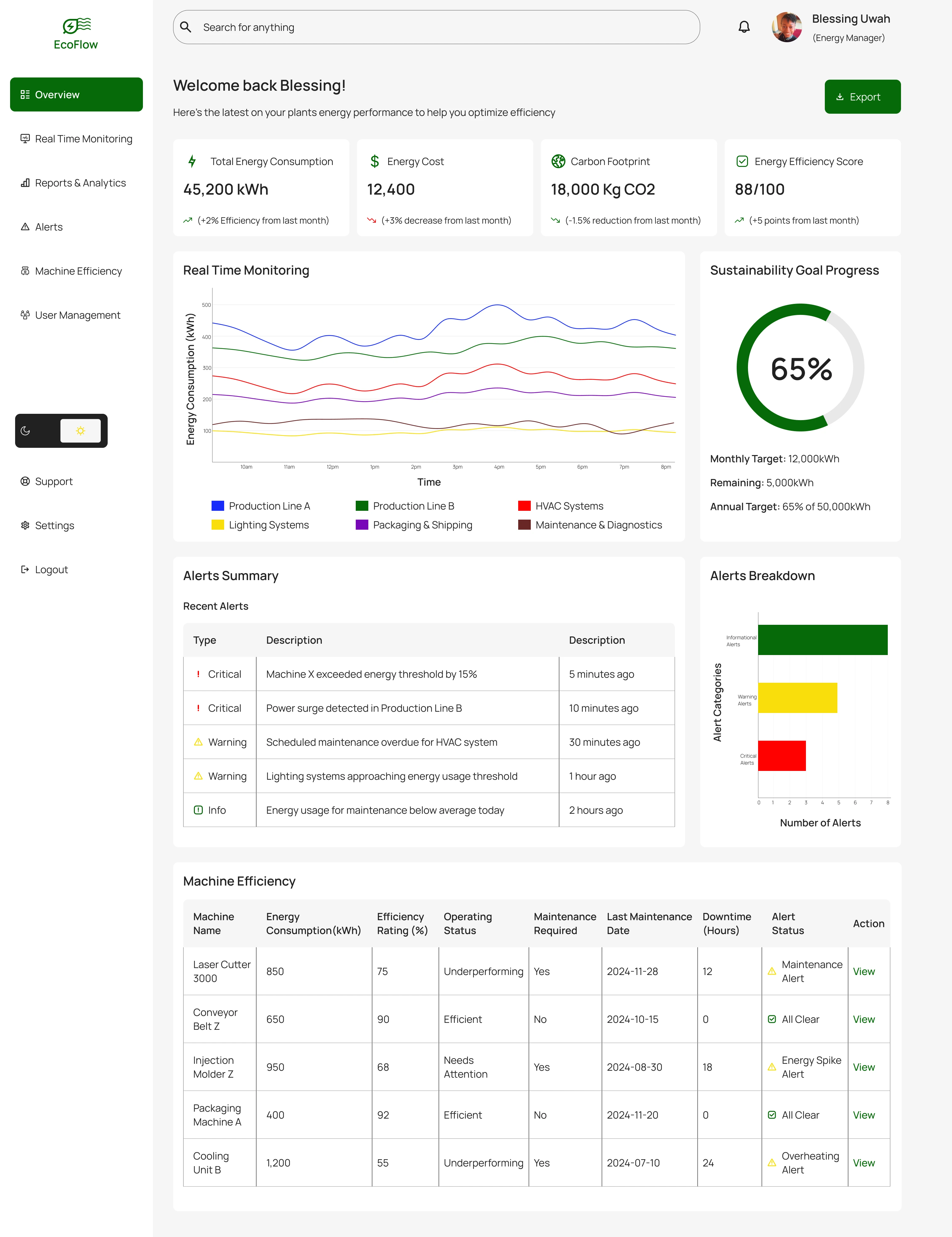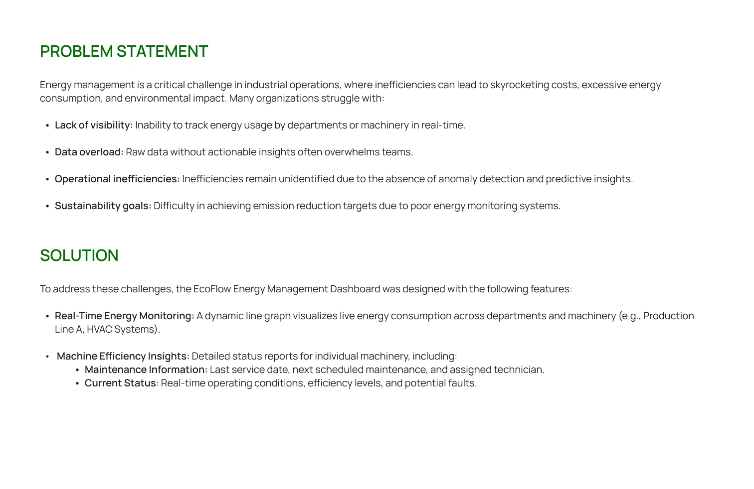 The EcoFlow Energy Management Dashboard is a comprehensive solution designed to address the challenges of energy inefficiencies in industrial operations.