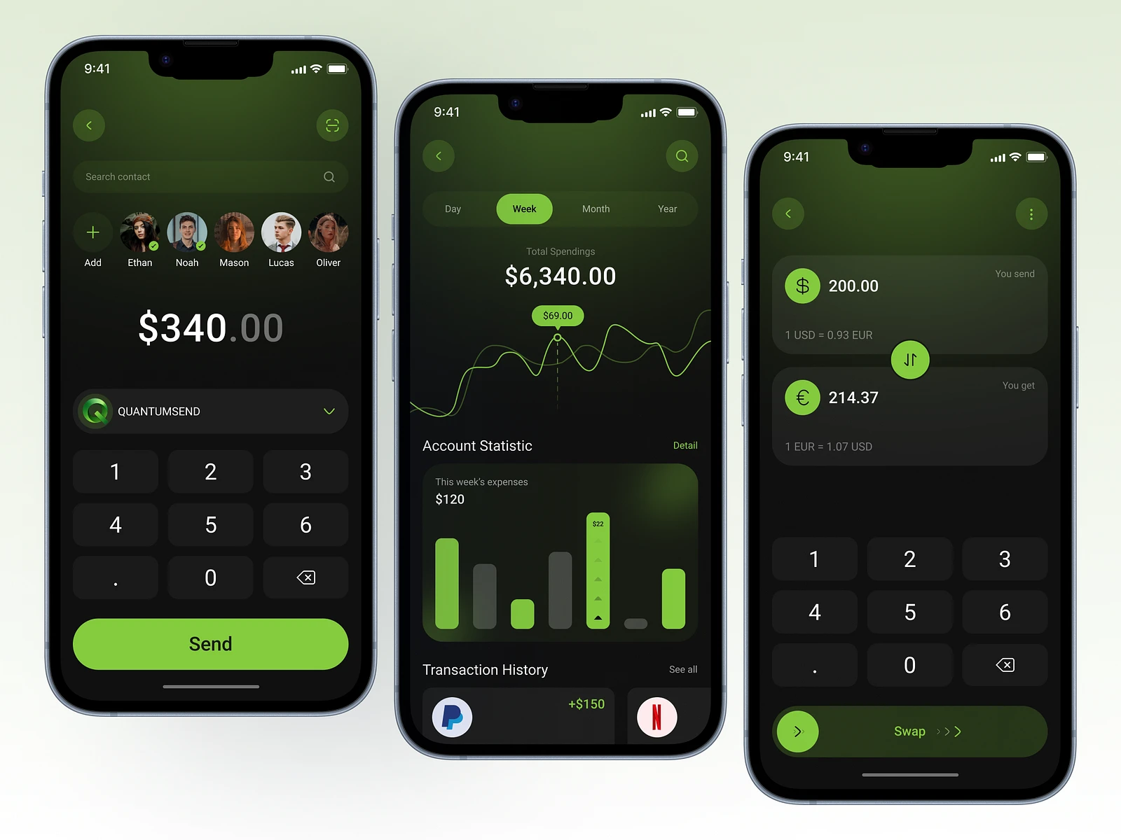 Dark elegance meets seamless fintech in this QuantumSend mobile wallet concept. Designed for users who value security, speed, and a premium feel in everyday payments.
