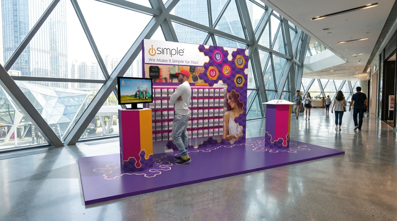 The i-simple booth uses bold geometry and 3D renders to debut mobile accessories, proving premium quality is now accessible at a fraction of the cost.