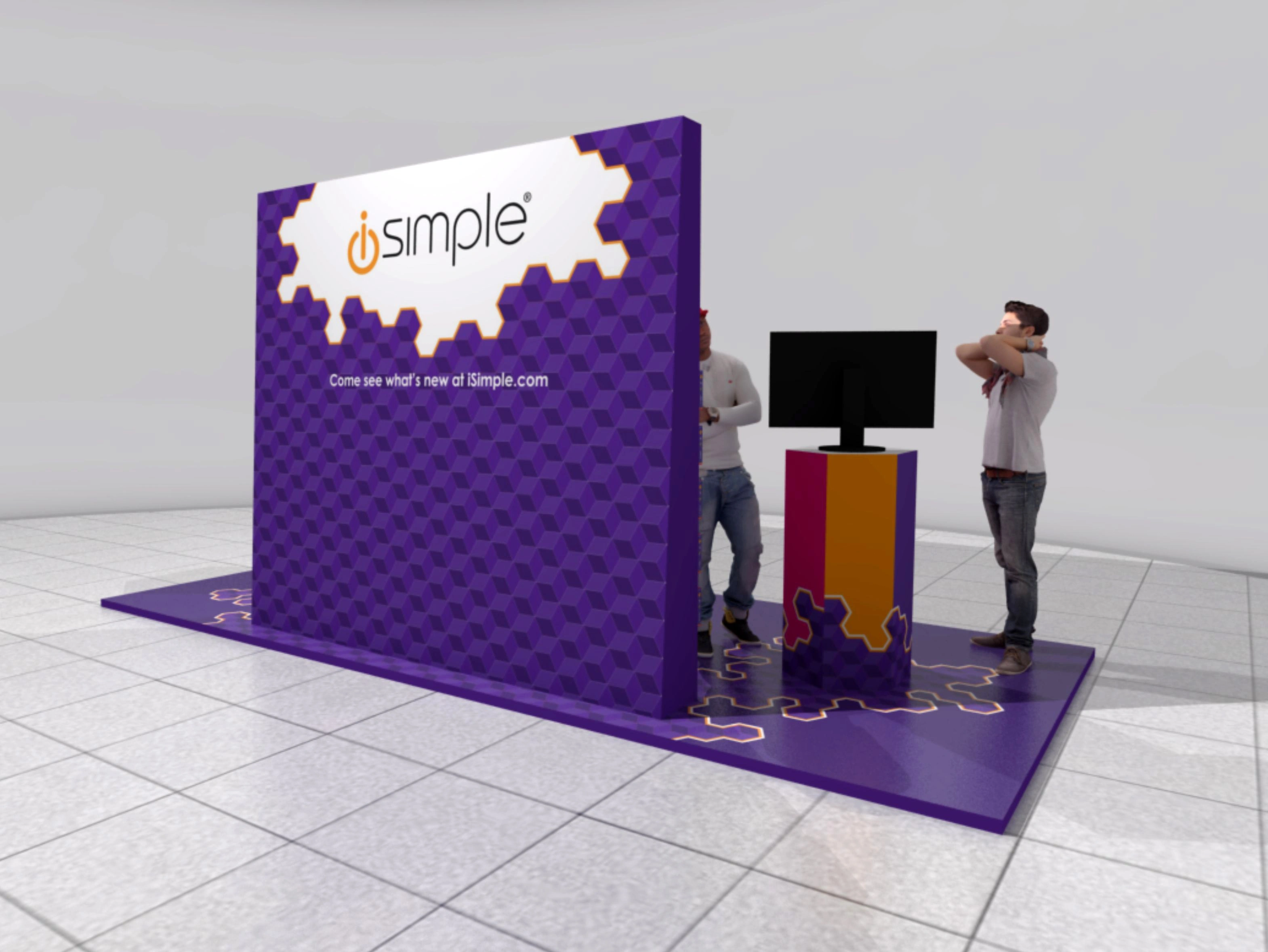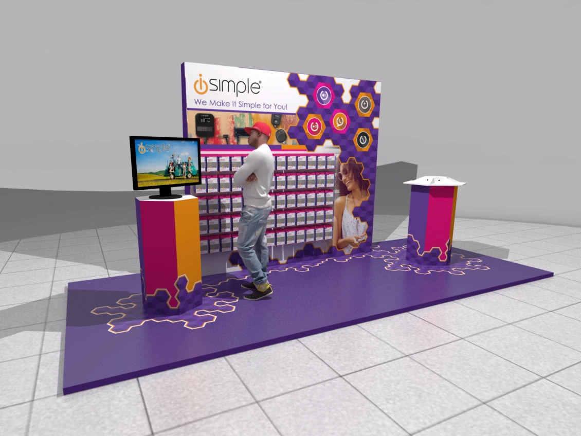 The i-simple exhibition booth uses bold geometric forms and vibrant graphics to command attention for its debut in the mobile accessory market. High-fidelity 3D renderings bring the vision to life, showcasing a high-energy aesthetic that signals premium quality is finally accessible at a fraction of the cost