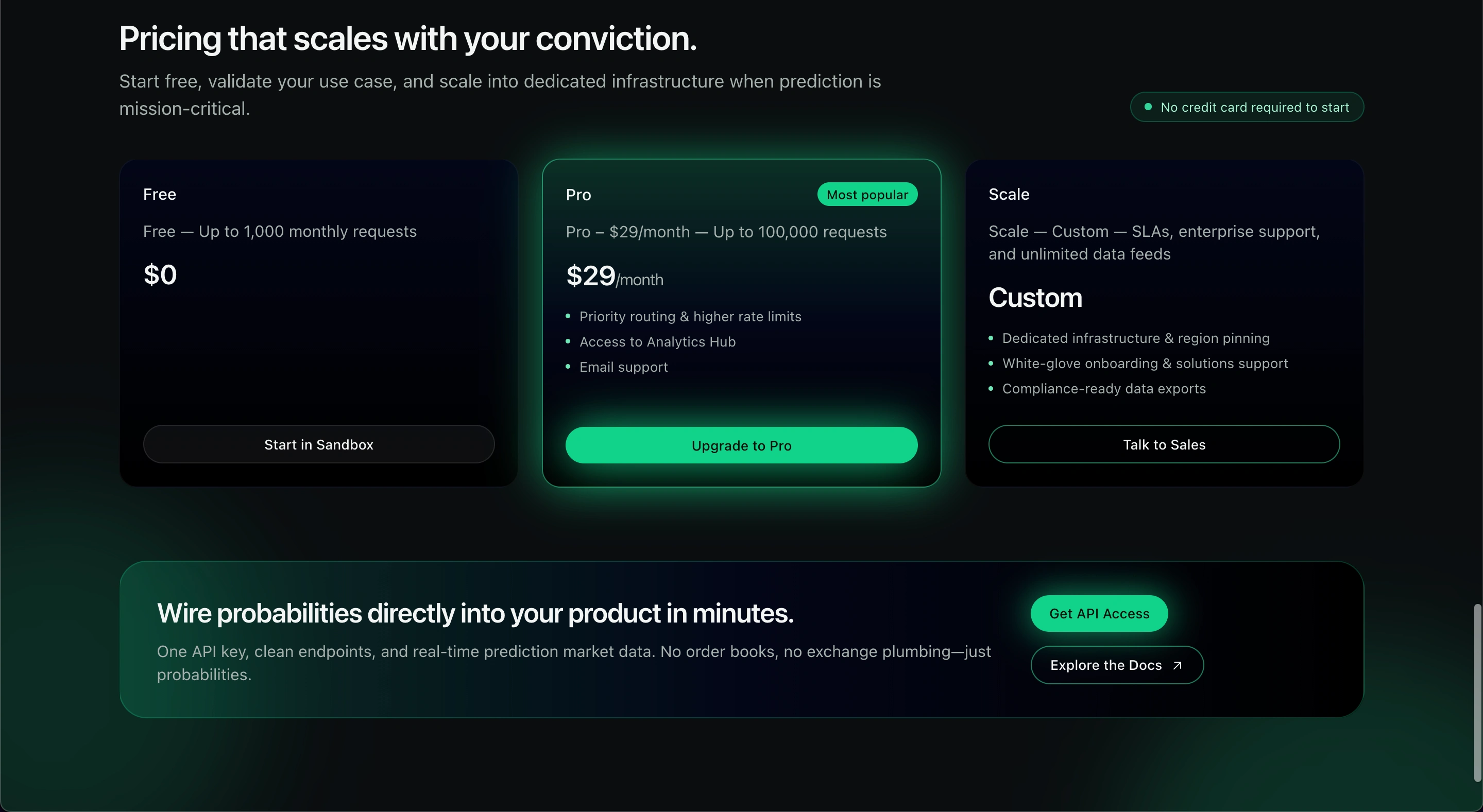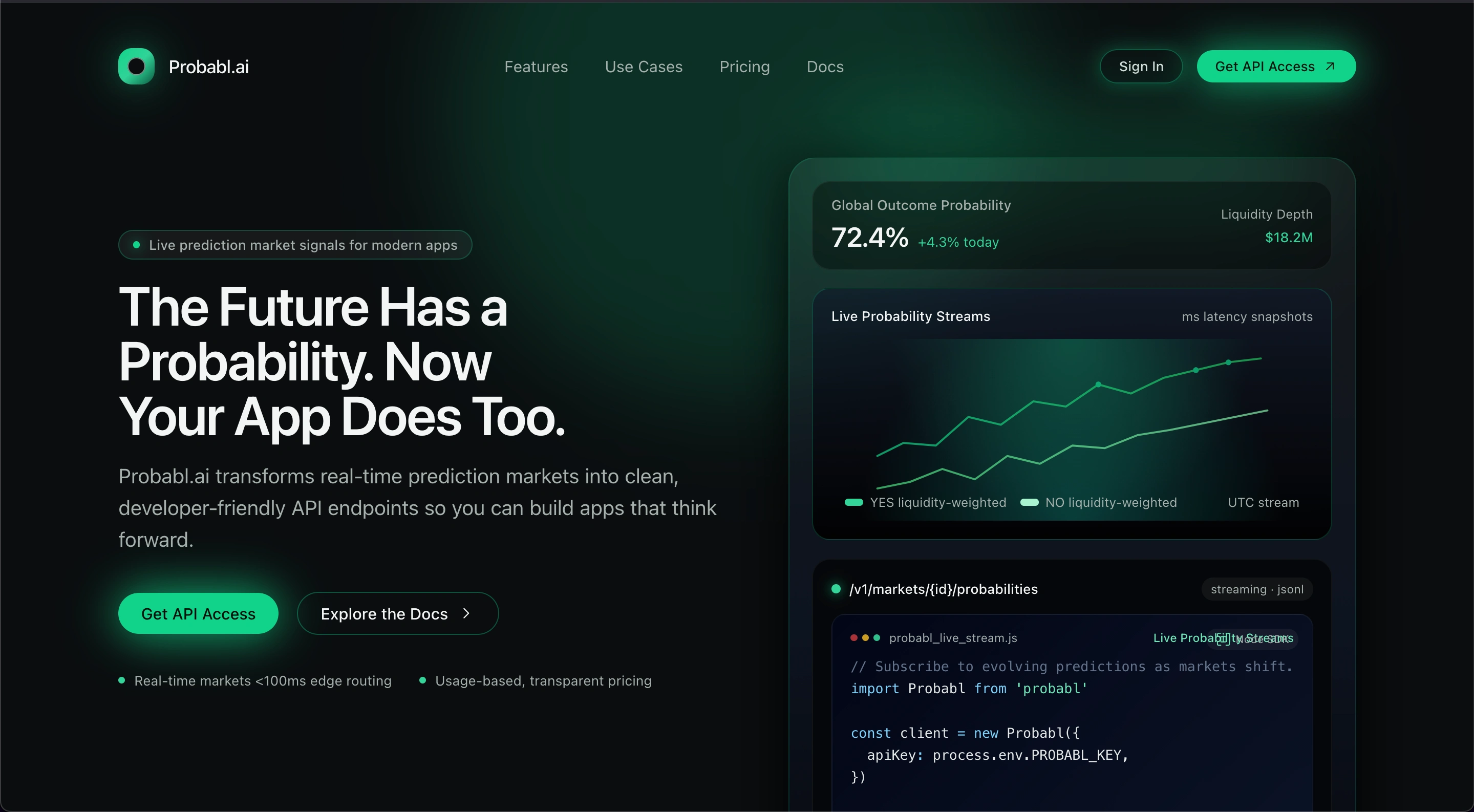 Probabl.ai is a conceptual project for a developer-focused product that provides a real-time prediction market API. The goal is to translate the complex, often noisy data from prediction markets into clean, actionable, and developer-friendly API endpoints. This allows developers to build applications that can leverage the "wisdom of the crowd" to make informed decisions, forecasts, and predictions.