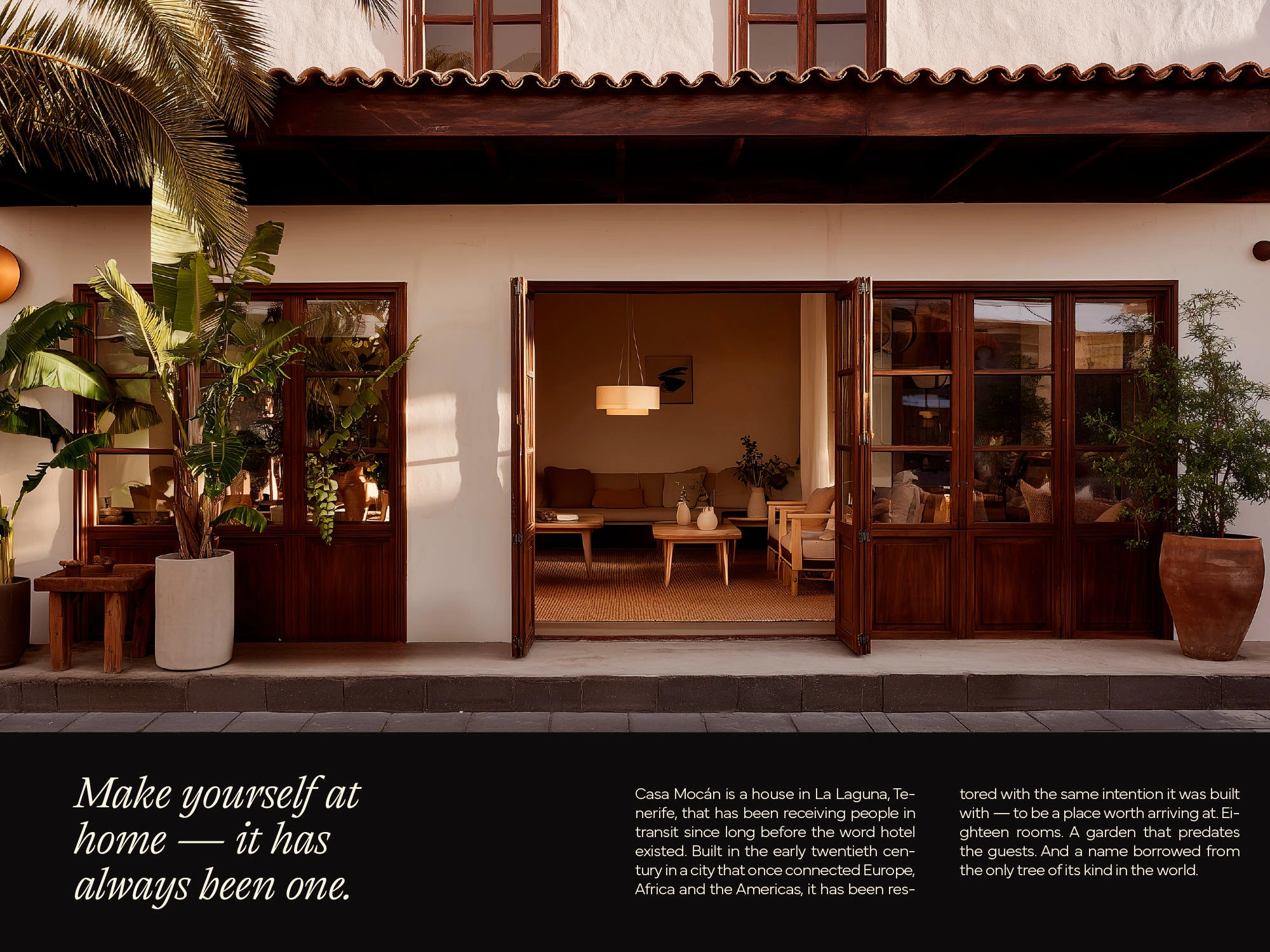 Naming was the first expression. Mocán — the only tree of its genus in the world, endemic to the Canary Islands, with Guanche linguistic origin and documented by British naturalist Francis Masson in 1778 — provided an anchor with absolute singularity, verifiable history and local roots free of every Canarian cliché.