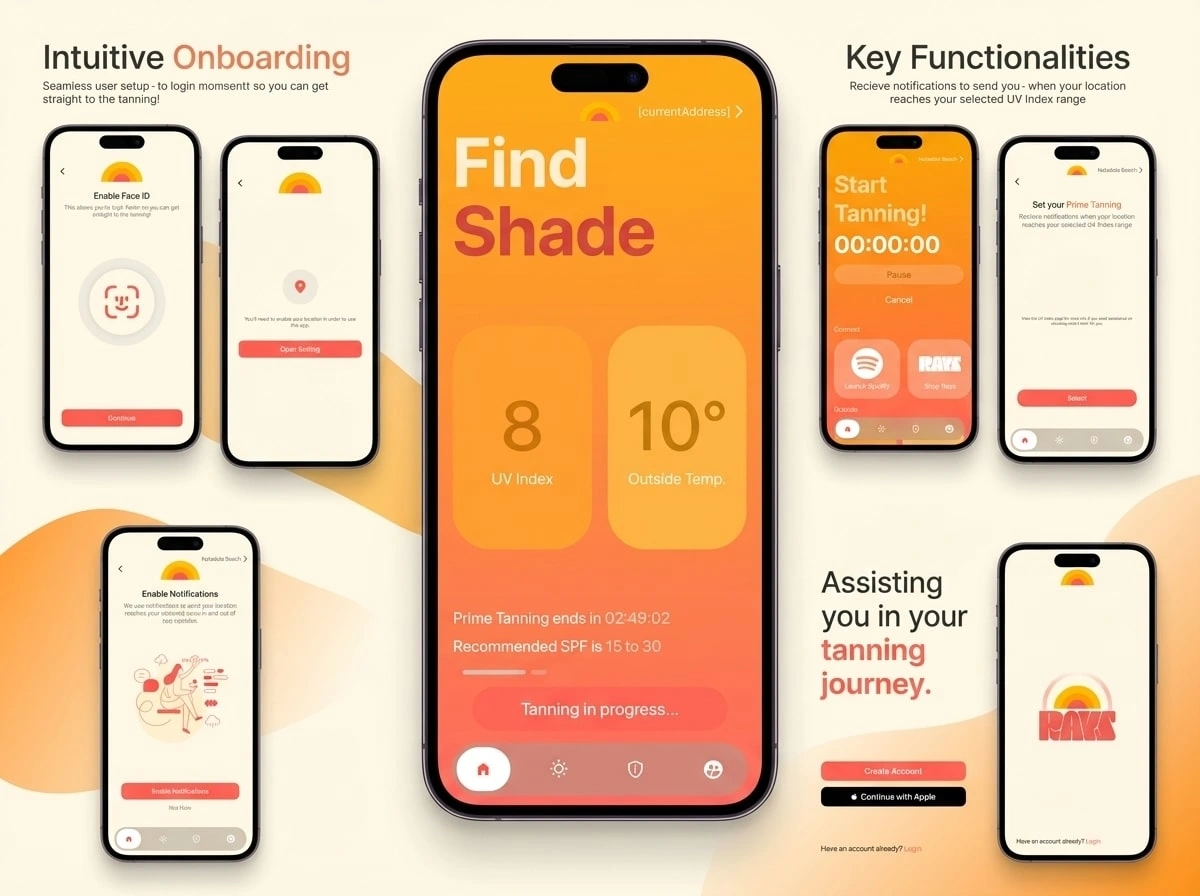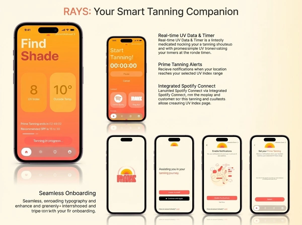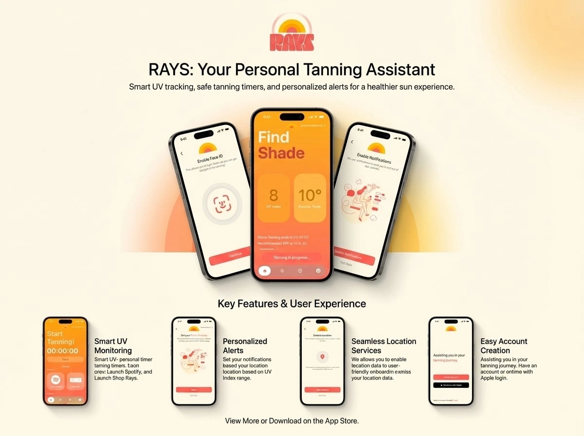 Rays is a mobile app designed to guide users safely and effectively through their tanning journey. By combining personalized recommendations, progress tracking, and interactive animations, Rays helps users achieve their desired tan while maintaining healthy skin habits.