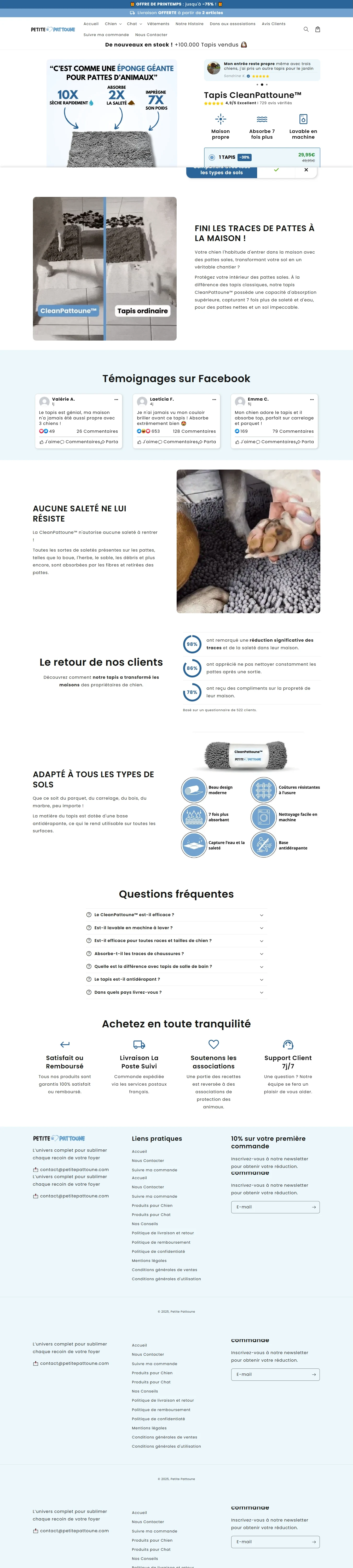 Challenge: Petite Pattoune, an e‑commerce brand in the pet industry, needed an optimized pet product landing page design for their CleanPattoune mat. The goal was to clearly communicate the mat’s benefits—cleaning paws, odor control, comfort—while enhancing trust and driving conversions. The page had to be built in Shopify using Replo for flexibility and scalability.