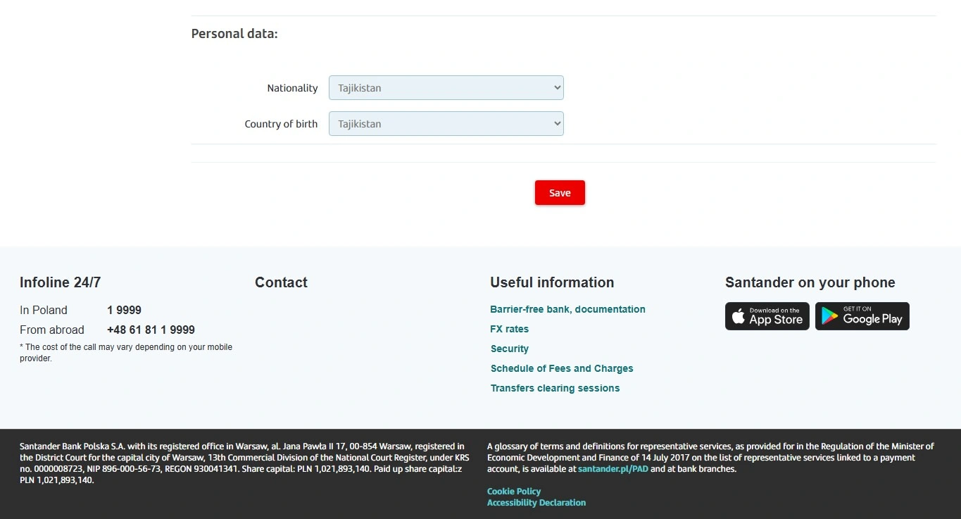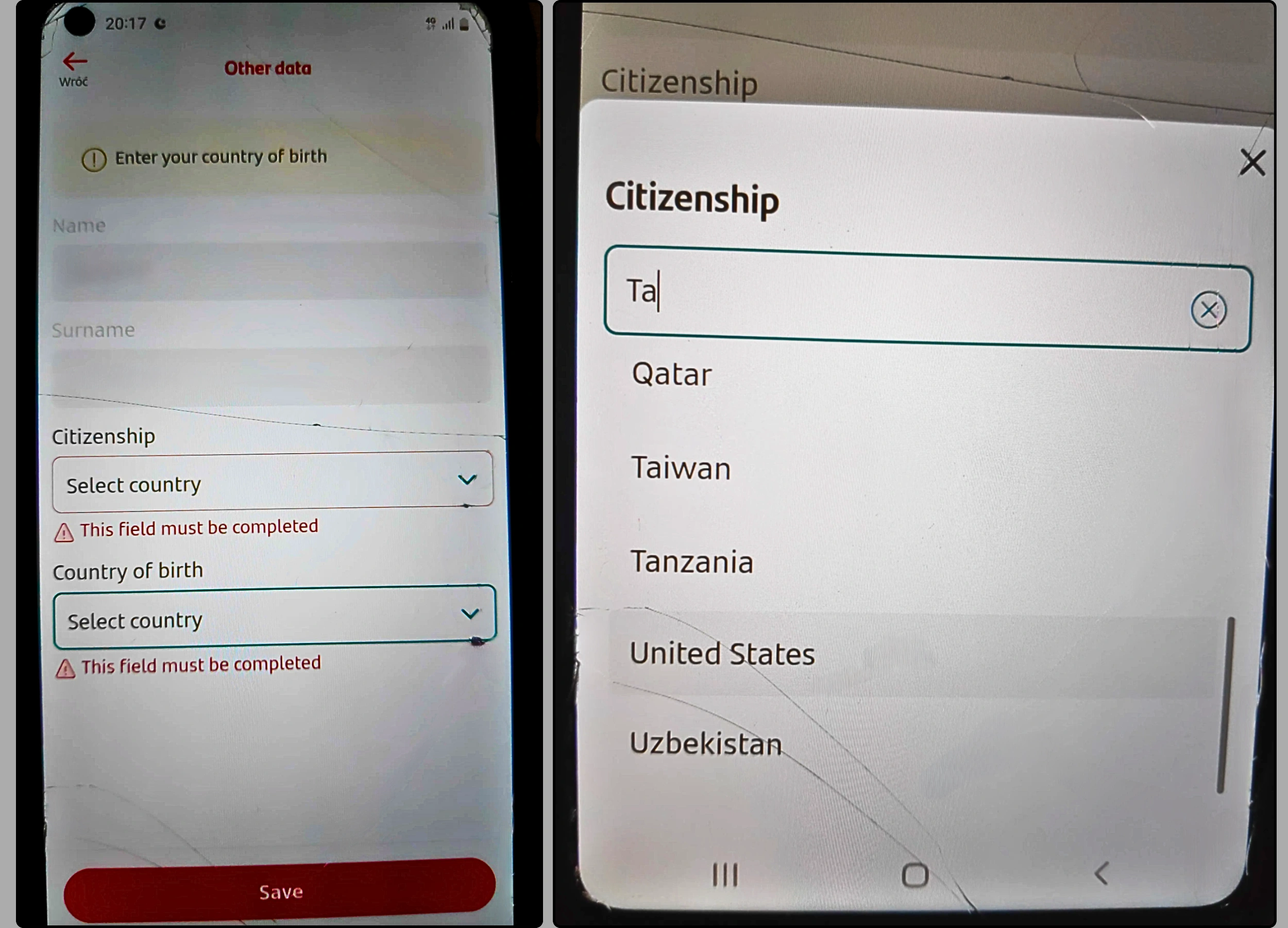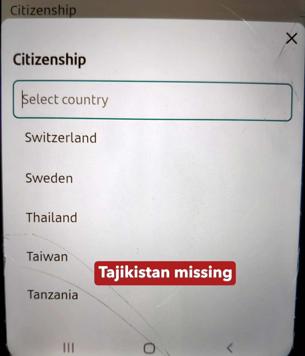 The banking application requires users to keep their 'Citizenship' and 'Country of Birth' data current. However, the mobile dropdown menu fails to index specific countries (e.g., Tajikistan), creating a gap where legitimate users cannot save their profile changes.