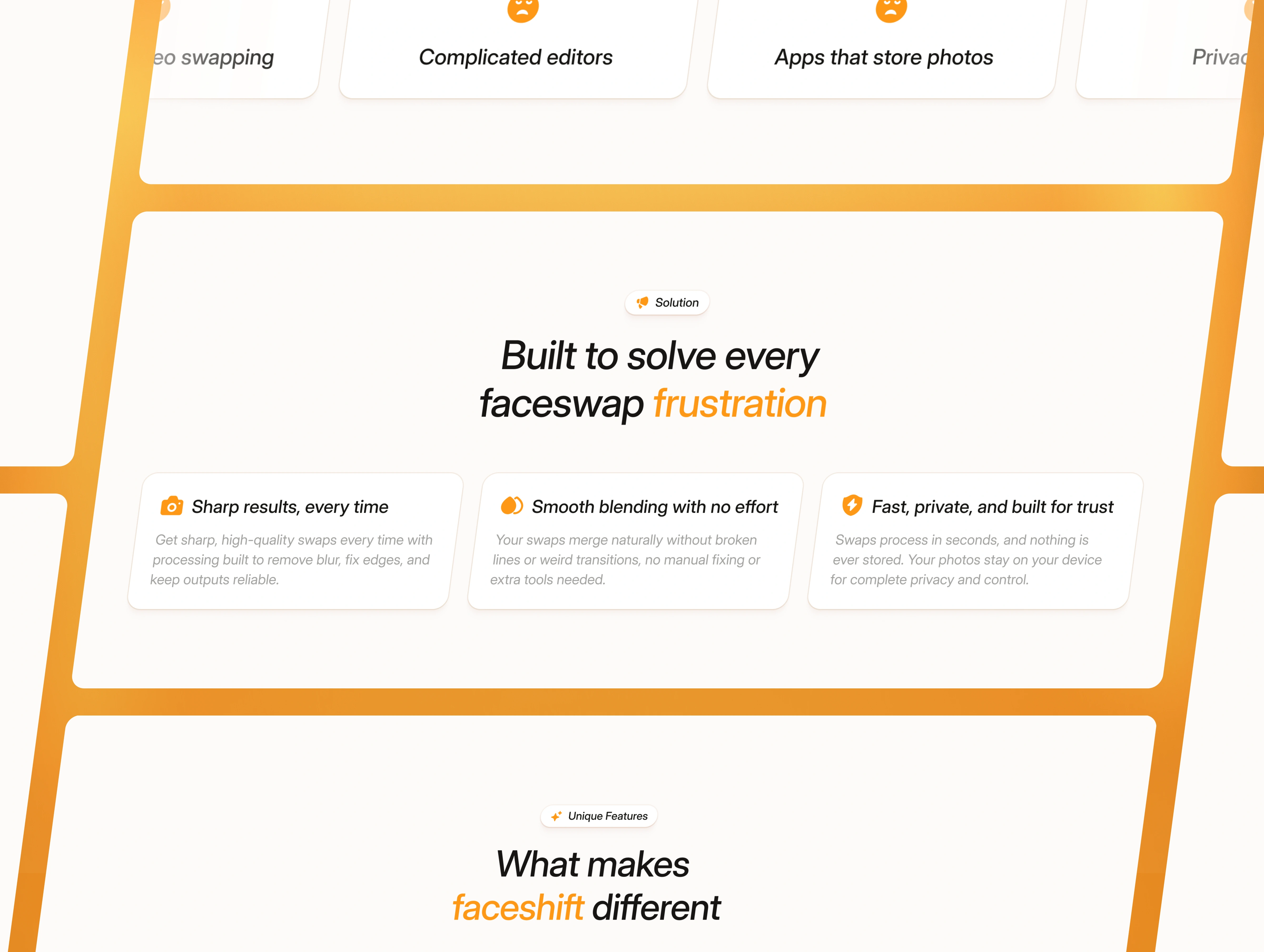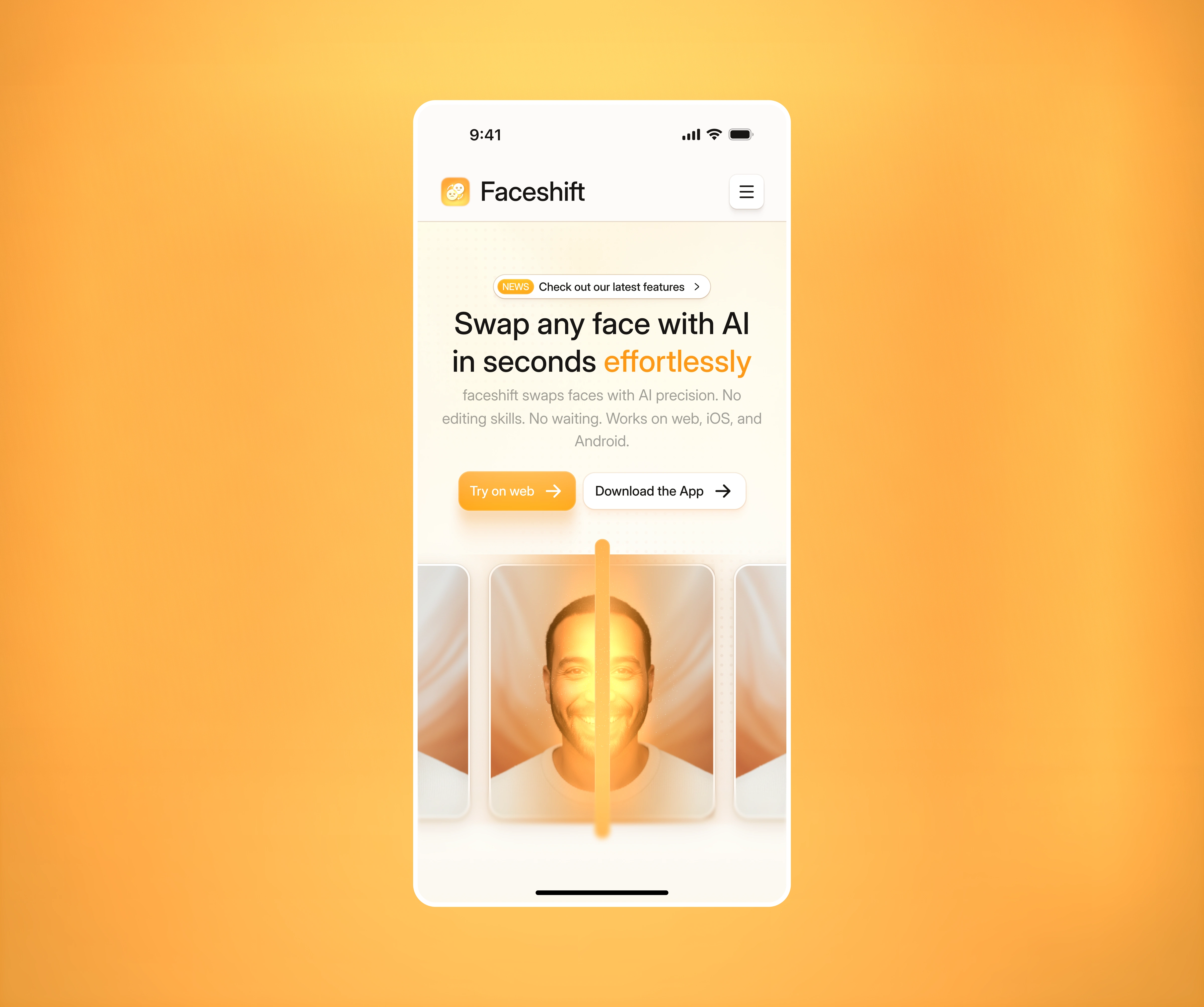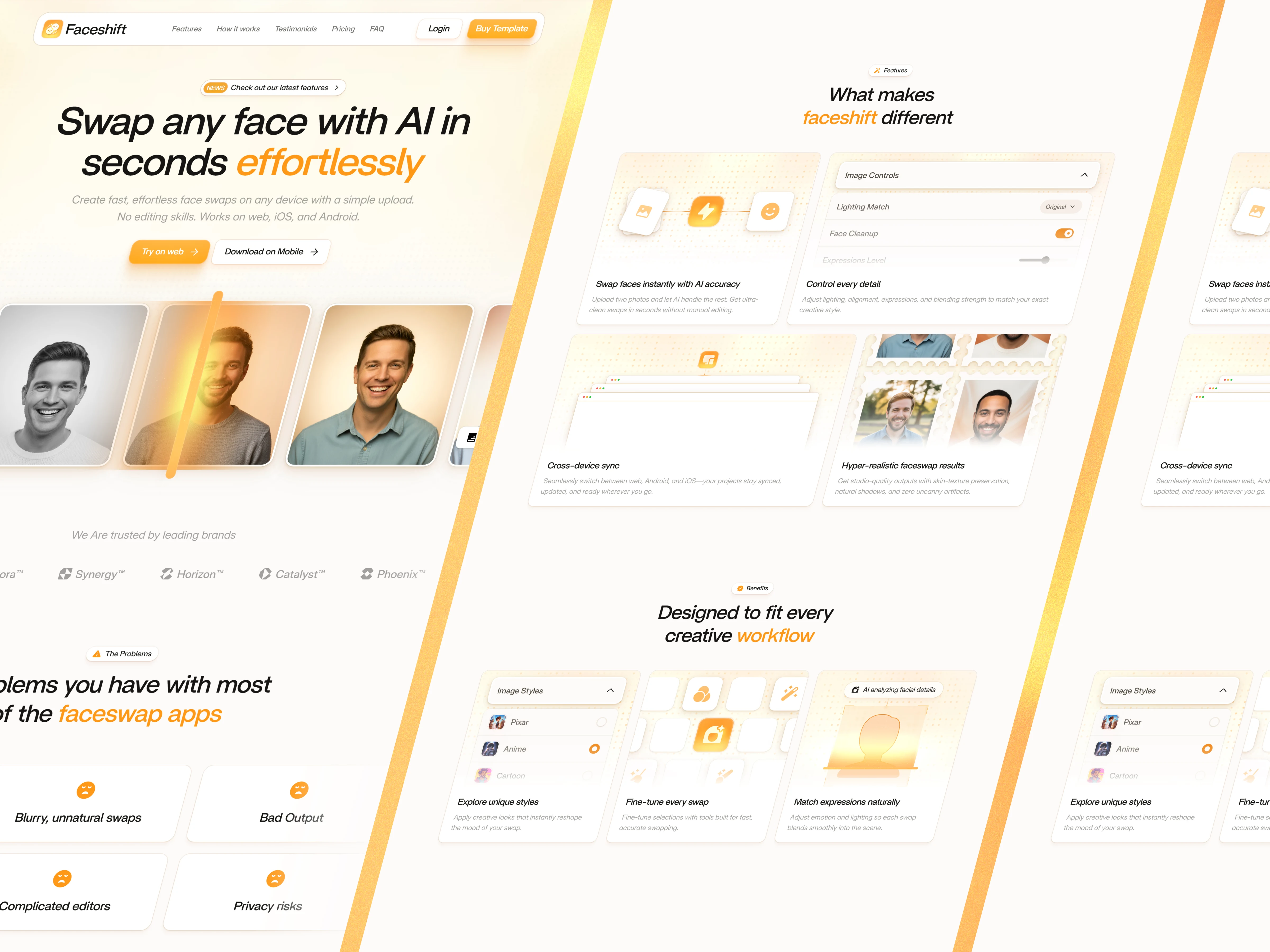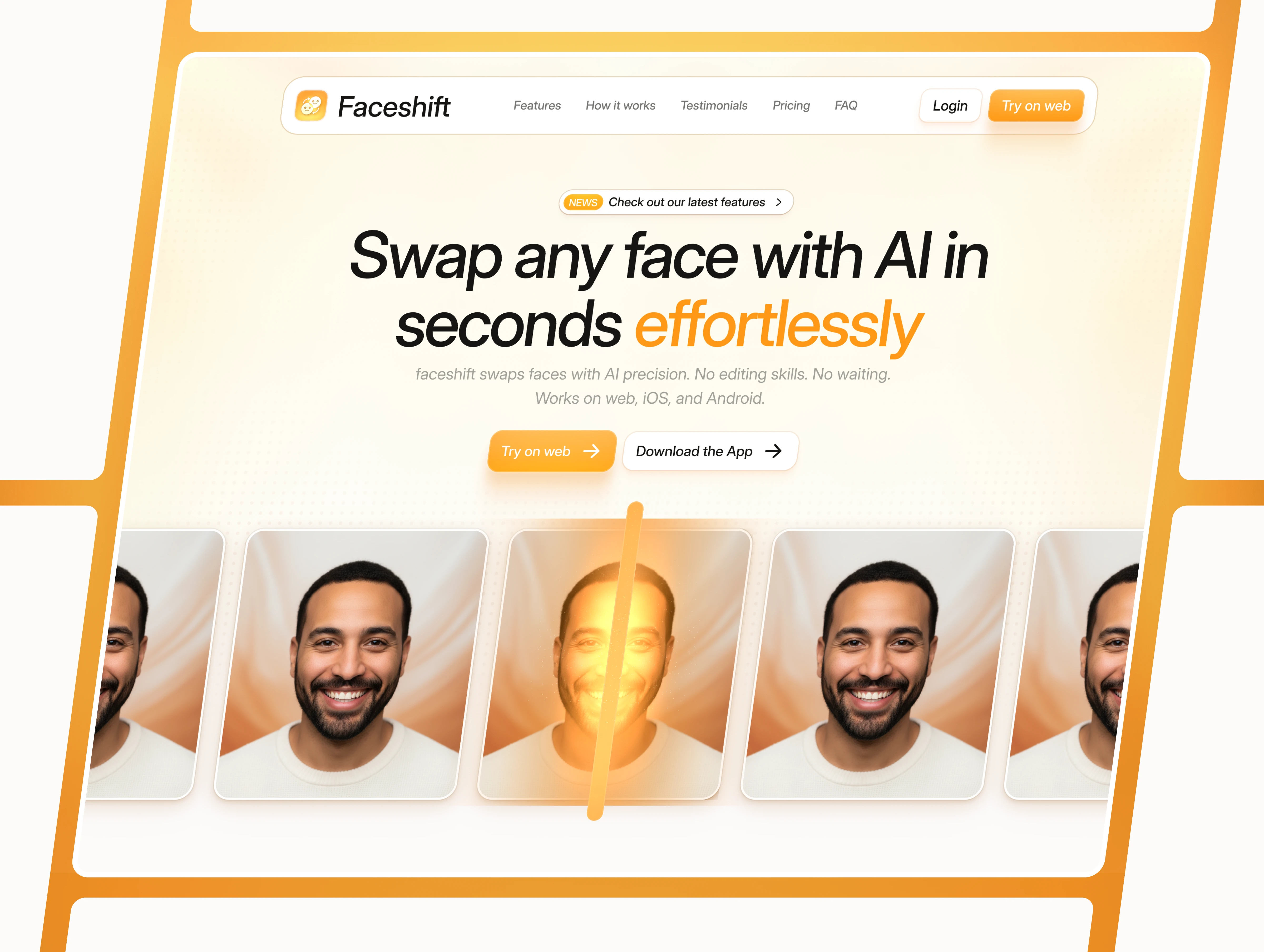 Faceshift is a landing page designed for AI editing apps, face-swap tools, video enhancement platforms, and browser-based editing products.