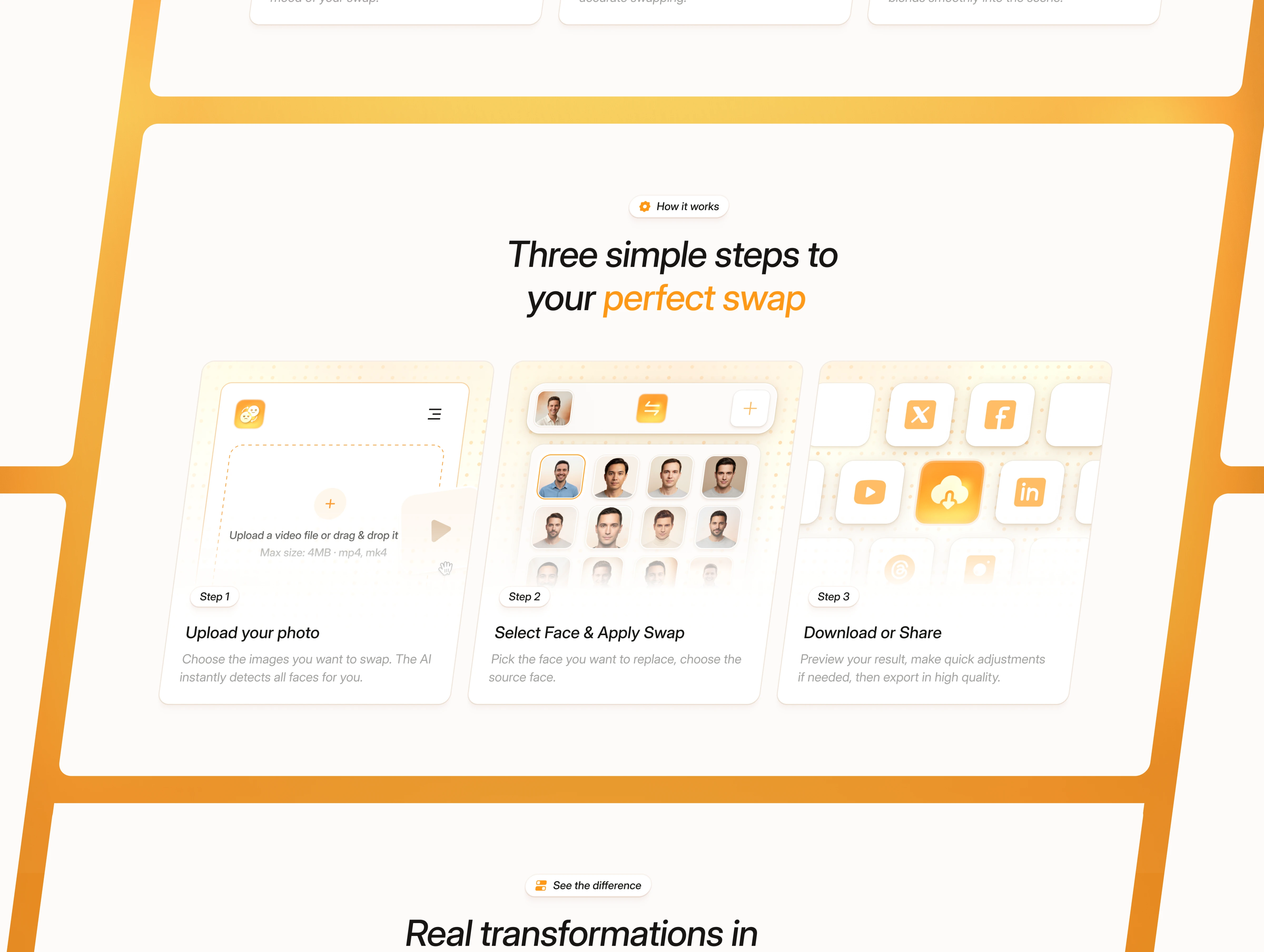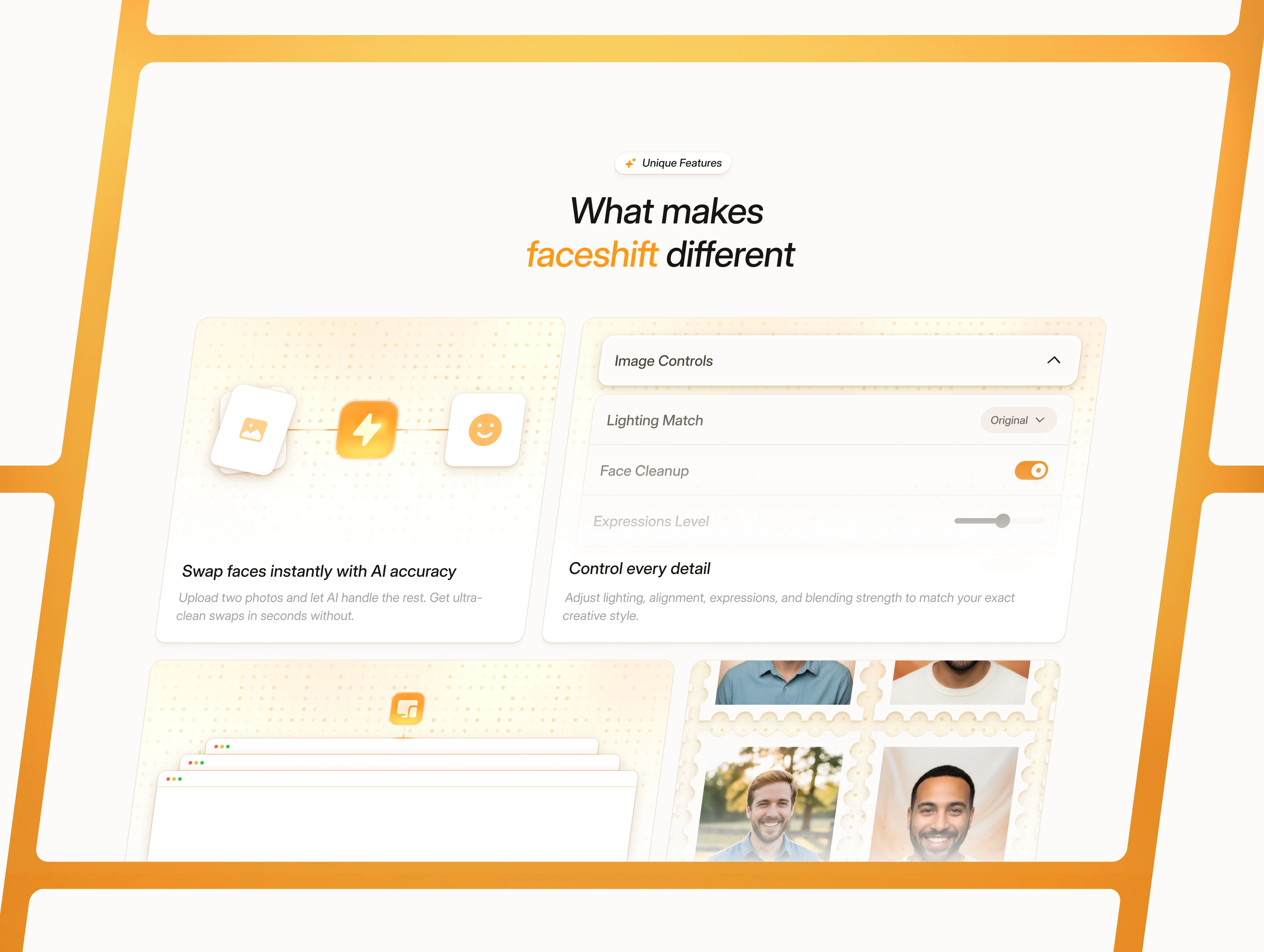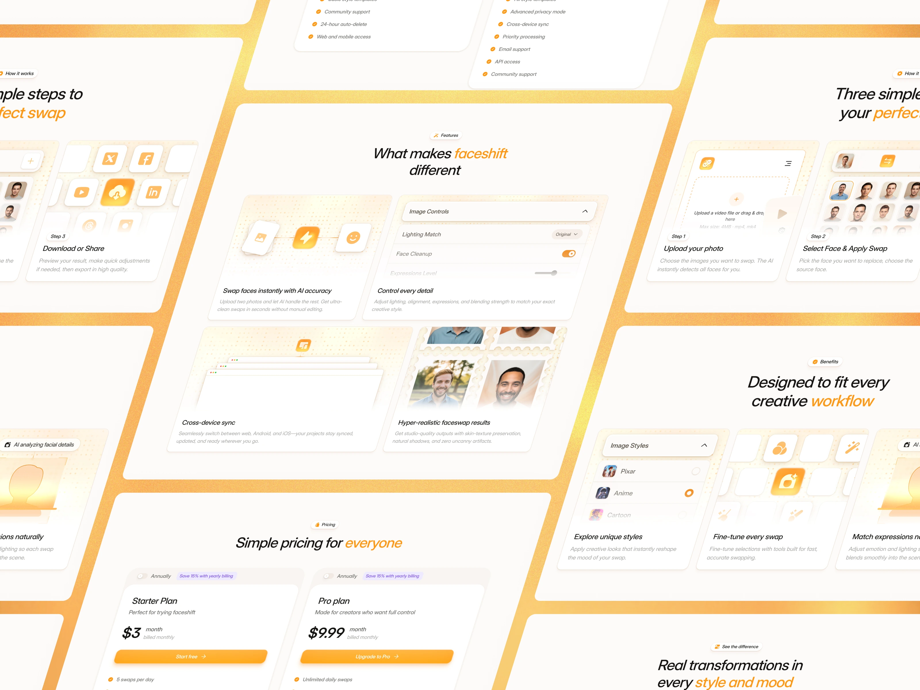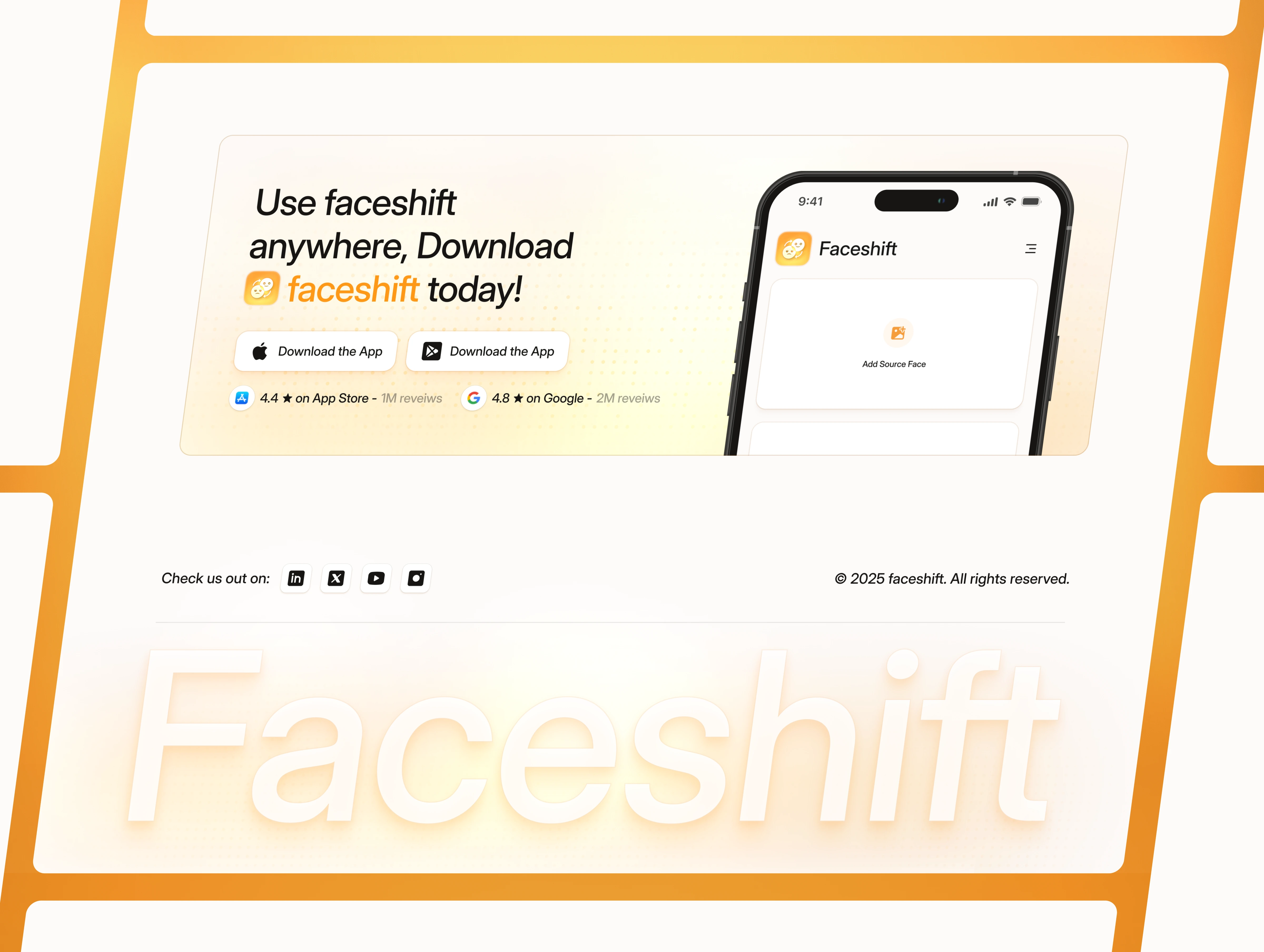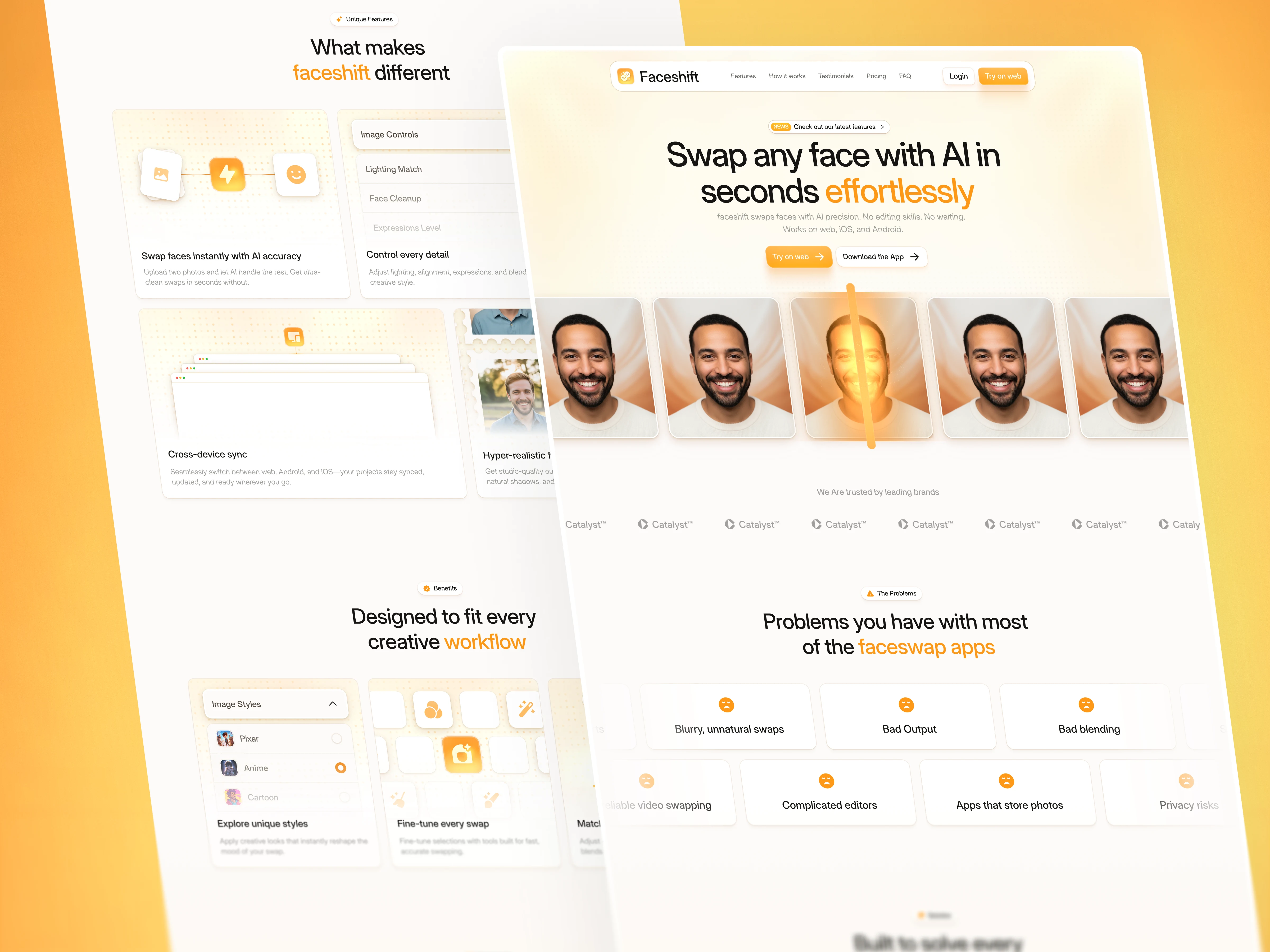 Faceshift is a landing page designed for AI editing apps, face-swap tools, video enhancement platforms, and browser-based editing products.