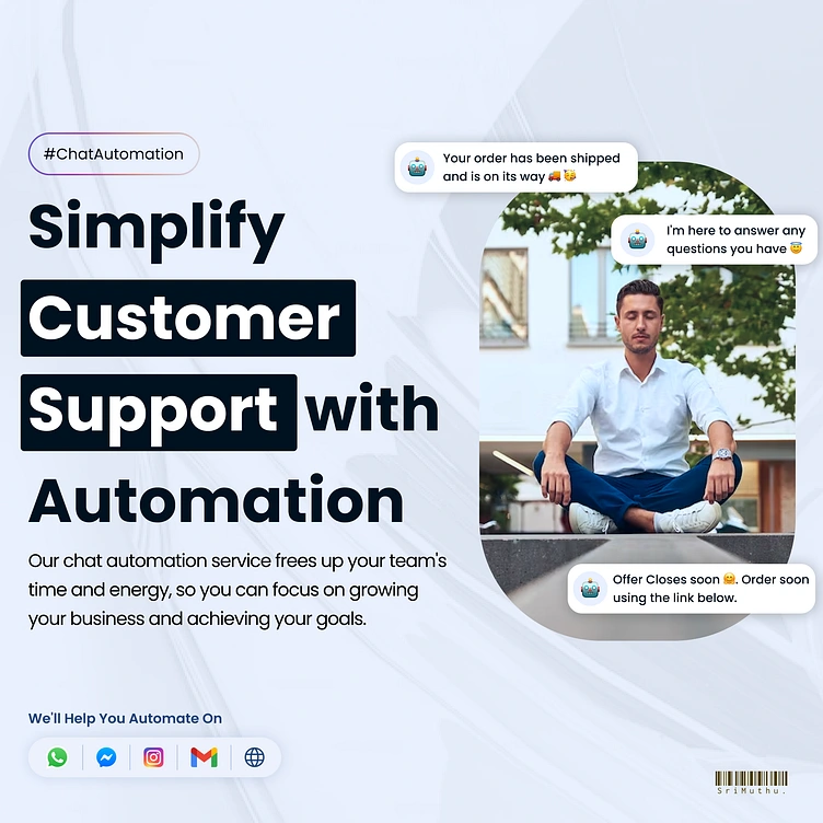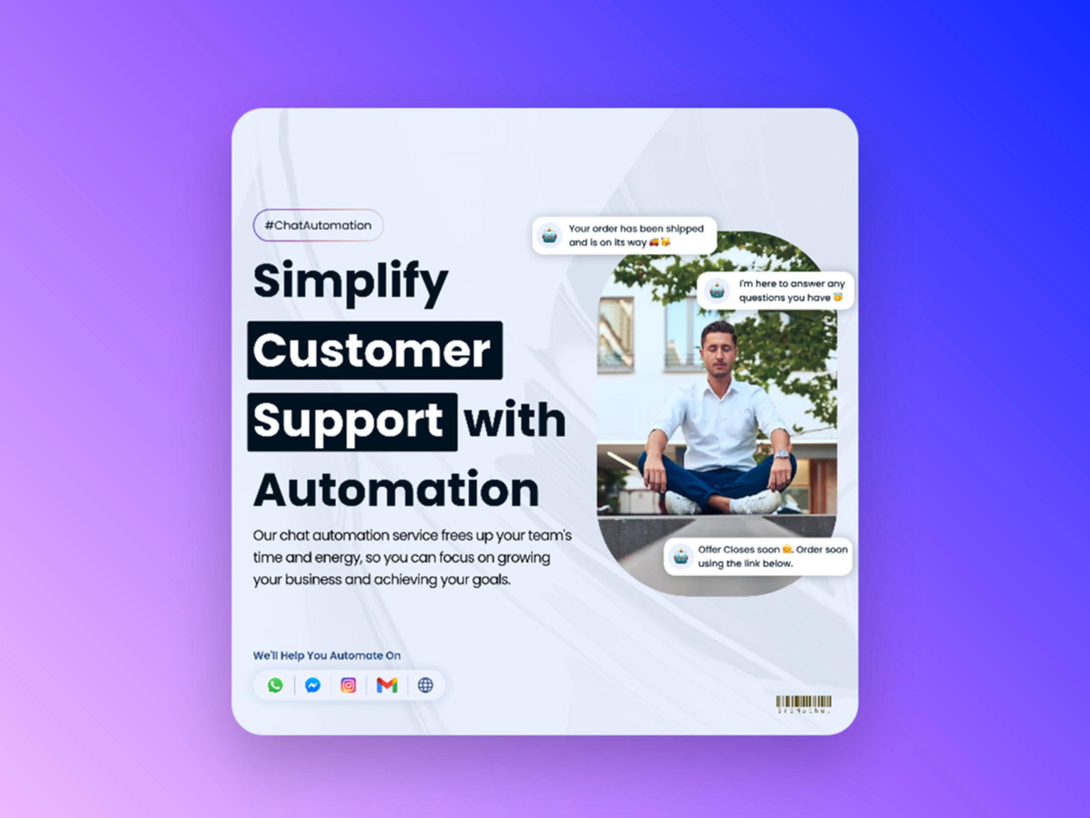 Minimal, vibrant design showcasing chat automation for customer support. Highlights use cases with clean visuals and platform icons for multi-channel support.
