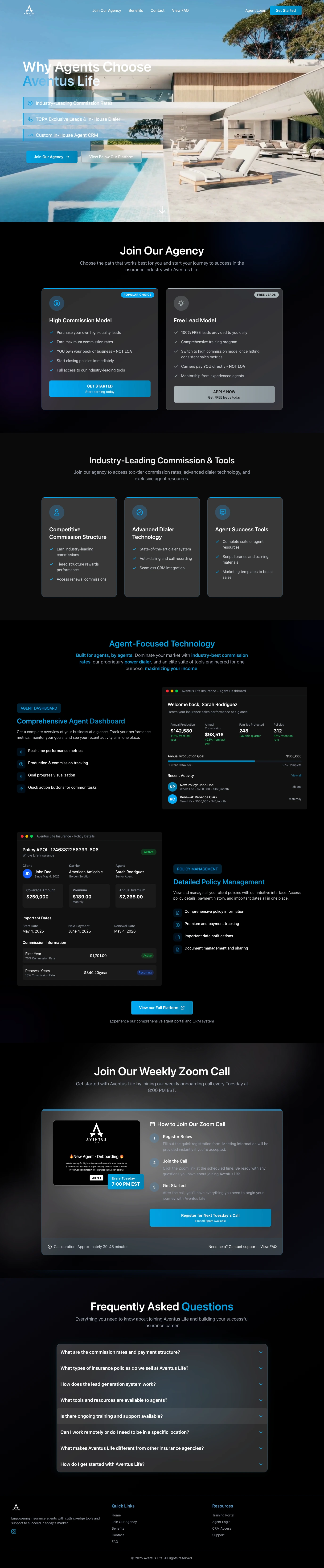 A lead-generation website created for an insurance recruiting platform. Wireframed in Figma and coded quickly in Windsurf, the project focused on agent acquisition with clear commission breakdowns, onboarding steps, and strong call-to-action flows. The site uses a modern UI style and responsive layout, optimized for speed and local SEO. Designed to scale with growth, it functions as both a recruiting funnel and brand credibility hub.