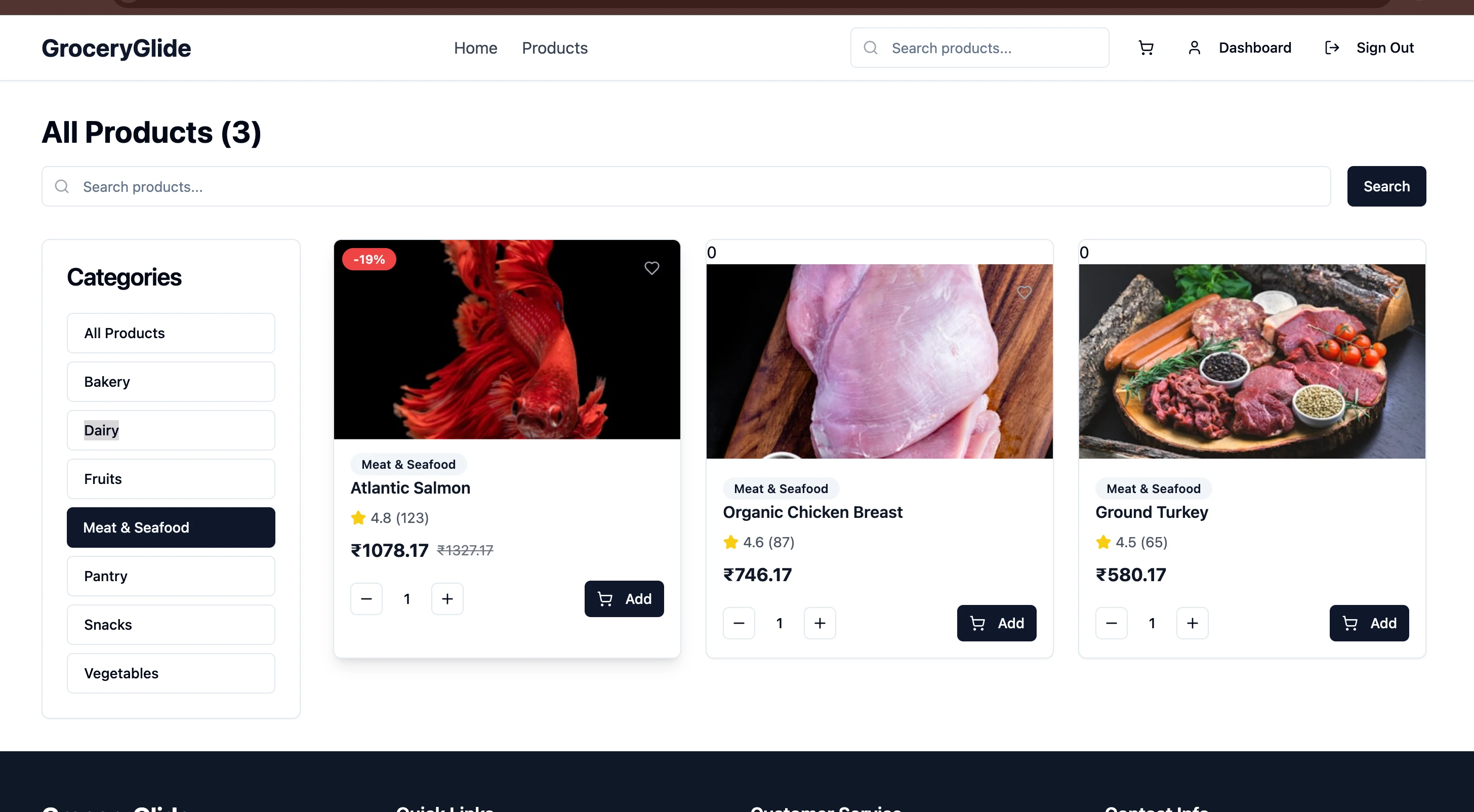 Grocery Glide Market is a full-stack online grocery store where users can browse products, manage a shopping cart, and securely checkout.