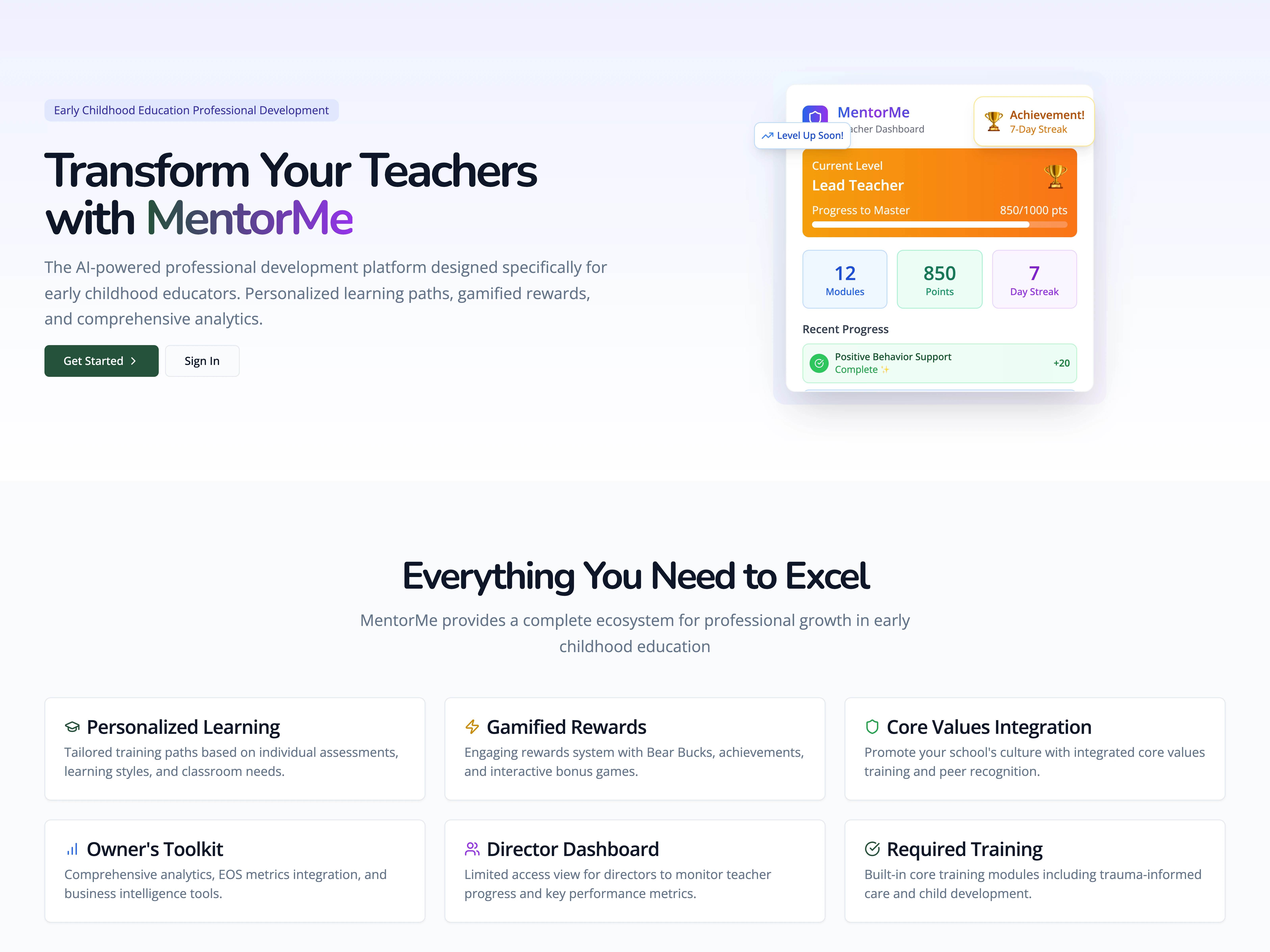 MentorMe is a professional development platform designed specifically for early childhood educators (ECE). The platform combines AI-powered content generation, interactive learning modules, comprehensive assessment systems, and gamification elements to create an engaging educational experience for teachers.