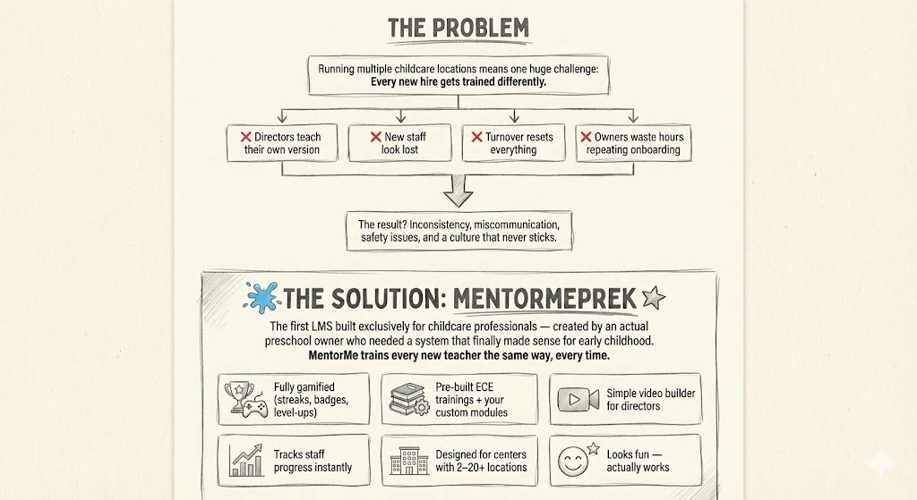 MentorMePreK is a childcare LMS built for preschools and daycares, providing teacher onboarding, compliance training, and multi-location staff training.