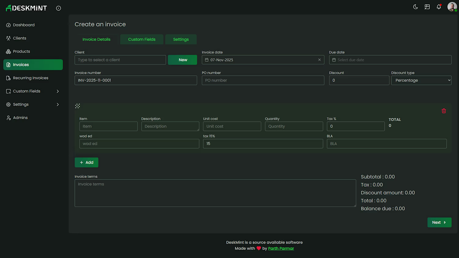 Flexible invoicing with custom taxes, fields, and variable-based numbering